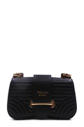 This chic Prada handbag is beautifully crafted of quilted calfskin leather in black. The cross body bag features a gold chain shoulder strap and a flap that opens to a matching interior with a patch pocket.