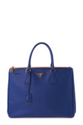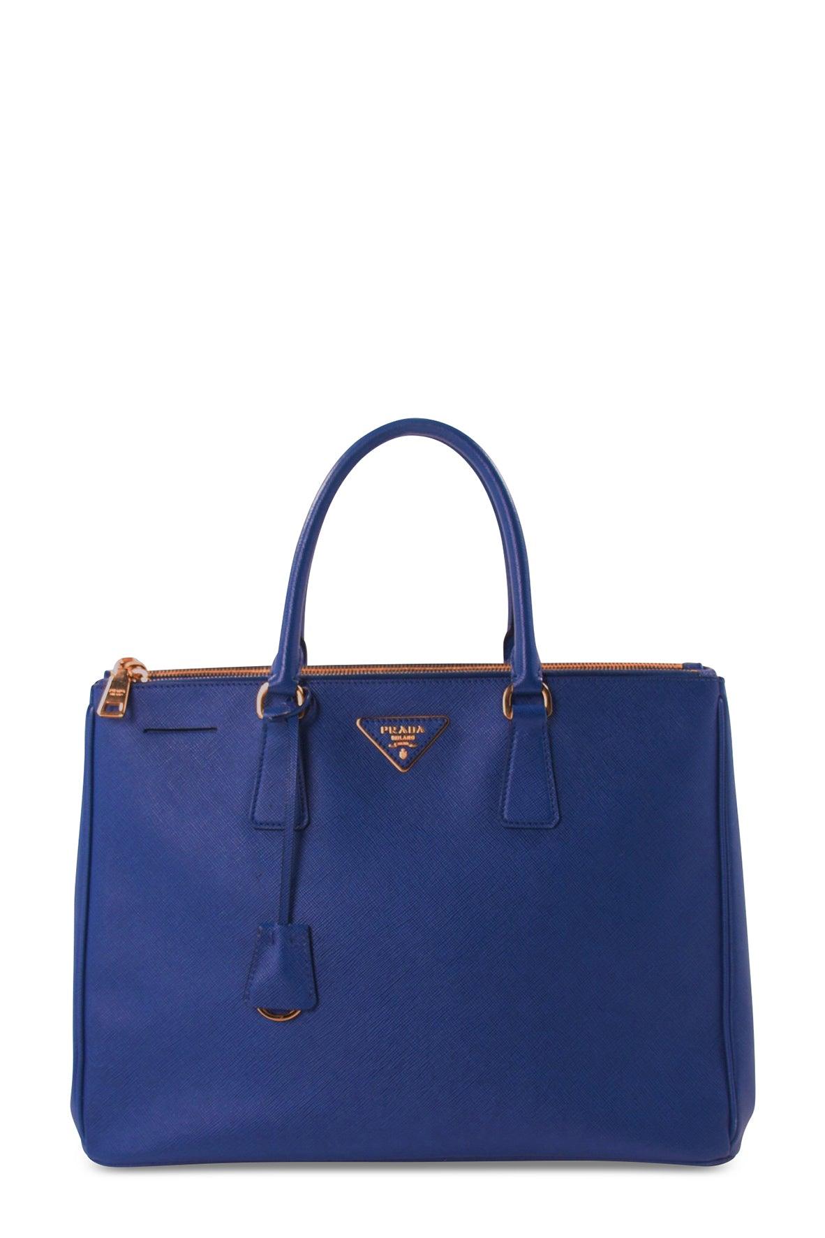 This stylish tote is crafted of Prada signature Saffiano cross-grain leather in blue. The bag features rolled leather top handles with brass handle links, an optional shoulder strap with brass clasps, a double top zipper, and a hanging clochette. The bag features two zippered compartments and an open compartment with an interior of blue Prada logo jacquard with zipper and patch pockets.