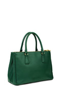 Prada Saffiano Small Double Zip Tote in its signature saffiano calf leather with gold hardware, rolled handles and a detachable, adjustable shoulder strap. Complete with triangle logo with metal lettering at top center.