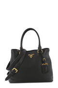 This Prada Shopping Tote Vitello Daino Small, crafted in black vitello daino leather, features dual rolled leather handles, Prada logo at the center, and aged gold-tone hardware. It opens to a black fabric and leather interior with a center zip compartment and zip and slip pockets.