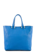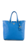 This tote bag from Prada features blue pebbled leather construction with a logo embellishment. Goldtone hardware and double handles complete this stylish designer handbag.