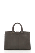 This Saint Laurent Chyc Cabas Tote Leather Small, crafted from gray leather, features Yves Saint Laurent's signature 'Y' top flap hardware piece with magnetic snap closure, dual rolled handles, and gold-tone hardware. Its top zip closure opens to a black fabric interior with side zip and slip pockets.