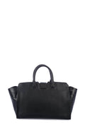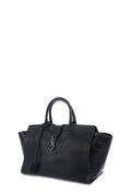 Tubular top handle bag with expandable gusseted side panels, leather encased key ring, interlocking YSL signature buckle closure and removable shoulder strap.
