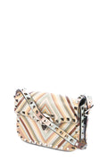 Sage, olive green, brown and multicolor leather Valentino crossbody bag with gold-tone hardware, flat shoulder strap, Rockstud embellishments throughout, sage leather lining, dual interior pockets and pull-through flip-lock closure at front flap.