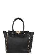 This stunning tote is crafted of textured calfskin leather with light gold pyramid-shaped studs on the borders of the bag. The top opens with a light gold studded switch lock to a spacious interior. This is an exquisite bag with superb craftsmanship and iconic style only from Valentino!