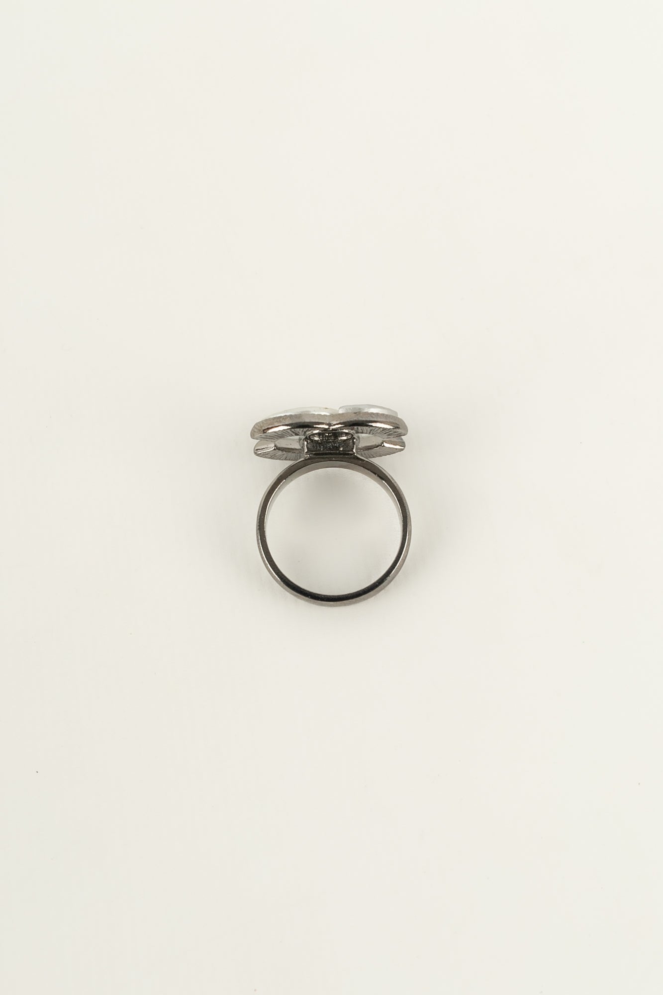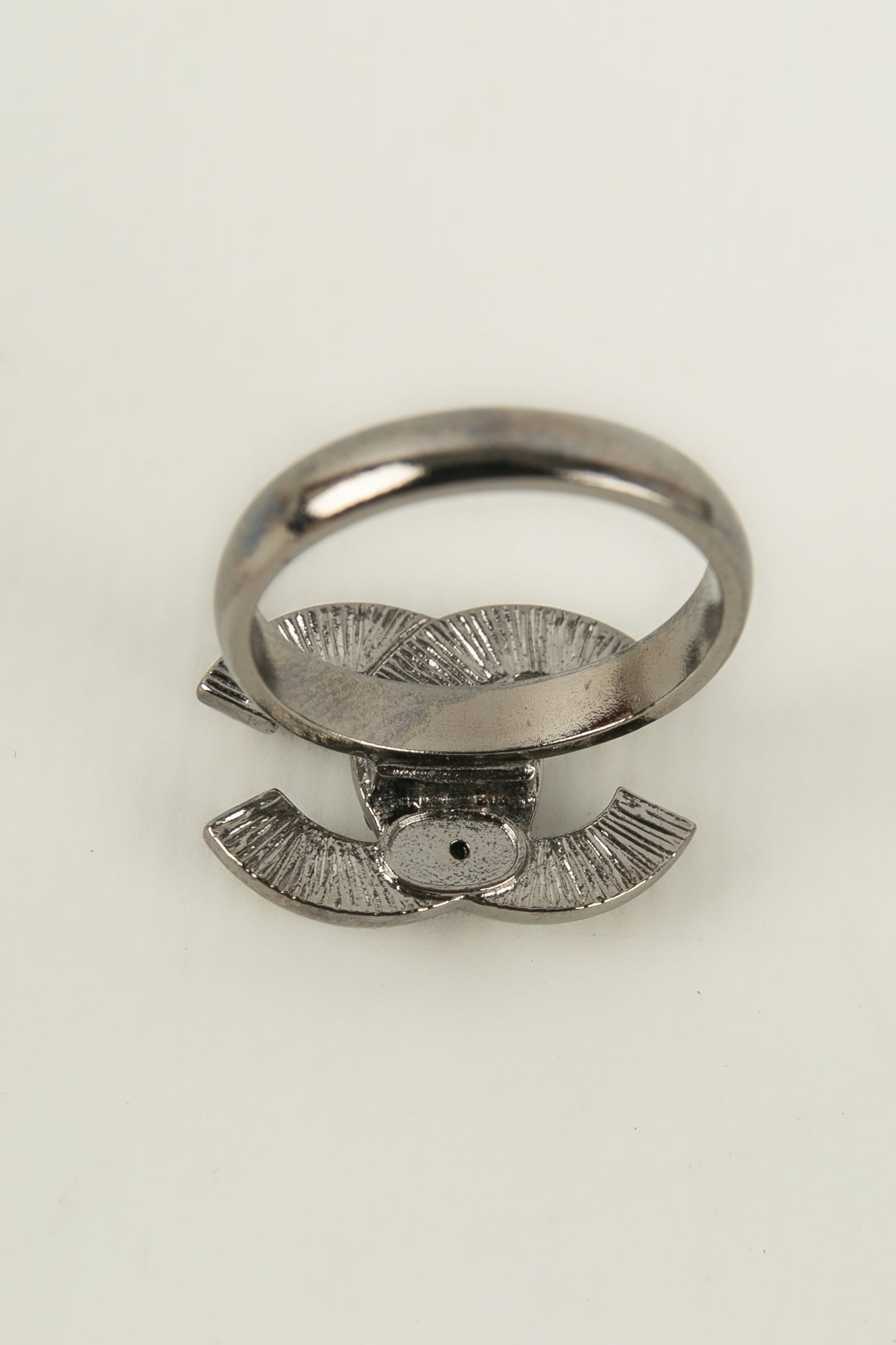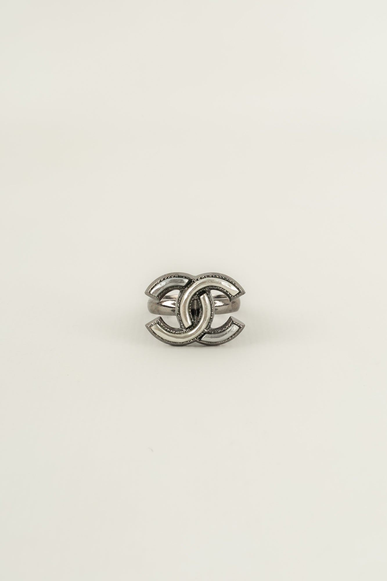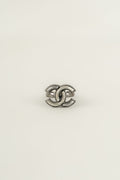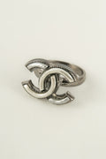 CHANEL -Bague en m�tal argent� surmont�e d'un logo cc. Bijou non sign� issu des ventes priv�es.