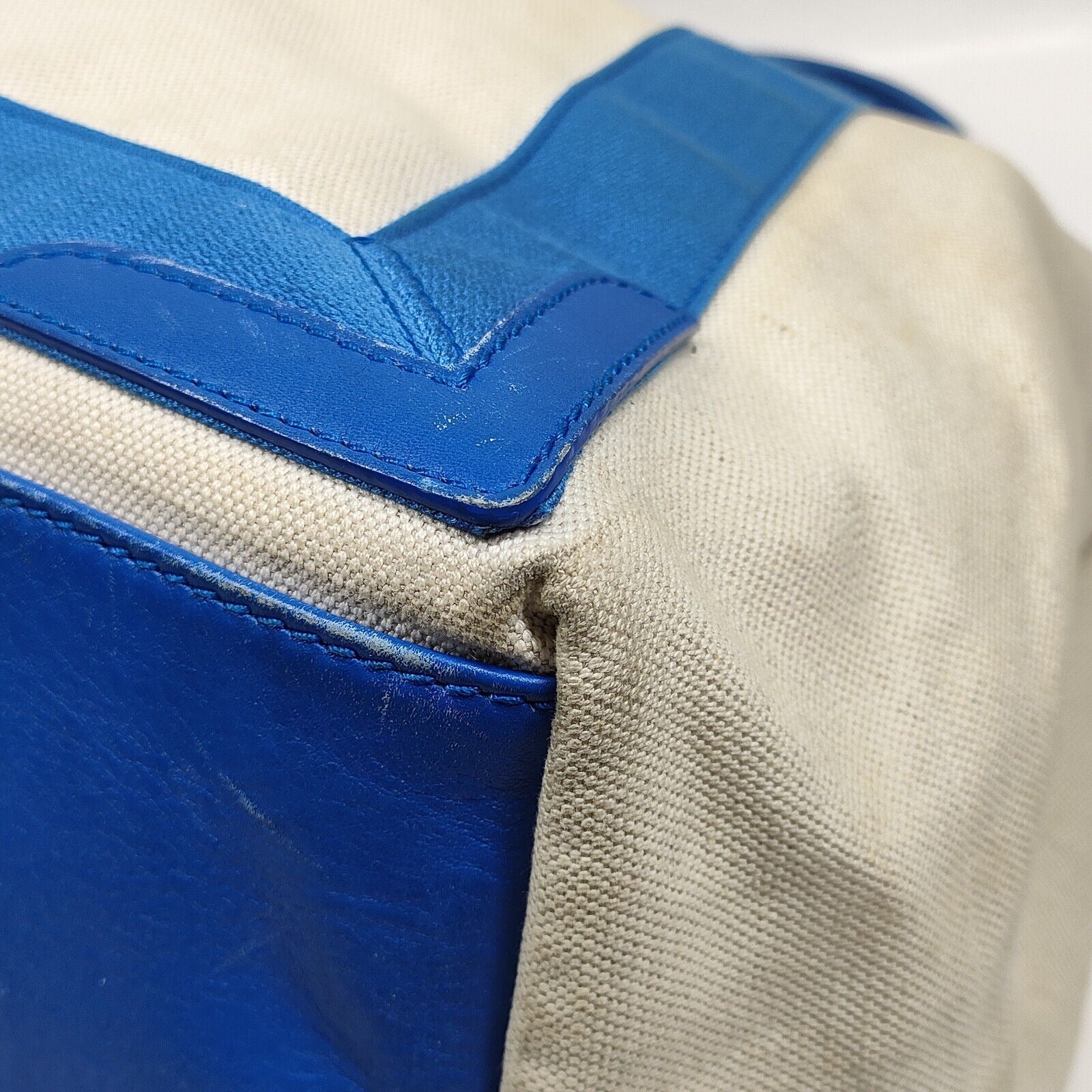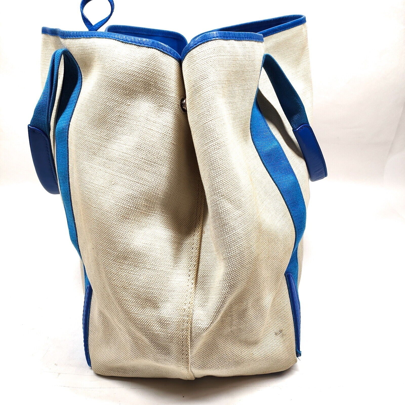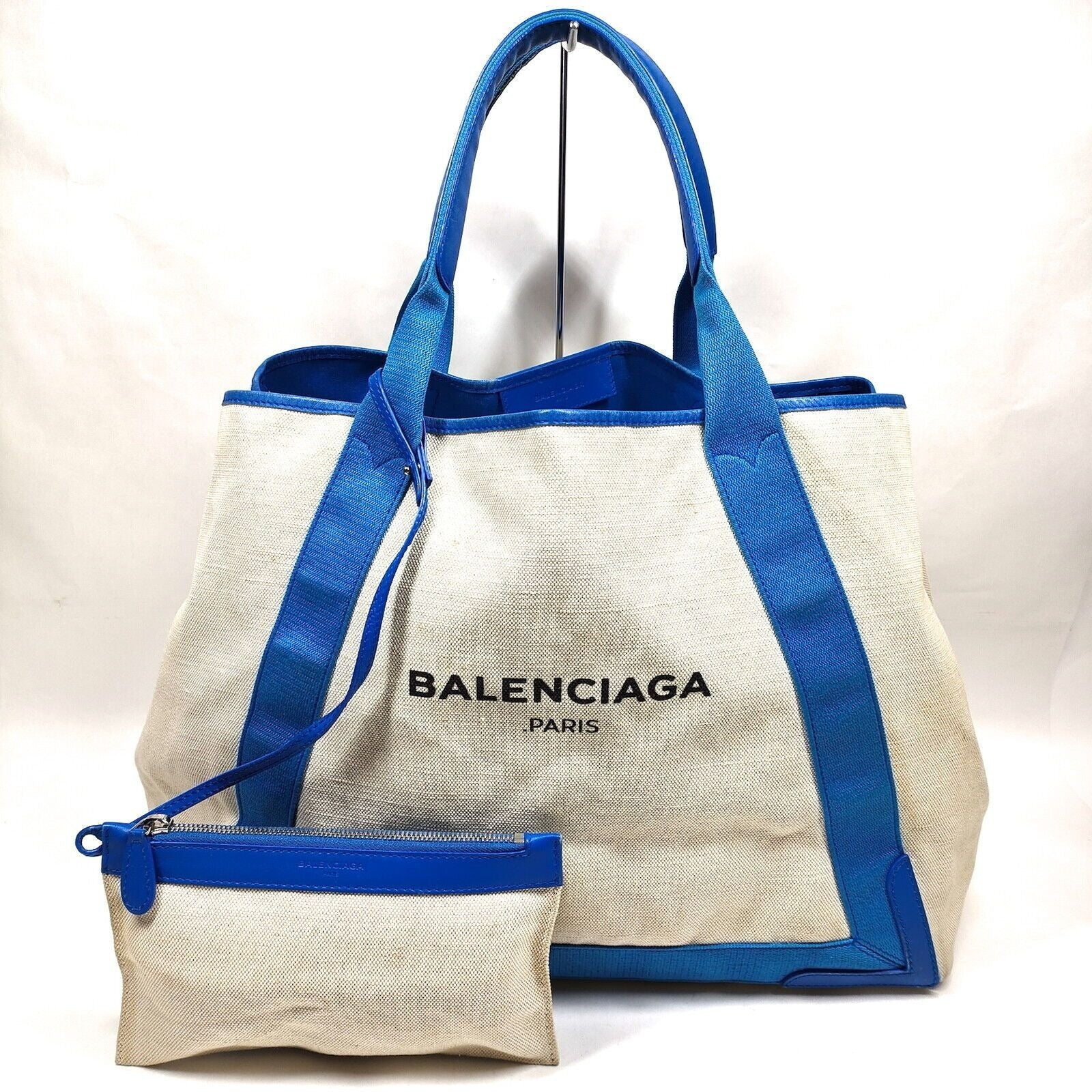 This is a fabulous, lightly used Balenciaga, 'Cabas' tote bag! The bag has a tapered shape and is made of a turquoise or royal blue leather (I think they are calling navy) and canvas with XL Balenciaga Paris logo on one side in black. There are two hard leather handles, a leather bottom, an attached wallet, and magnetic snaps on both sides to allow the purse to expand.