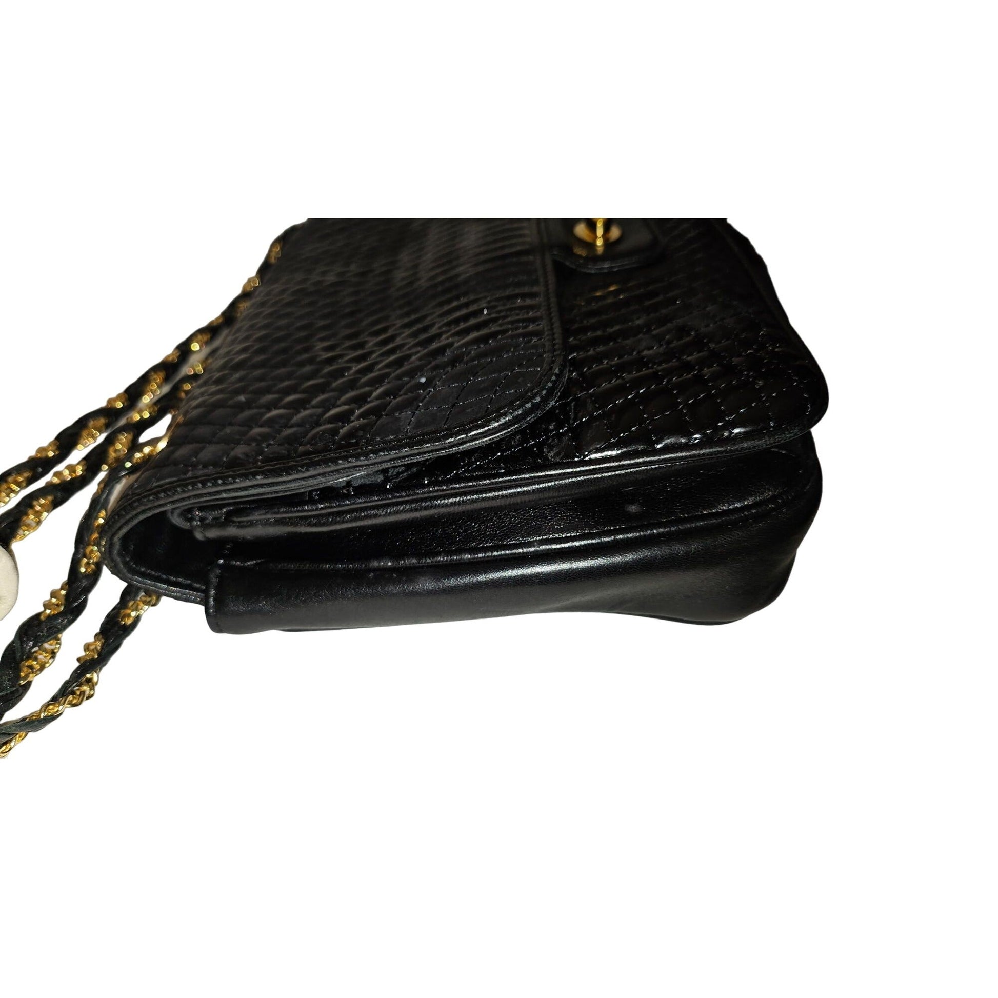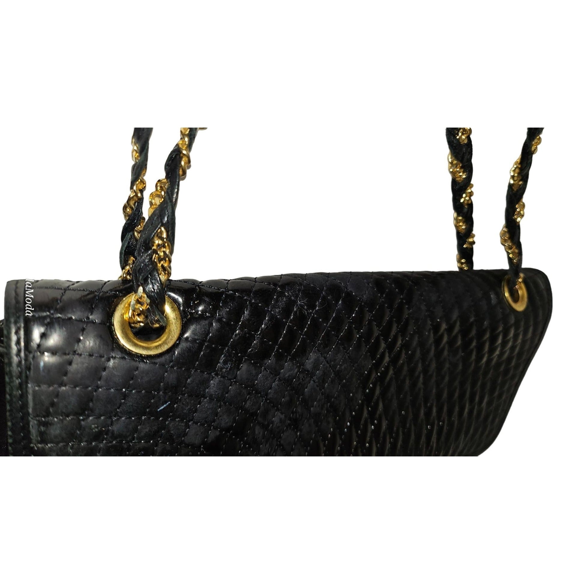It has a dual flap style with two compartments and a zip close pocket in the very clean, black leather interior. It has a removable gold chain& leather, long shoulder strap that attaches with a gold, B shaped, lobster claw type clasp - this is a totally versatile purse! The interior has a gold plaque that reads 'Bally, Made in Italy'.