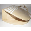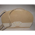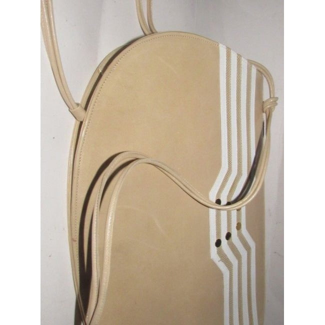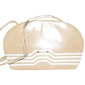 This is a fabulous, BALLY, leather, shoulder bag that has an oval shaped, structured design and a dual top snap closure! It is made of beige glossy leather with white geometric stripes in a linear Art Deco design on the front with brass studs. The body is expandable and it can hold more than you might think!