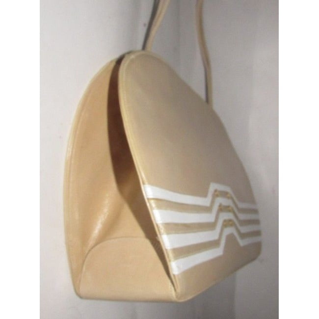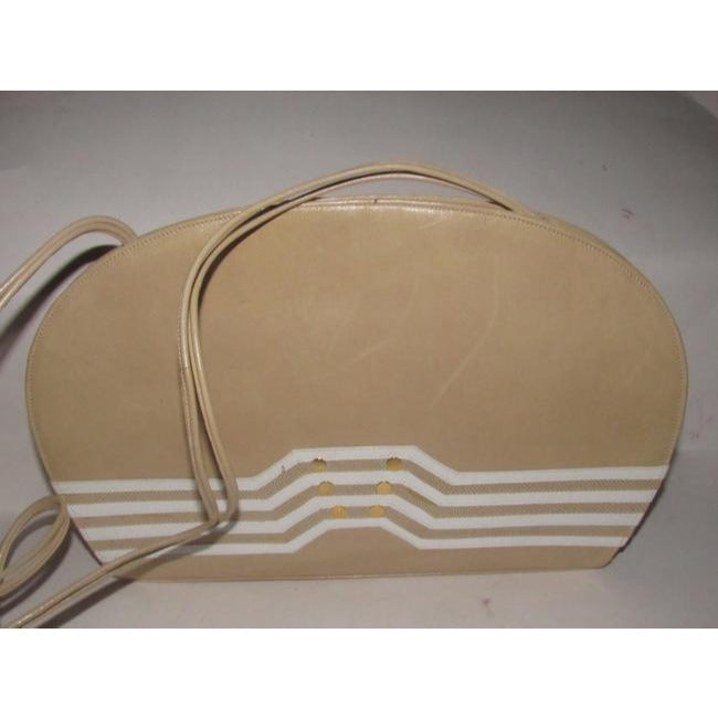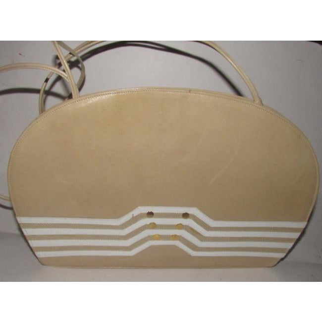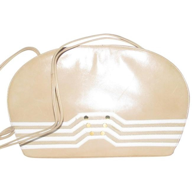 * For sale is a mod style, Bally, unusual, top snap, glossy beige leather, color block style, two way style- cutch or shoulder bag style with white geometric stripes, brass stud, a dual snap top, and a removable, dual shoulder strap! This is a unique, Avant-garde, vintage purse which draws from many vintage styles to give it an edgy modern look!