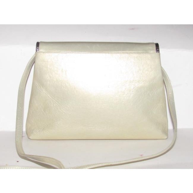 This is a fabulous, BALLY, glossy leather, two-way clutch or shoulder bag that is an unusual shape with an envelope snap top! It is made of greenish gold leather with silver striped accents and a 1950's or 1960's retro, design on the envelope top. It has a matching suede interior and one main compartments and one zip pocket inside. There is lots of room for everyday or more than enough if you are traveling light for a special occasion! This purse is perfect for any time of year! The strap is removable to create a clutch so it is like getting two purses for the price of one!