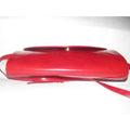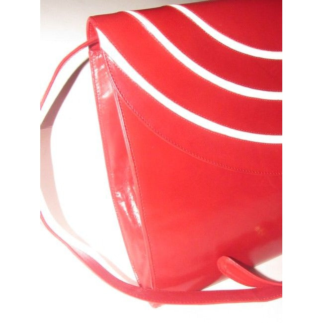 This is a fabulous, BALLY, glossy leather, two-way clutch or shoulder bag that is an unusual shape with an envelope snap top! It is made of red leather with white striped accents with a 1950's or 1960's retro, design on the envelope top. It has a black interior and one main compartments and one zip pocket inside. There is lots of room for everyday or more than enough if you are traveling light for a special occasion! This purse is perfect for any time of year! The strap is removable to create a clutch so it is like getting two purses for the price of one!