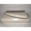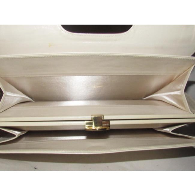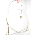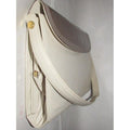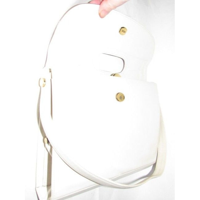 This is a perfect everyday bag style from Bally that is completely unique! It is a medium sized shoulder bag with a super soft ivory leather body and darker taupe, snap close, envelope top with and oval cut-out in the center! It has gold hardware and a leather strap that cannot be adjusted.