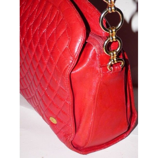 For sale is a vintage, unique, AMAZING, Bally, diamond design, quilted true red leather, satchel style, shoulder purse with bold, gold chain accent and leather strap and multiple compartments! It is a unique style from Bally that is still completely fashionable today!