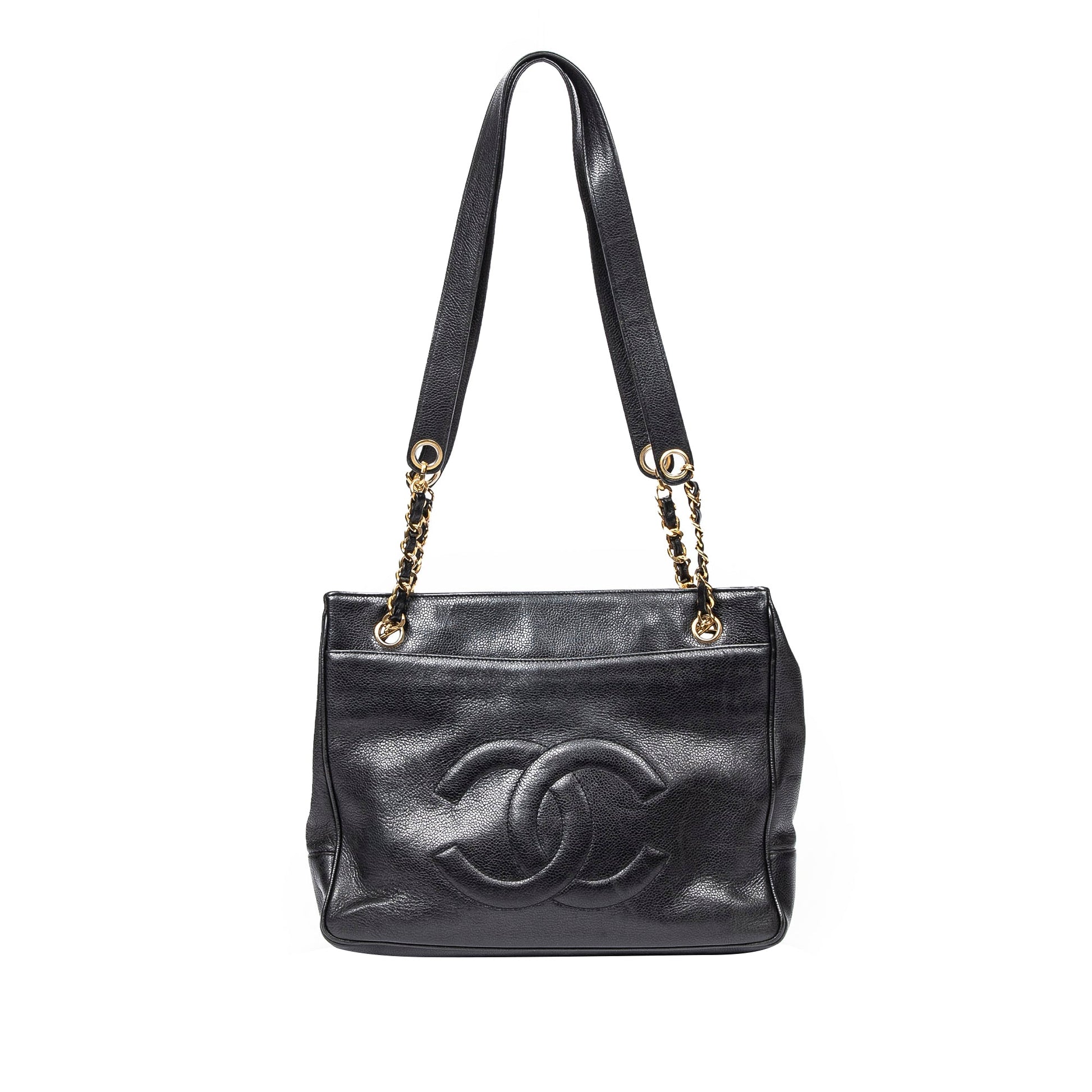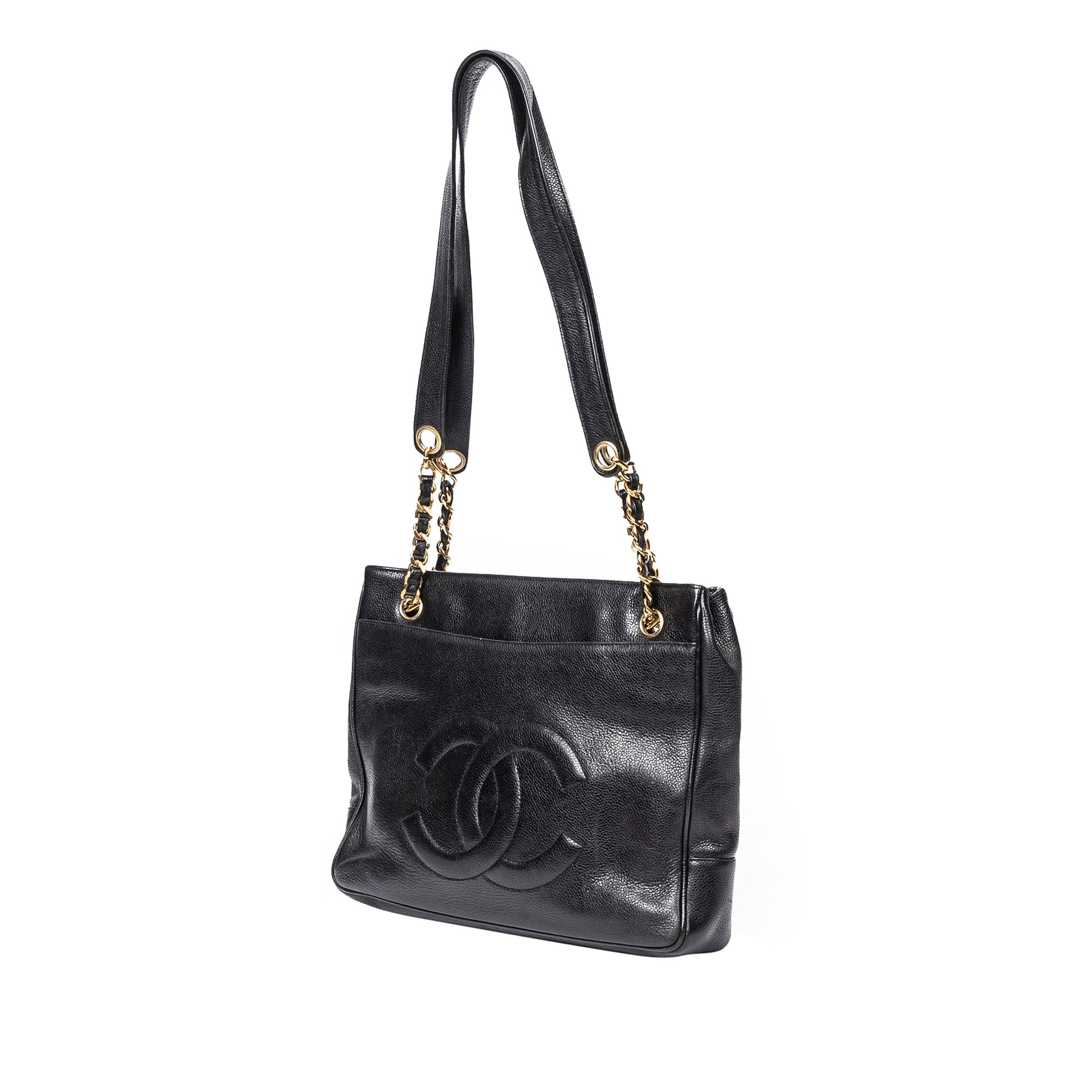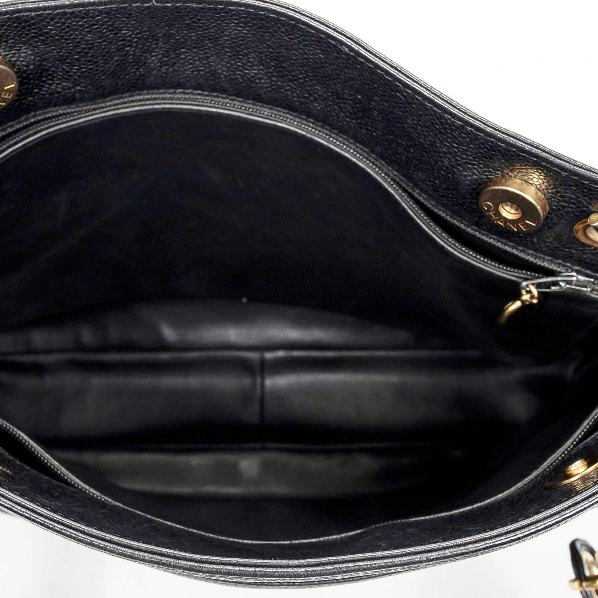 Product Details: Black Chanel Caviar CC Tote. This tote bag features a caviar leather body, leather-woven chain straps, an open top with magnetic snap closures, and interior zip pockets. 9.8" L x 12.6" W x 2.4" D. Serial number 2590567.