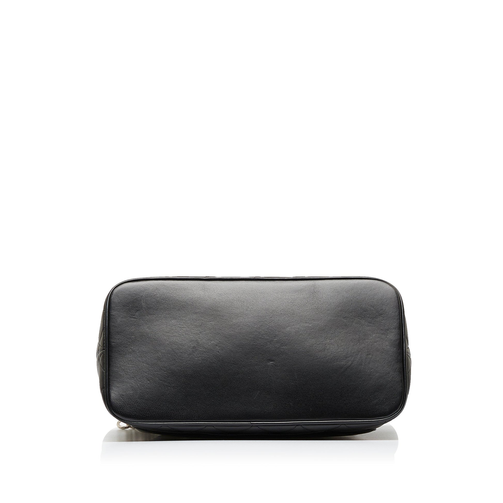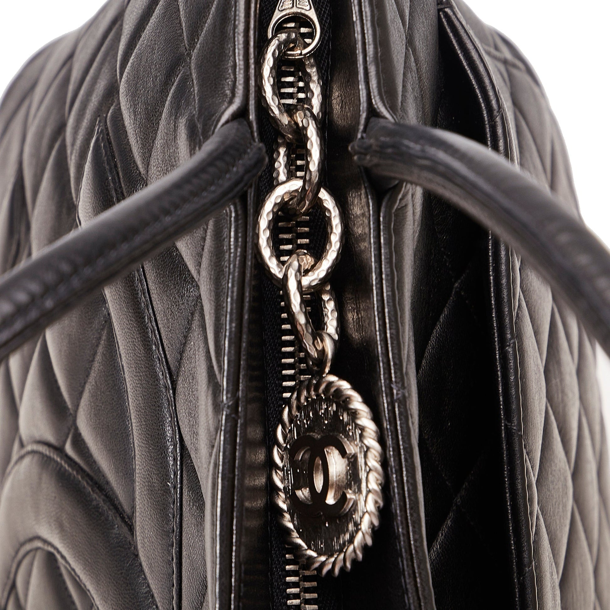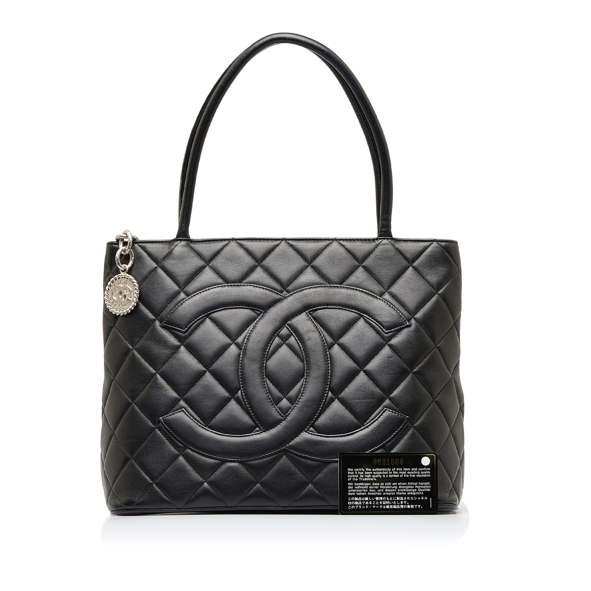 Product Details: Black Chanel Medallion Tote. The Medallion tote bag features a quilted lambskin leather body, rolled leather handles, a top zip closure, an exterior back slip pocket, and interior zip and slip pockets. 9.4" L x 13" W x 5.5" D, 5.9" drop. Serial number 6291568.