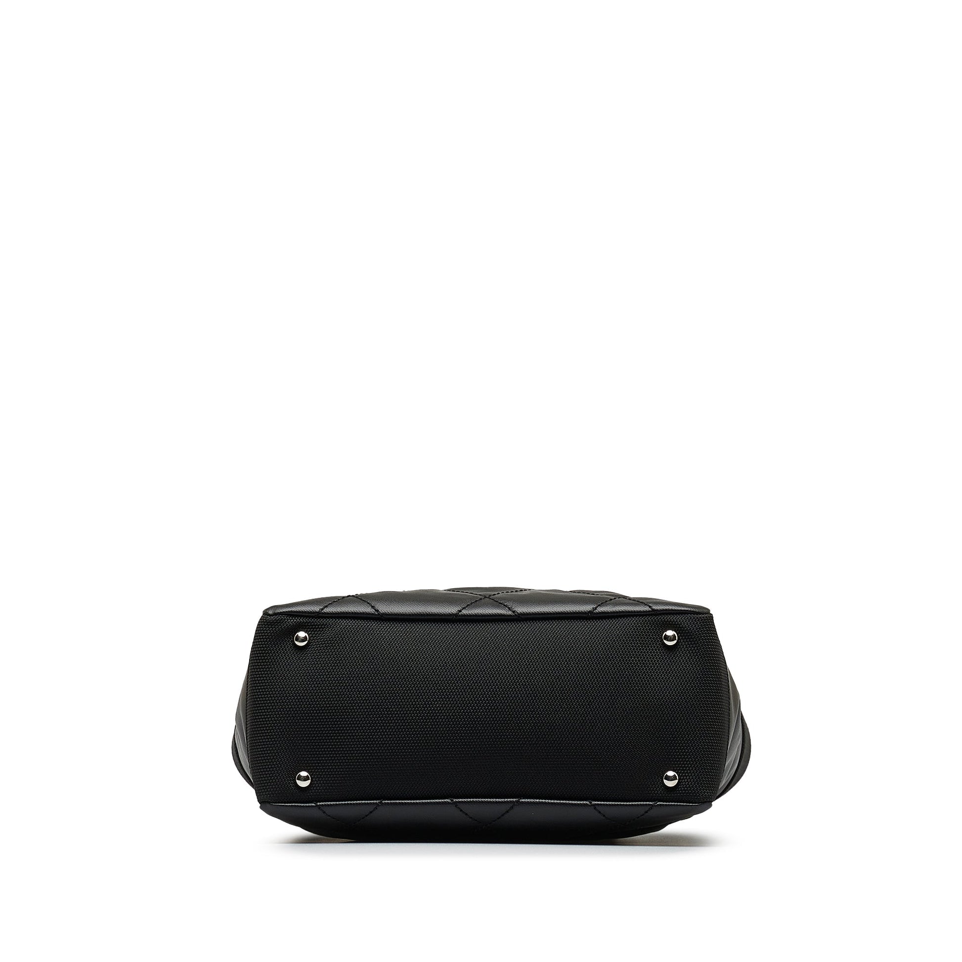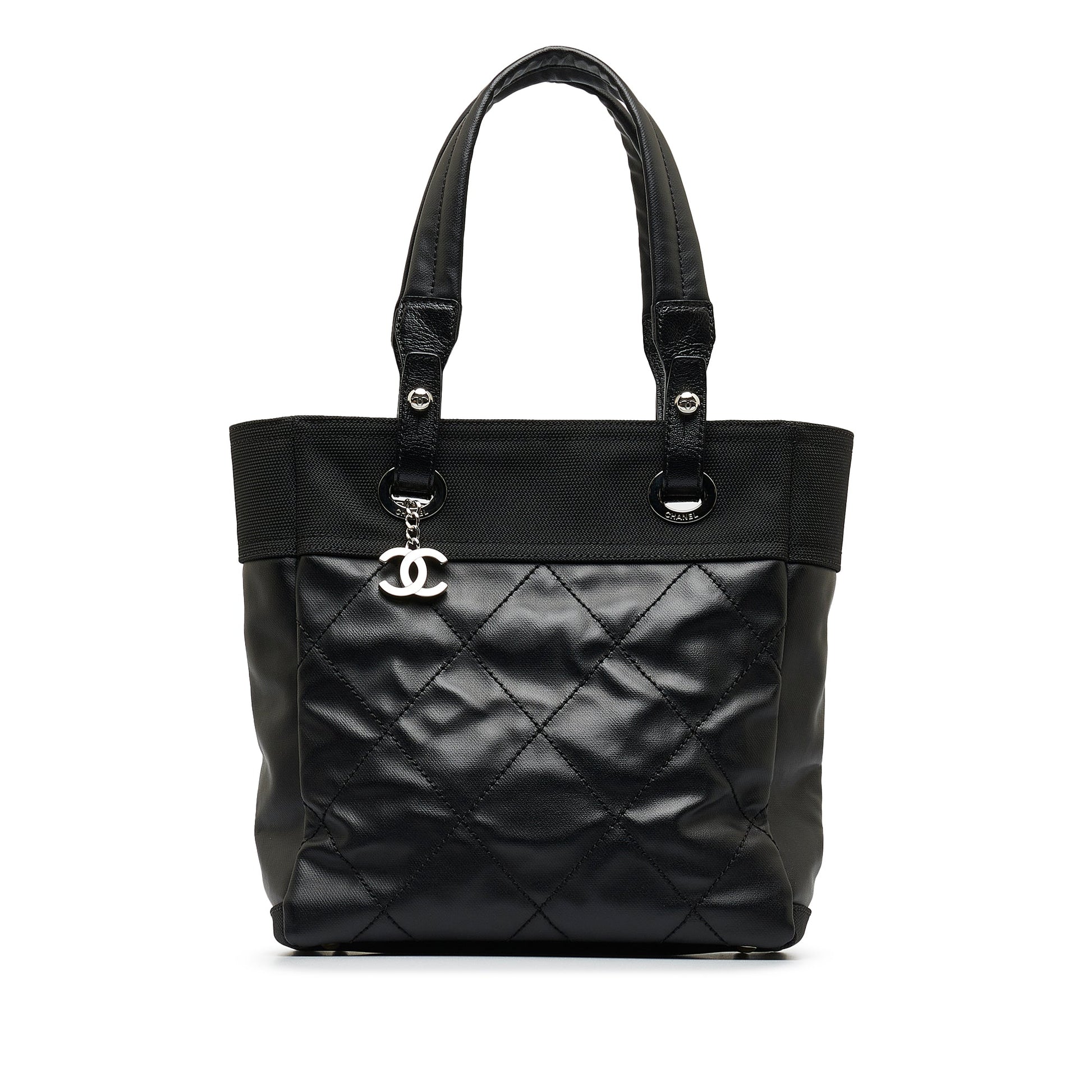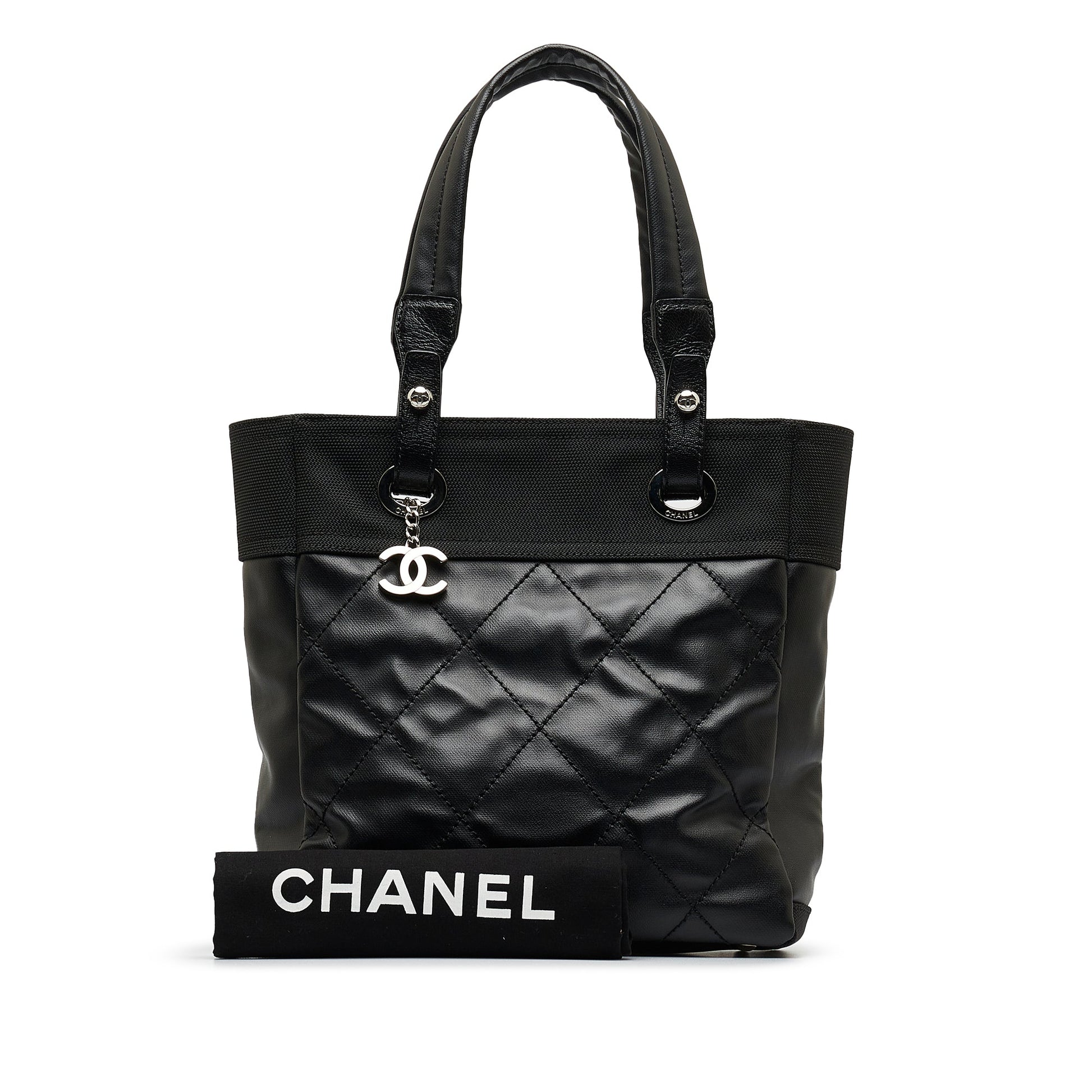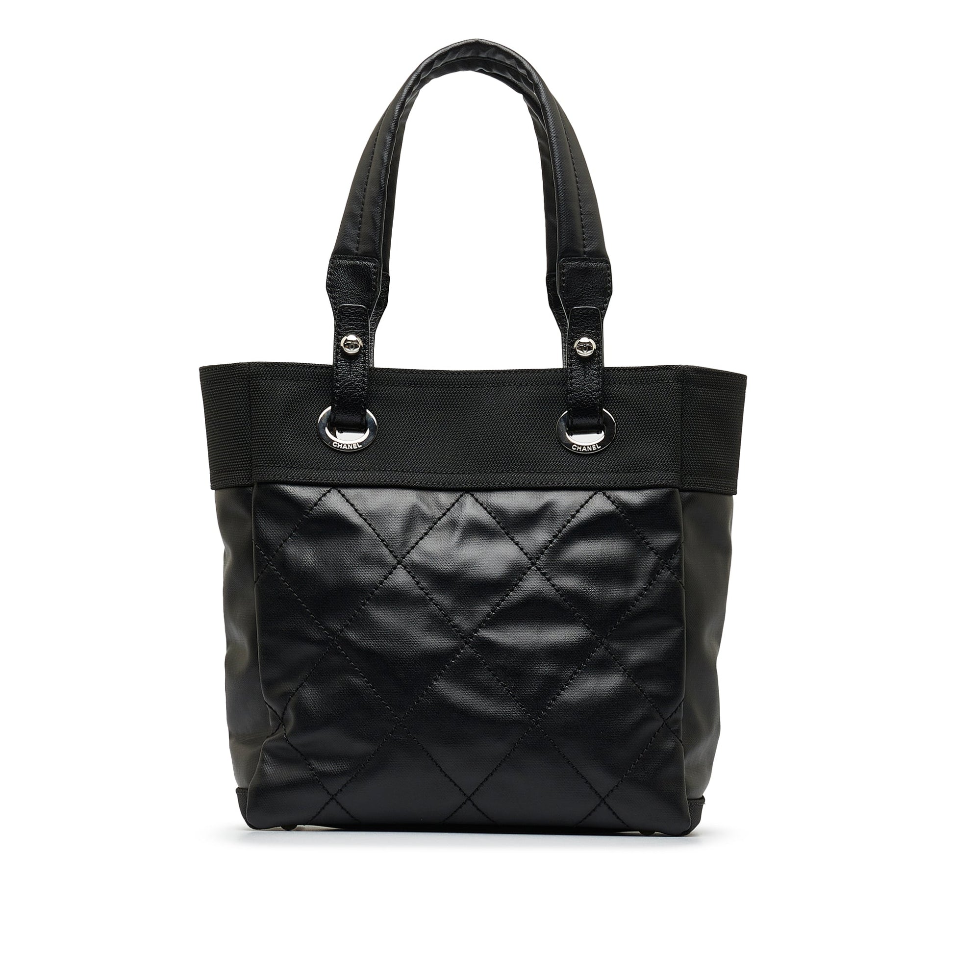 Product Details: Black Chanel Paris Biarritz PM Tote. The Paris Biarritz tote bag features a quilted coated canvas body with nylon trim, flat handles, a top zip closure, and an interior zip compartment. 10.6" L x 9.8" W x 5.9" D, 7.5" drop. Serial number 16729756.