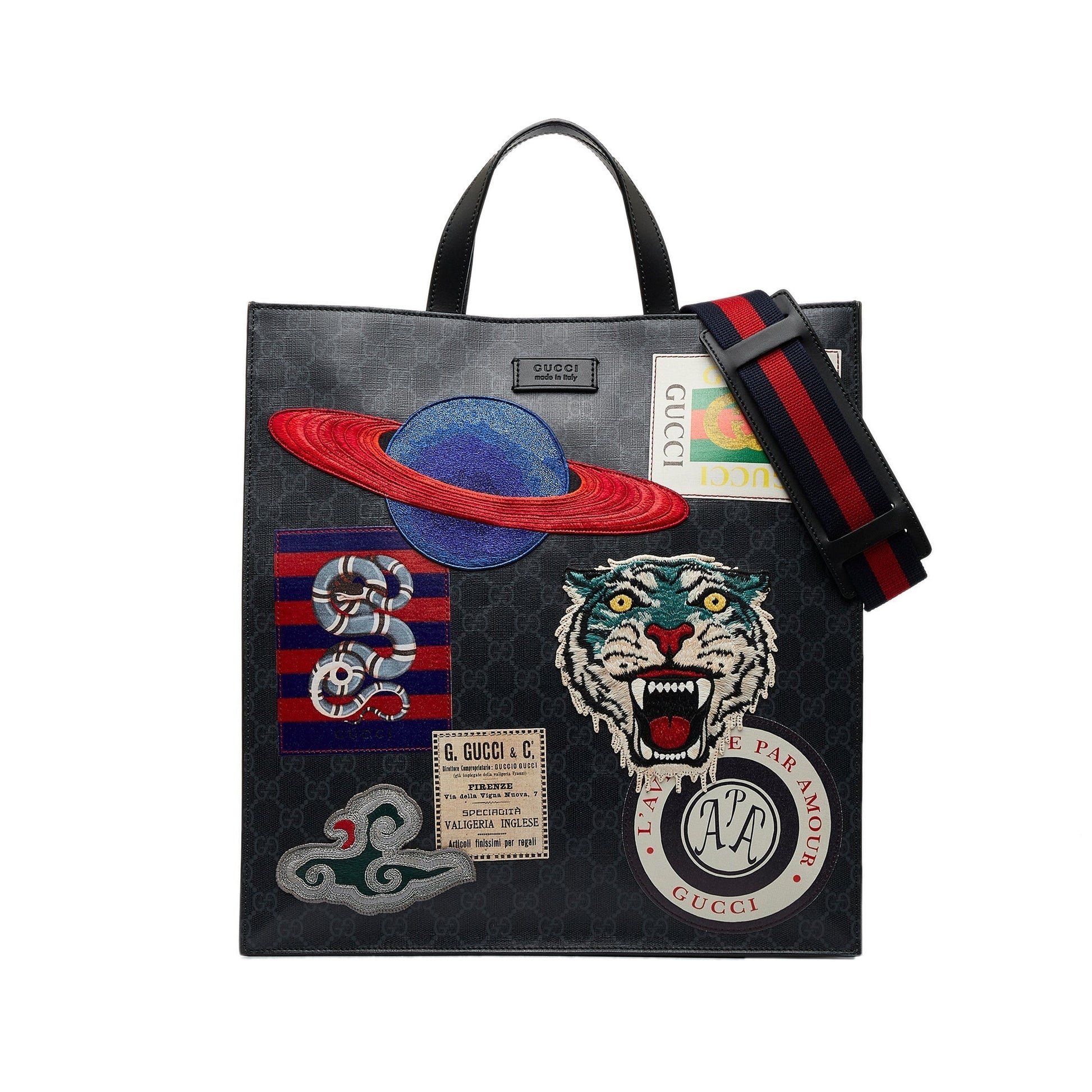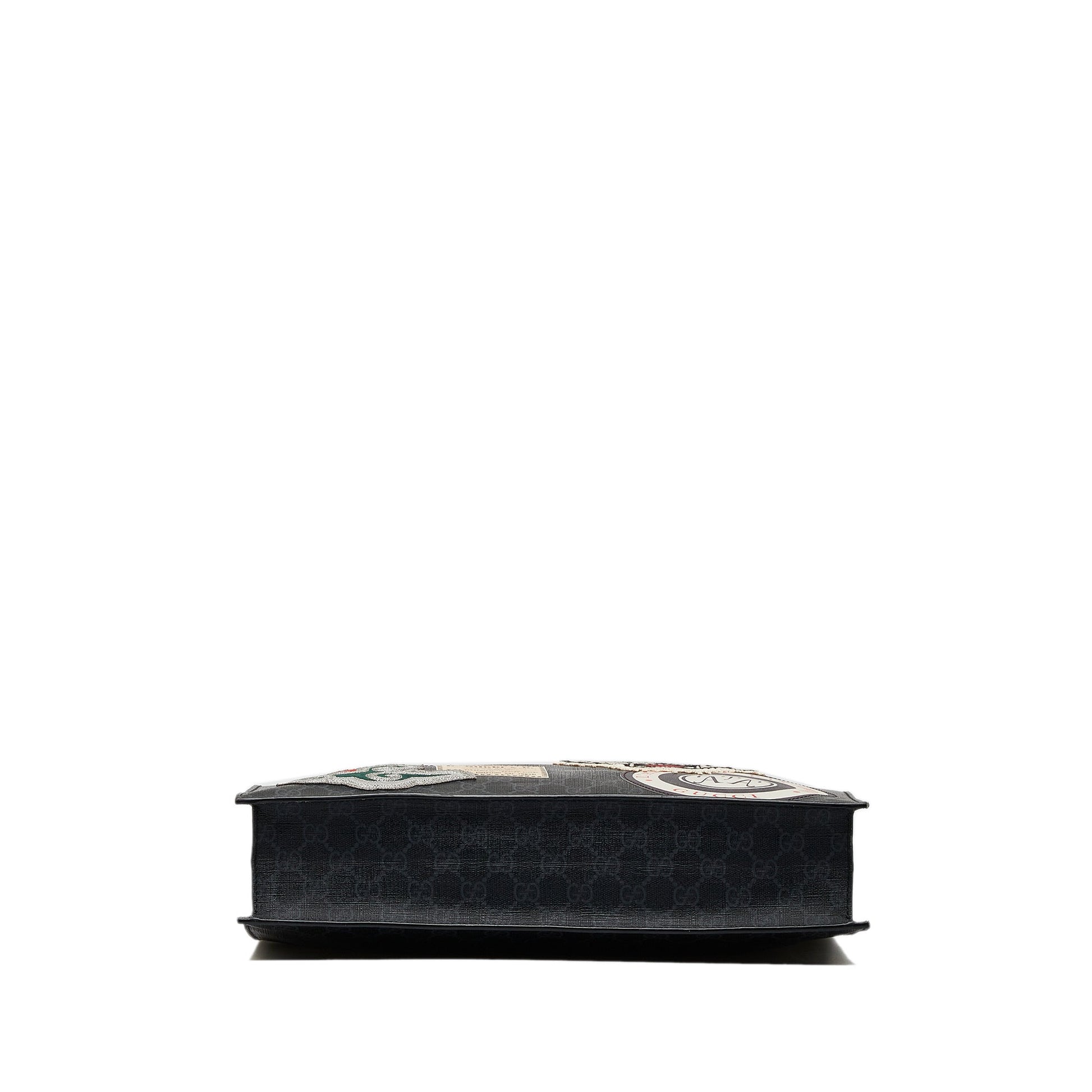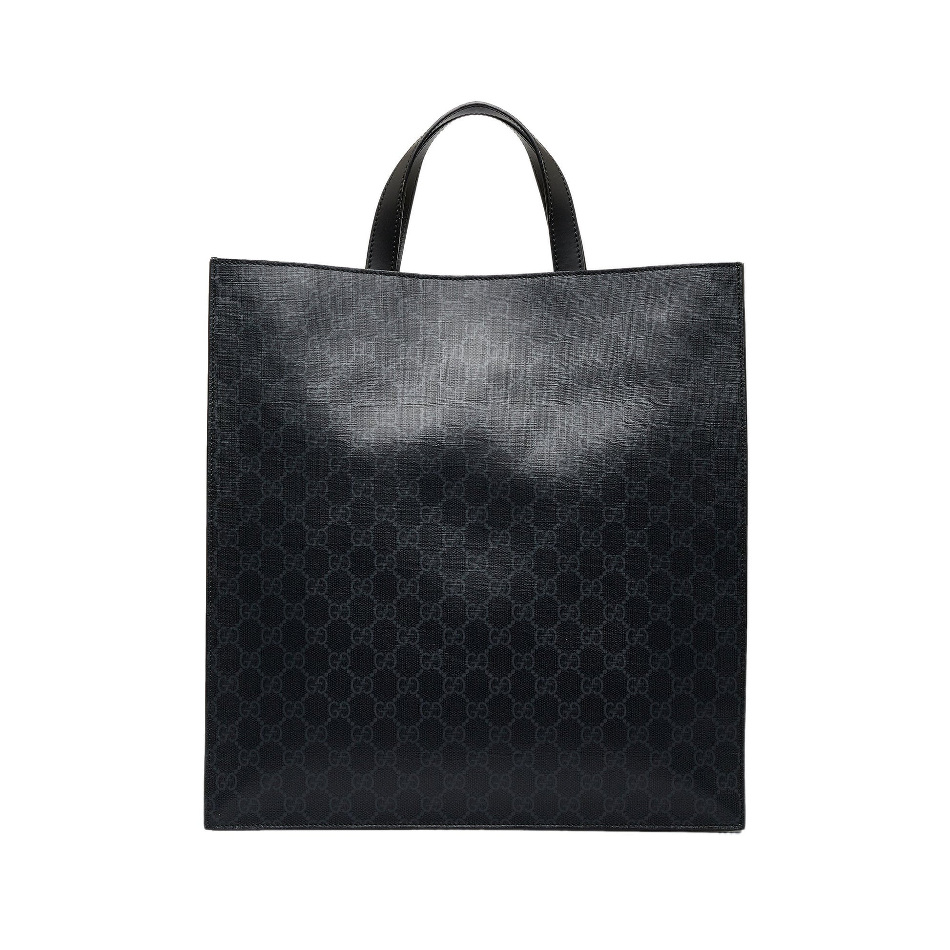 Product Details: Black Gucci GG Supreme Courrier Convertible Soft Tote Satchel. The Courrier Convertible Soft Tote features a coated canvas body with courrier applique design, flat leather handles, a detachable web shoulder strap, an open top with magnetic snap closure, and interior zip pockets. 14.6" L x 13.8" W x 2.8" D, 3.9" drop. Serial number 495559 525040.