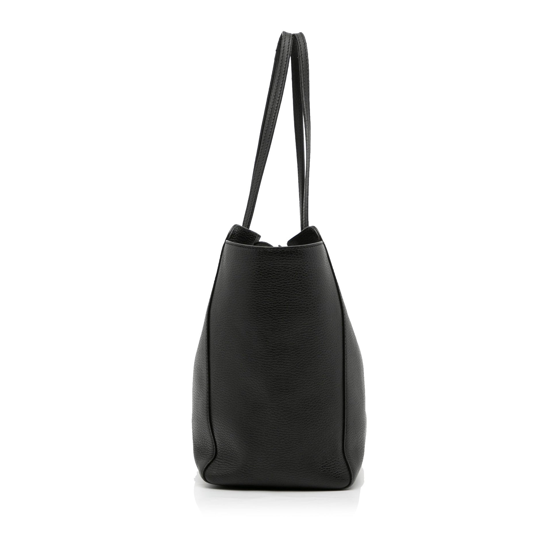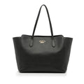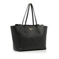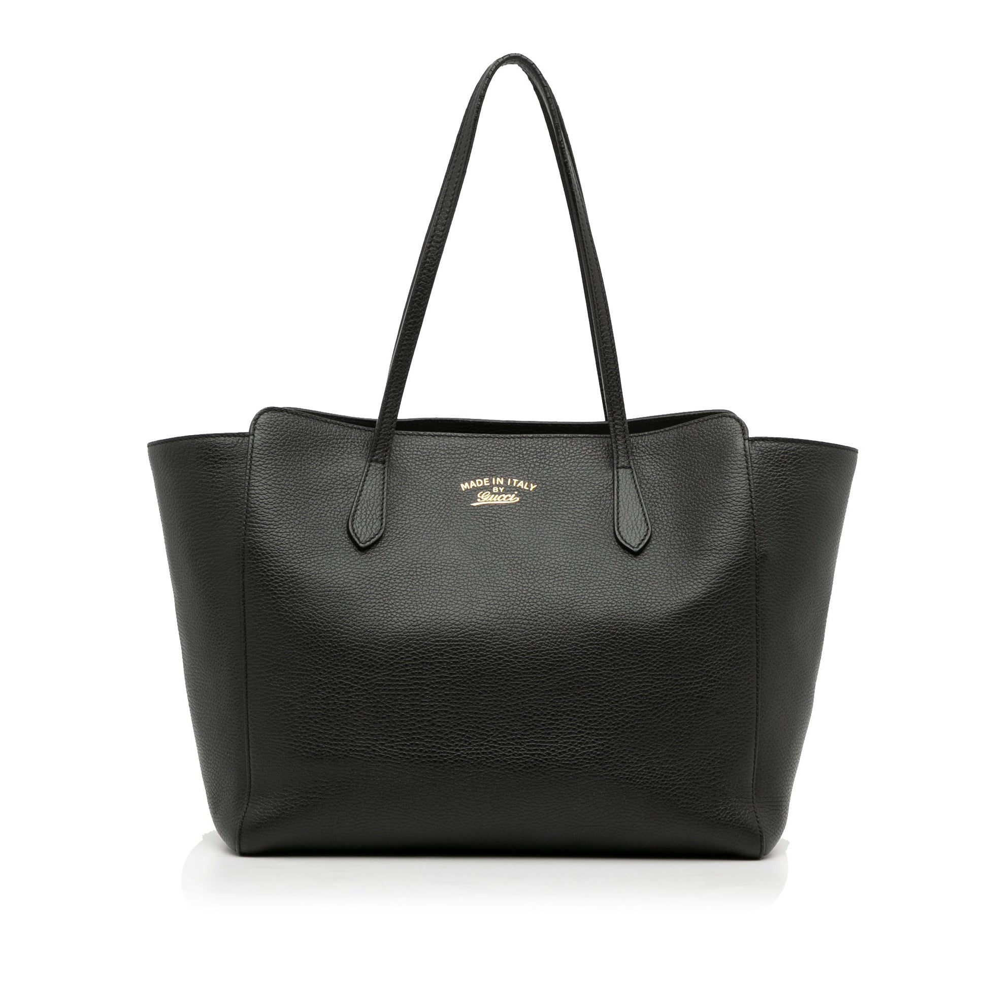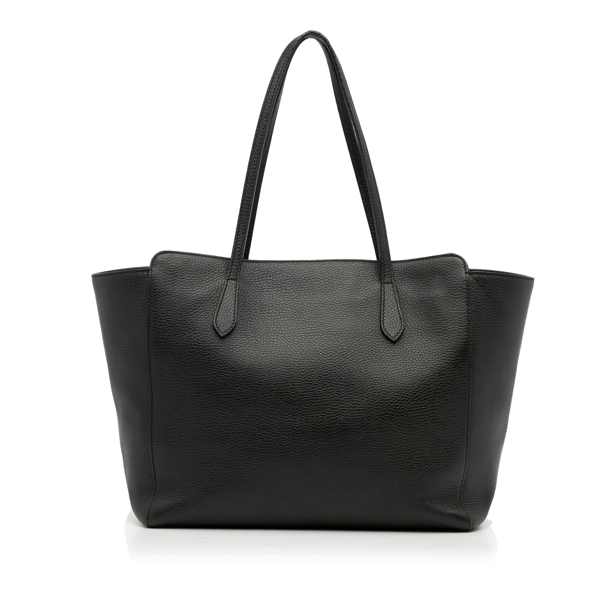Product Details: Black Gucci Medium Swing Tote. The Swing features a leather body, flat leather straps, an open top with magnetic closure, and interior zip and slip pockets. 11" L x 13.4" W x 6.3" D, 6.3" drop. Serial number 354397 498879.