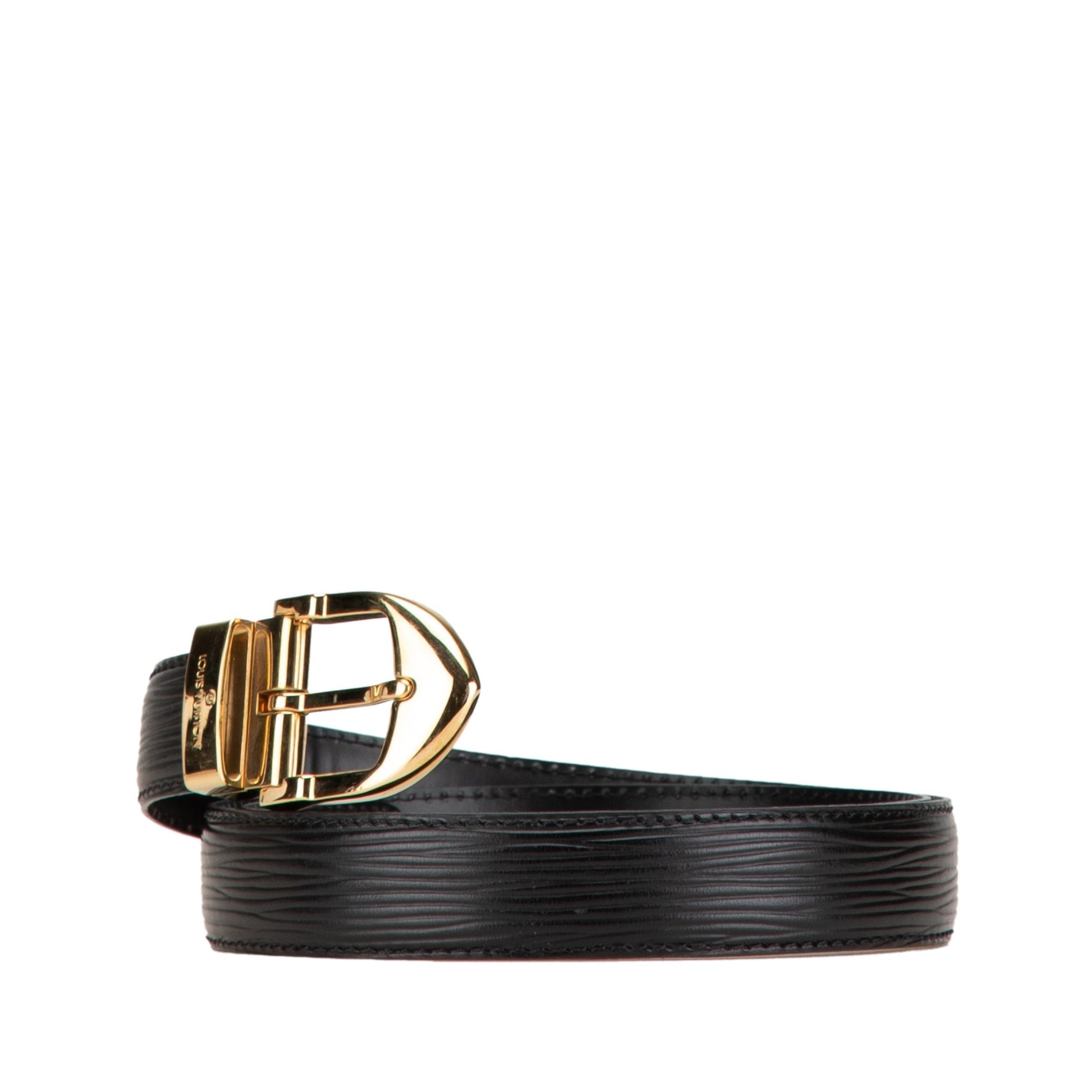 Product Details: Black Louis Vuitton Epi Ceinture Belt. The Ceinture belt features an epi leather body with gold-tone hardware and a metal buckle closure. 36.6" L x 0.8" W x 0" D. Serial number CT1907.