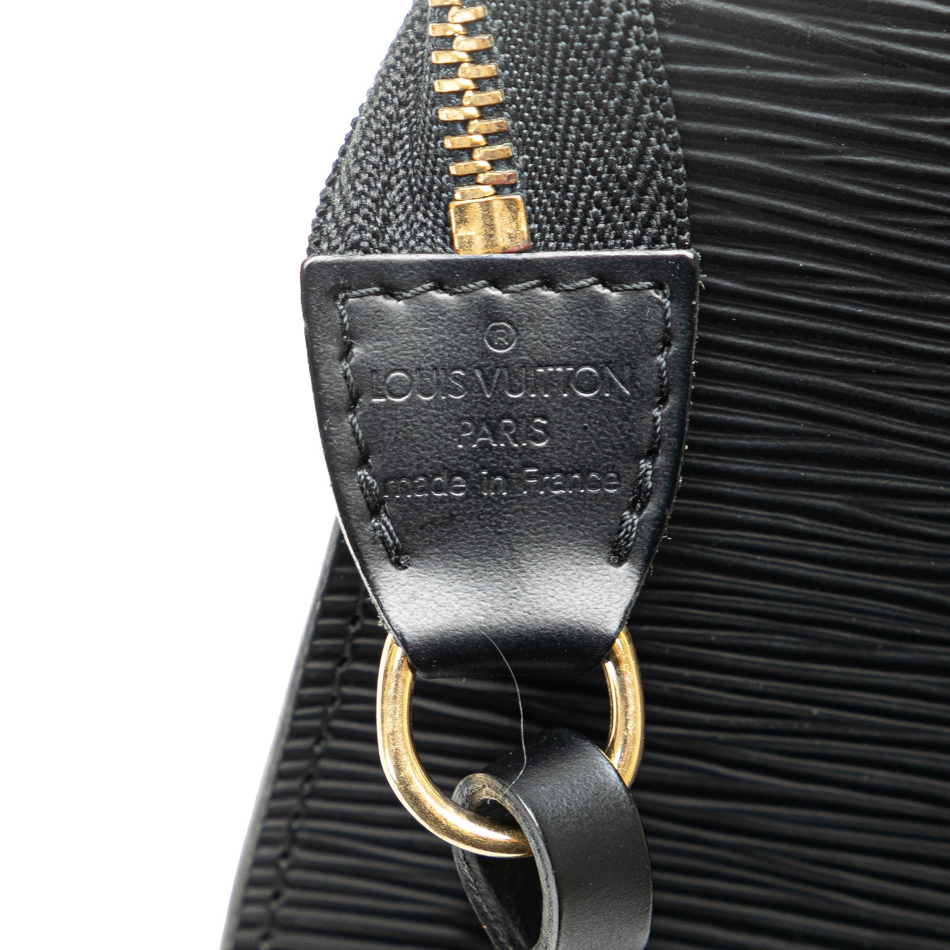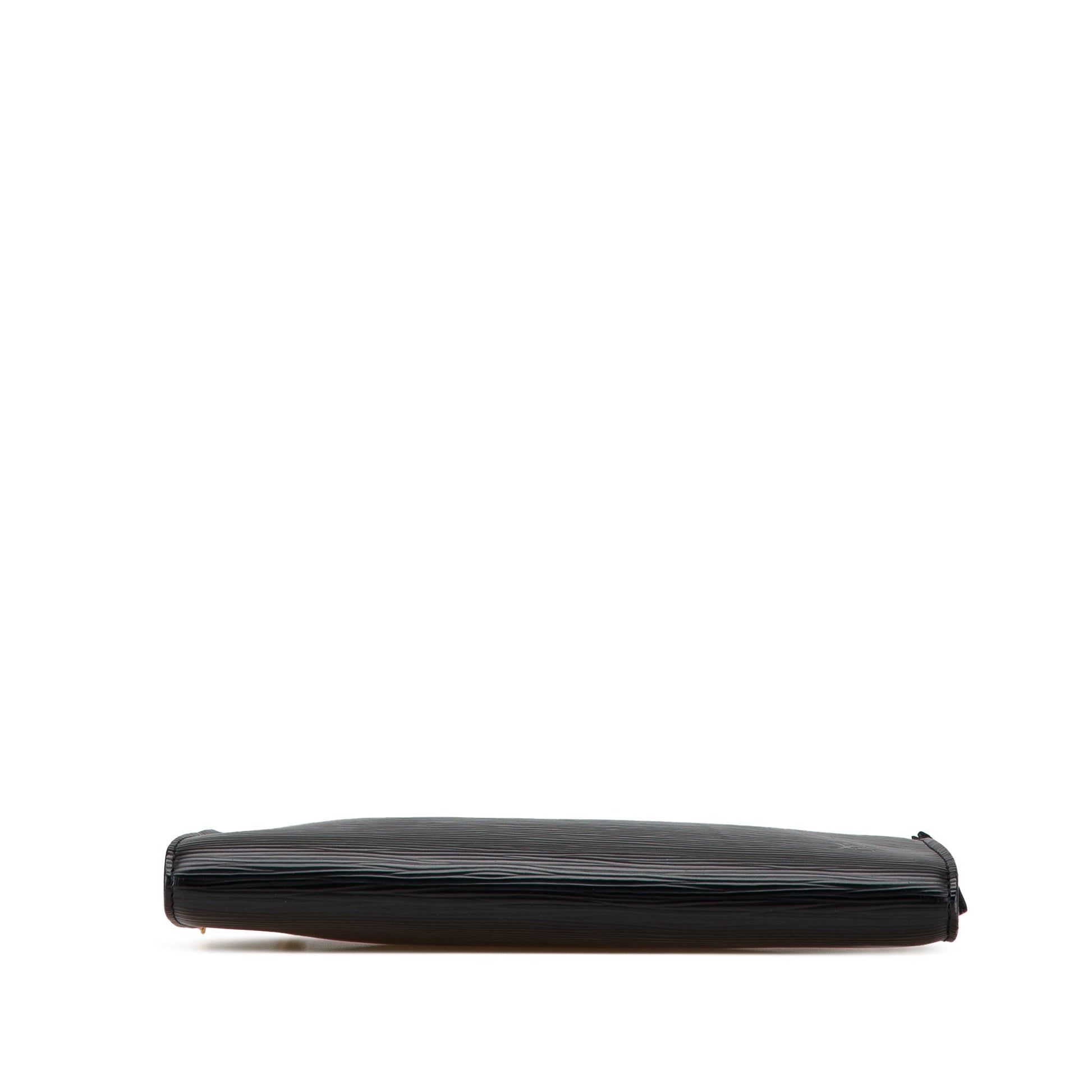 Product Details: Black Louis Vuitton Epi Pochette Accessoires Shoulder Bag. The Pochette Accessoires features an epi leather body, a detachable flat shoulder strap, and a top zip closure. 5.1" L x 9.4" W x 0.8" D. Serial number AR0035.