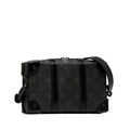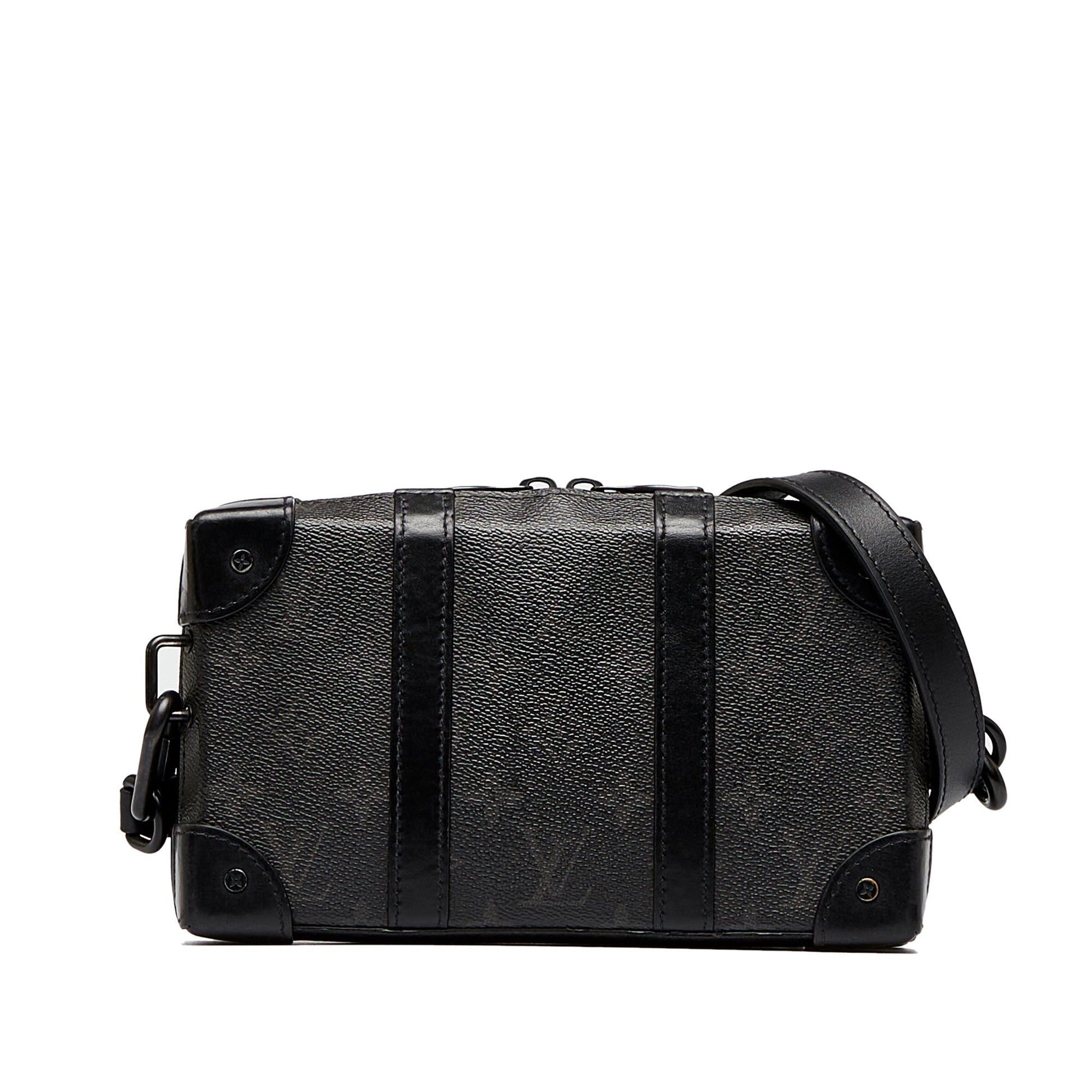 Product Details: Black Louis Vuitton Monogram Eclipse Soft Trunk Wallet Crossbody. The Monogram Eclipse Soft Trunk Wallet Crossbody features a monogram eclipse canvas body, single adjustable shoulder strap, zip closure at top, twill lining and dual interior pockets with card slots. 4.9" L x 8.7" W x 1.6" D.