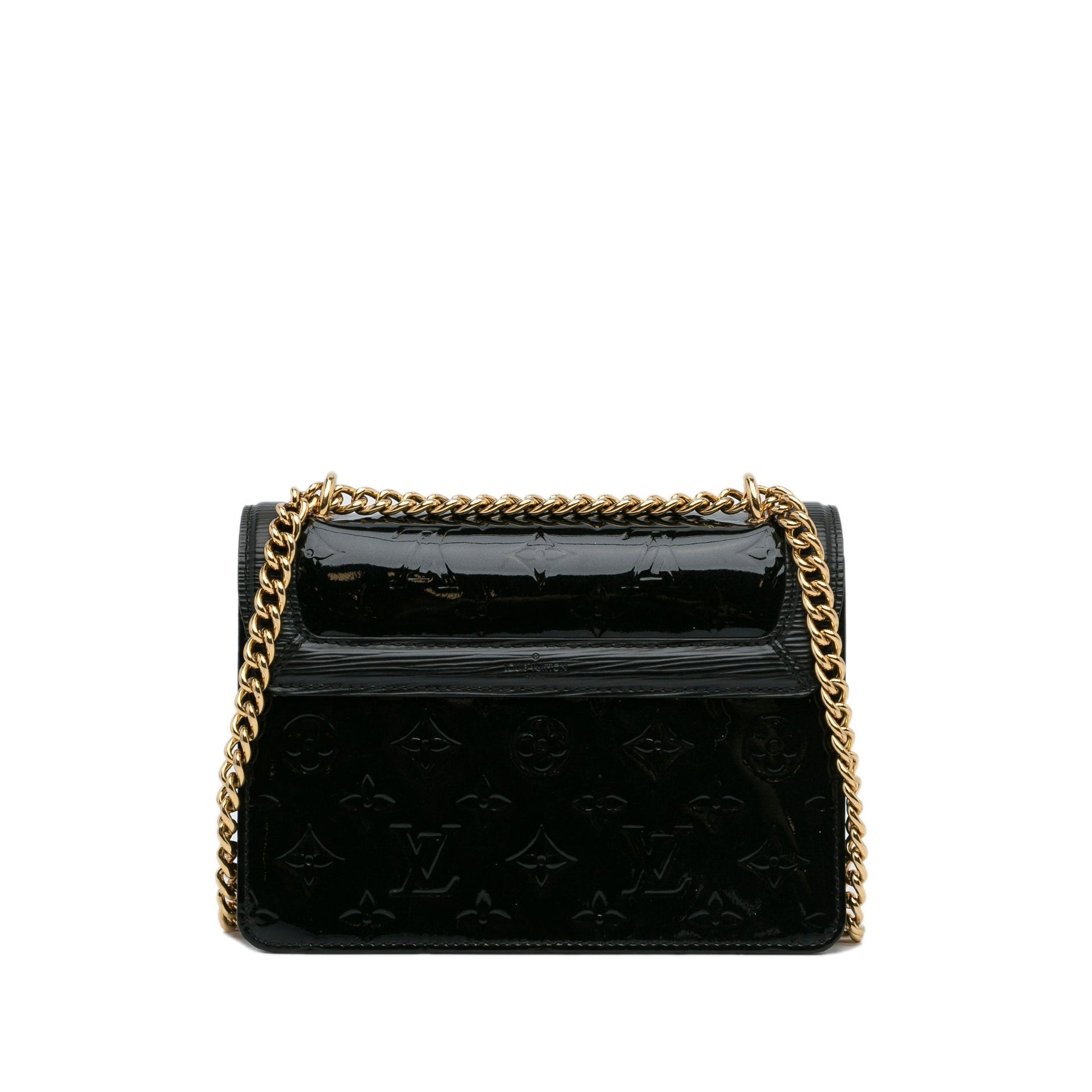 Product Details: Black Louis Vuitton Monogram Vernis Wynwood Crossbody Bag. The Wynwood features a vernis leather body with epi leather and monogram canvas trim, a gold-tone chain strap with leather guard, a front flap with S-lock closure, and an interior slip pocket, 6.1" L x 8.3" W x 2.4" D.