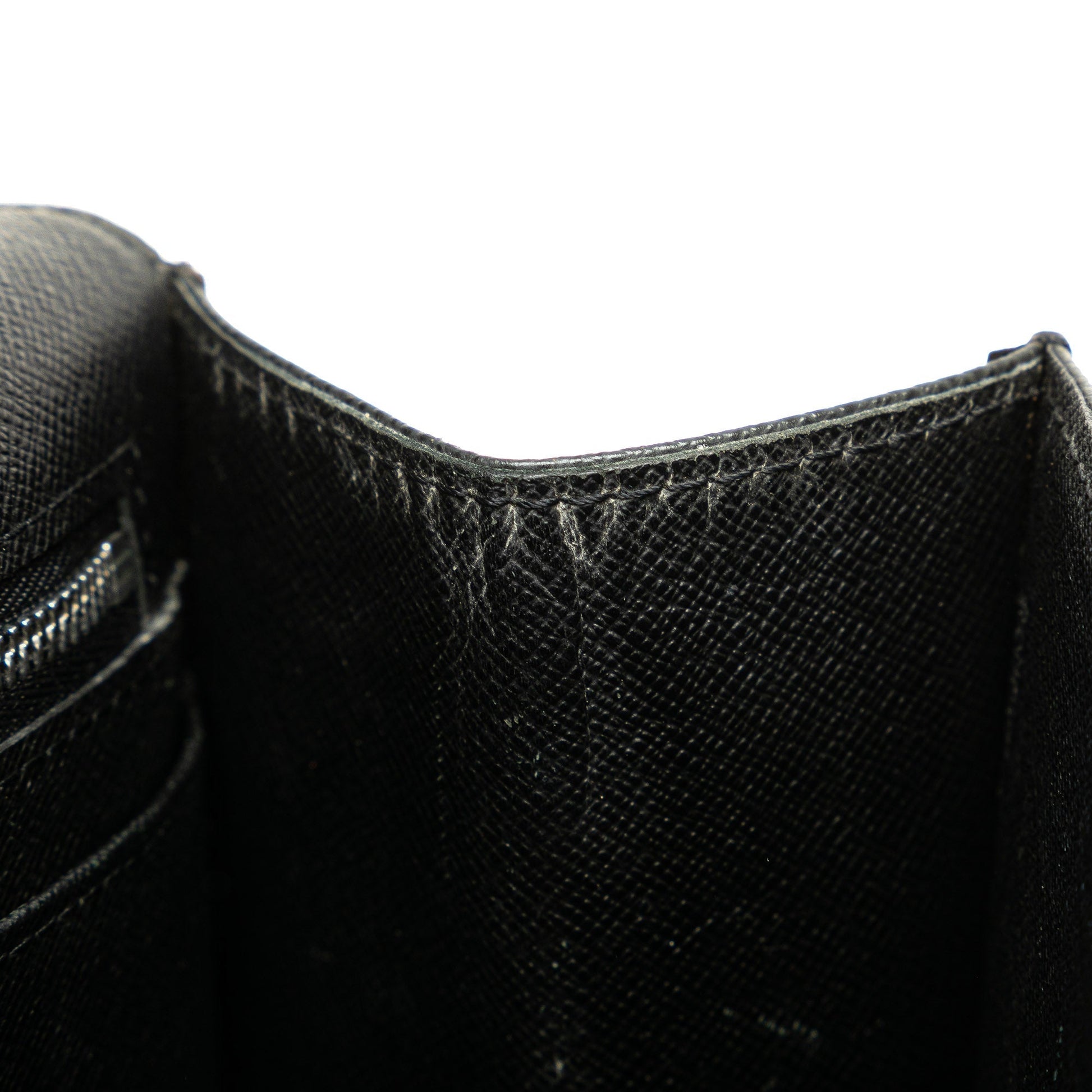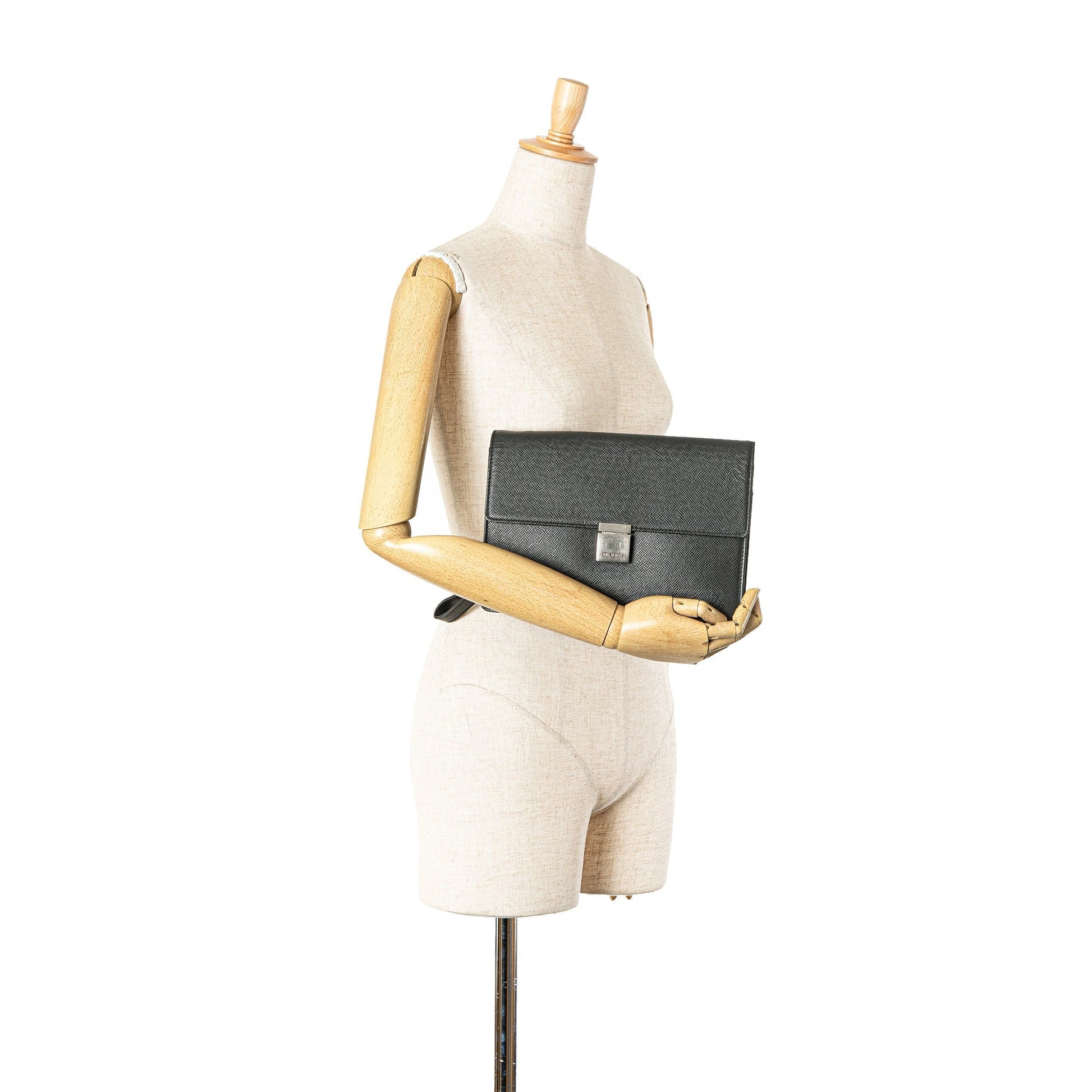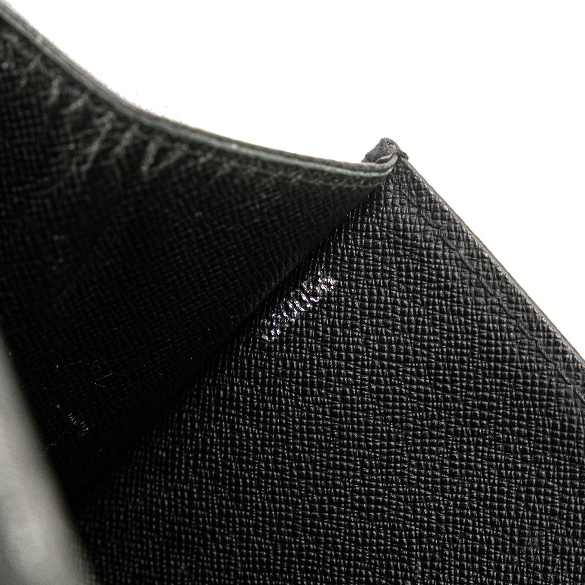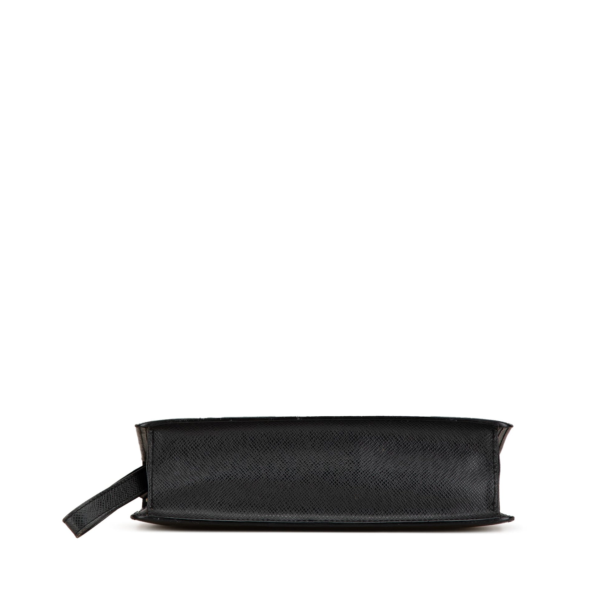 Product Details: Black Louis Vuitton Taiga Selenga Clutch Bag. The Selenga features a taiga leather body, a flat leather wrist strap, a front flap with a push lock closure, an exterior back slip pocket, and interior zip and slip pockets. 7.1" L x 10.1" W x 2.6" D, 8.7" drop. Serial number CA0056.