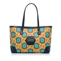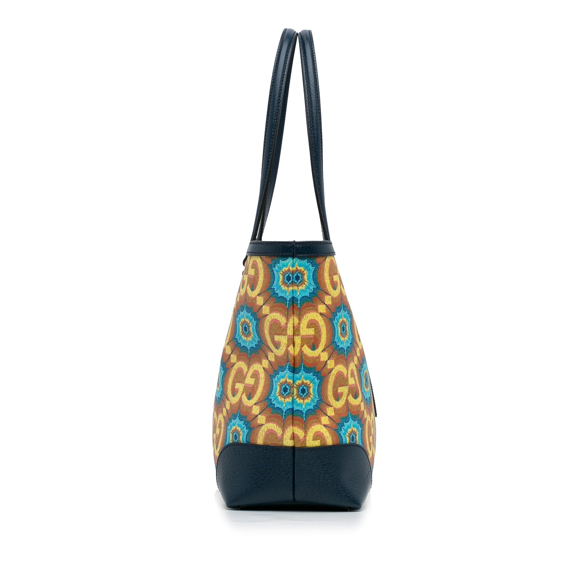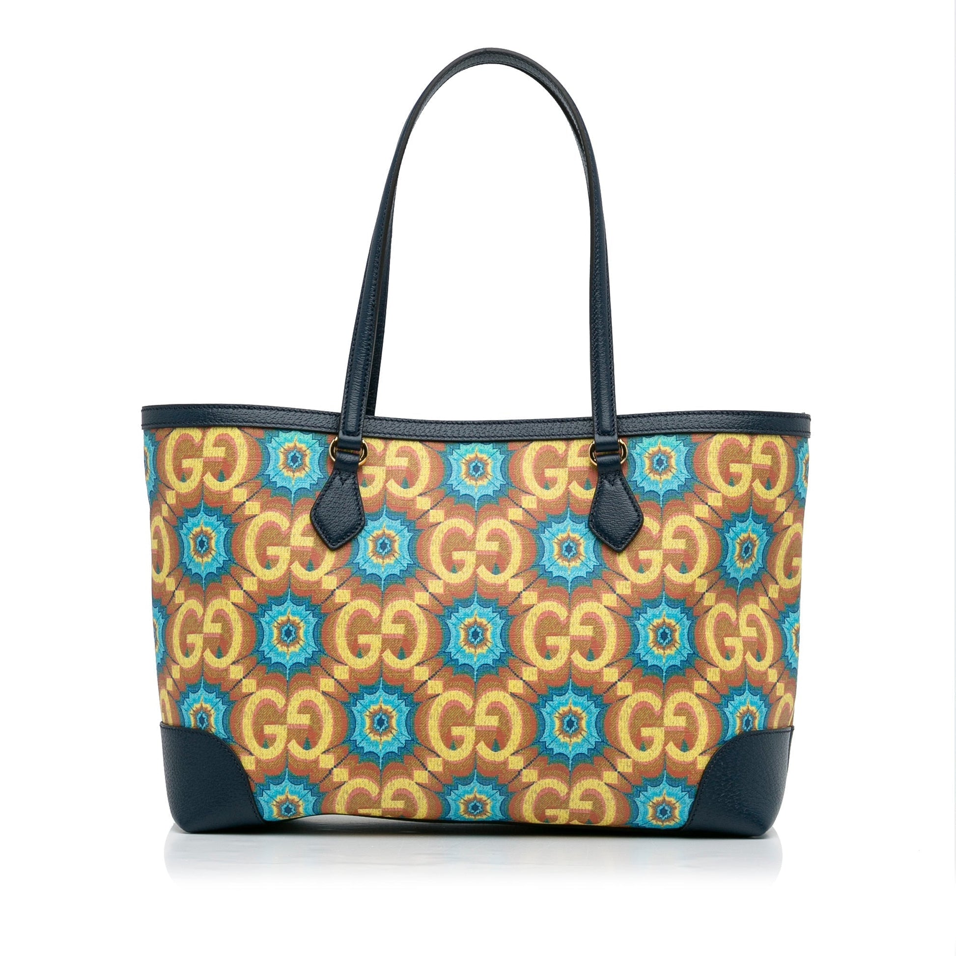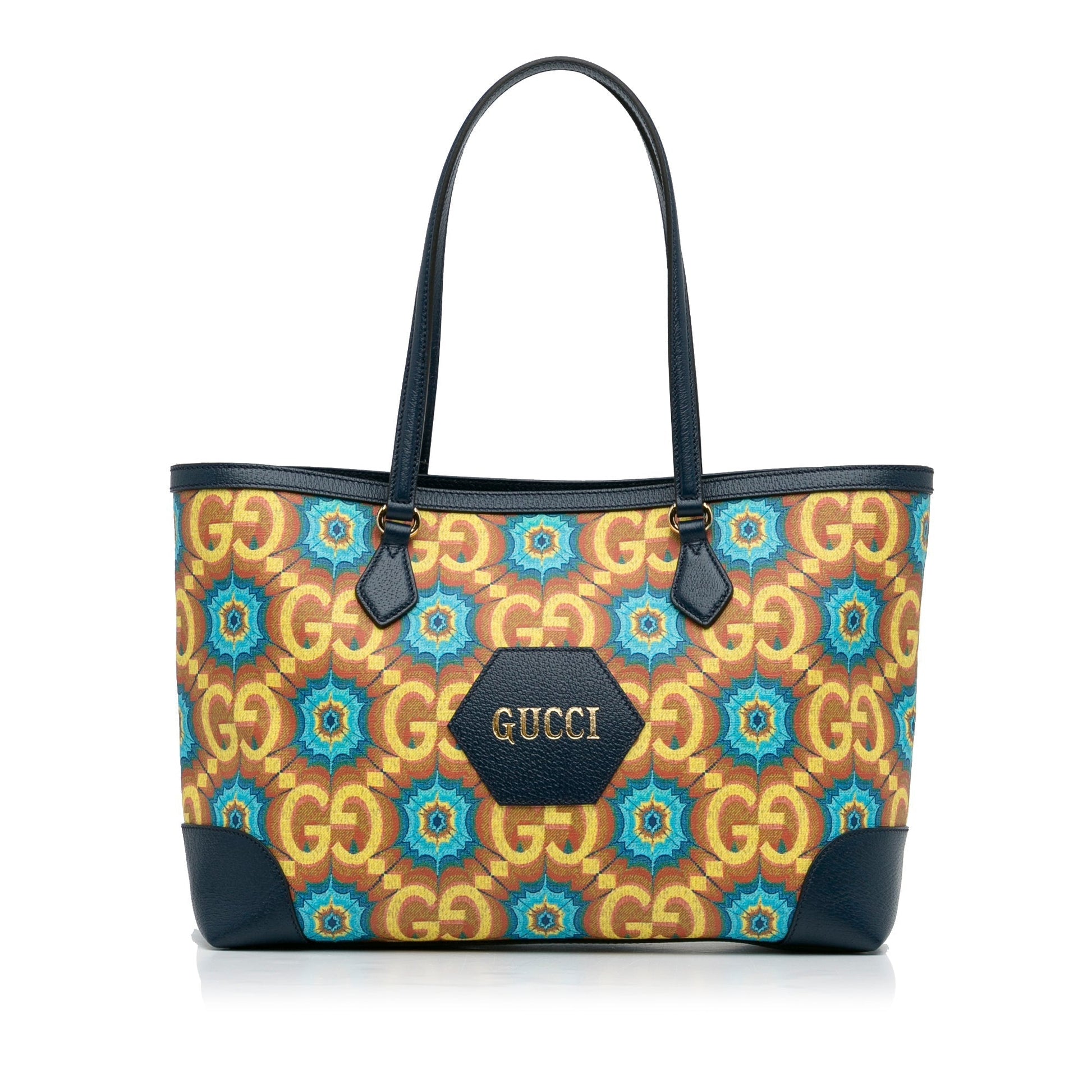 Product Details: Blue Gucci Medium GG Supreme Kaleidoscope 100 Ophidia Tote. This tote bag features a printed coated canvas body with leather trim, flat leather handles, an open top with magnetic button closure, and interior zip and slip pockets, 11.4" L x 15" W x 5.5" D, 10.2" drop. Serial number 676681 493492.