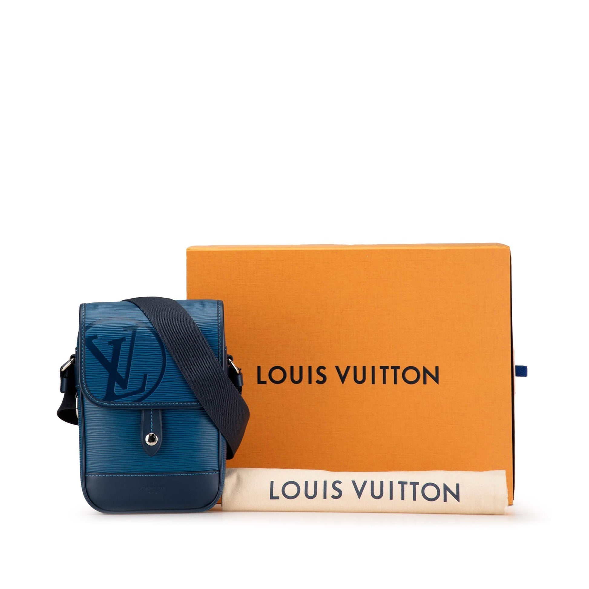 Product Details: Blue Louis Vuitton Epi Downtown Messenger BB Crossbody Bag. This crossbody bag features an epi leather body, an adjustable flat strap, a front flap with magnetic snap button closure, and an interior slip pocket. 8.7" L x 5.9" W x 3" D. Serial number FO1118.