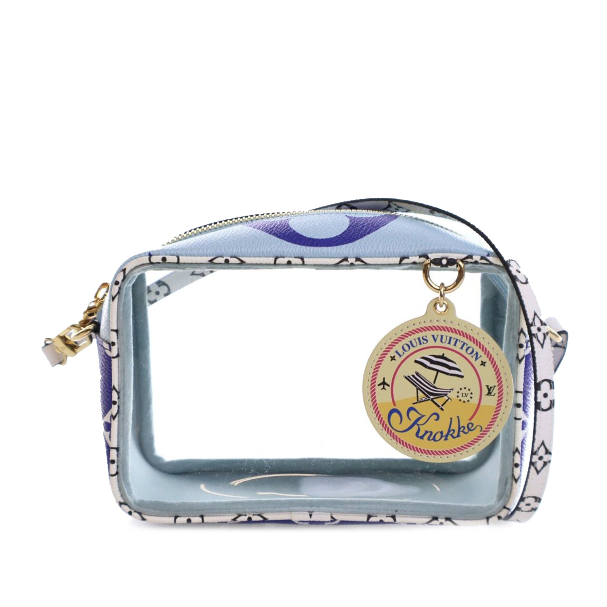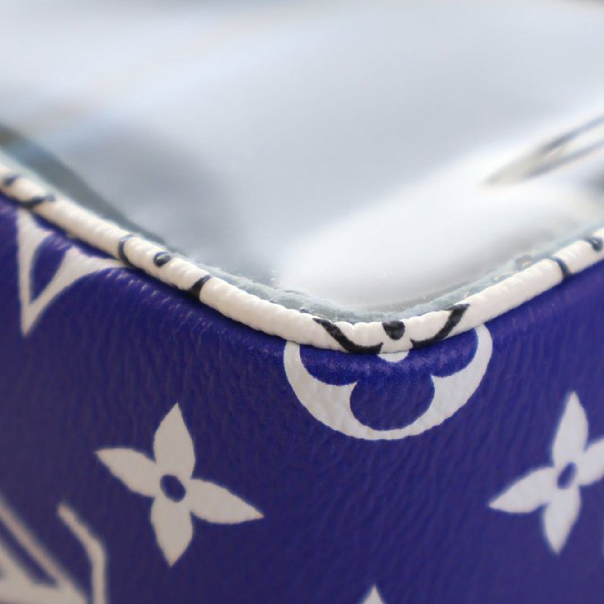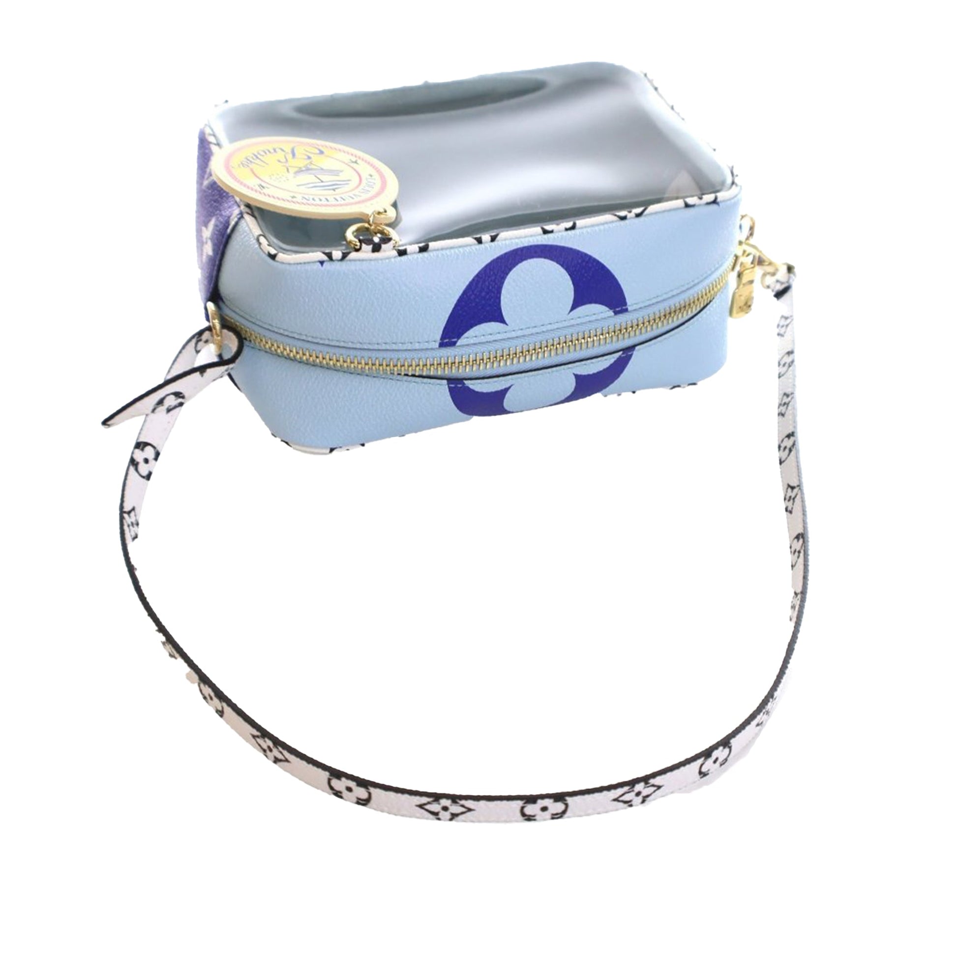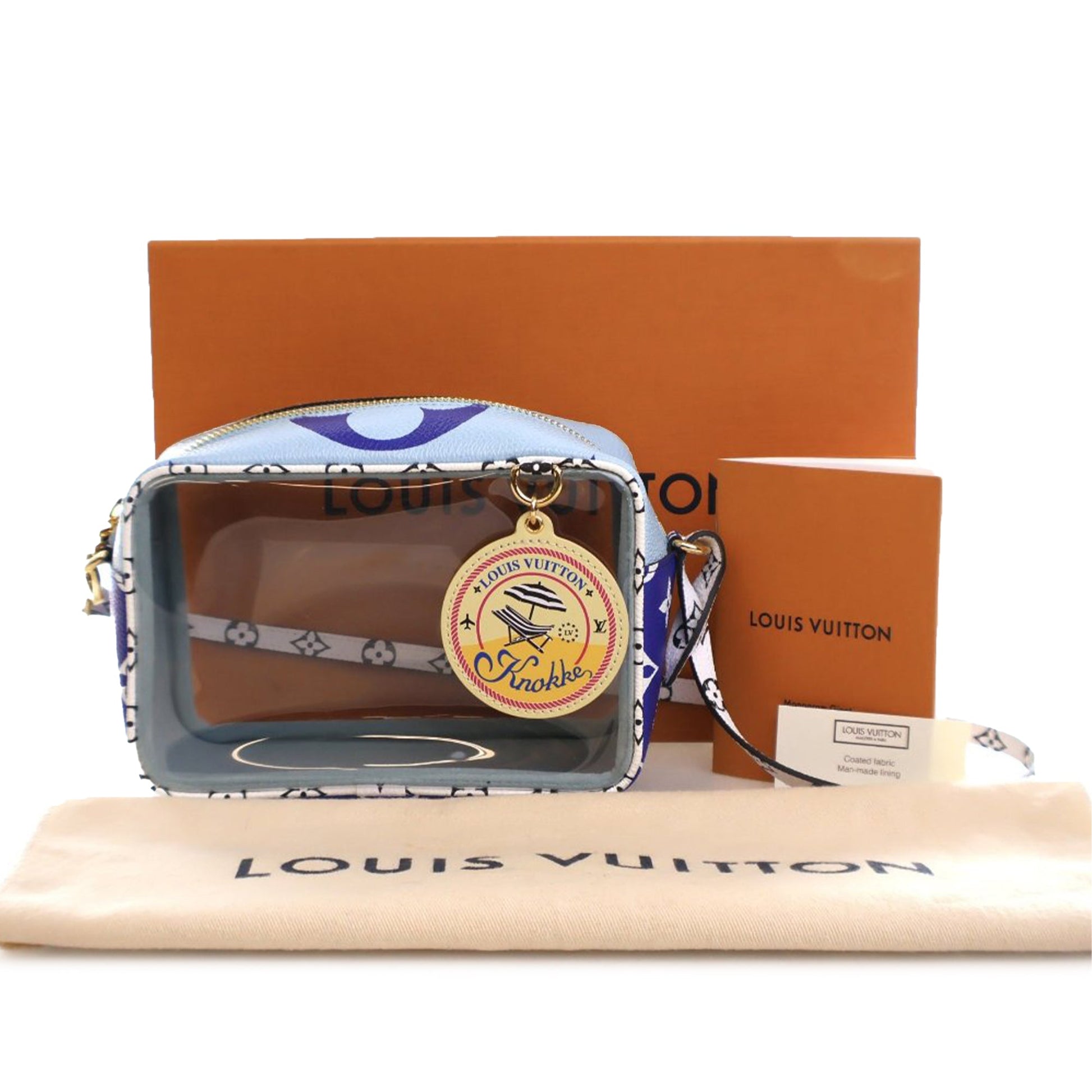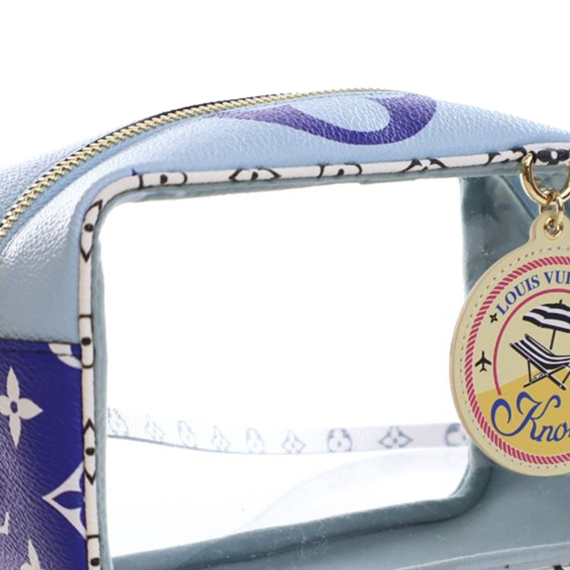 Product Details: Blue Louis Vuitton Monogram Giant Beach Pouch Shoulder Bag. The Monogram Giant Beach Pouch features a PVC body with monogram canvas trim, a flat shoulder strap, and a top zip closure. 3.9" L x 6.5" W x 3.1" D. Serial number TR2119.