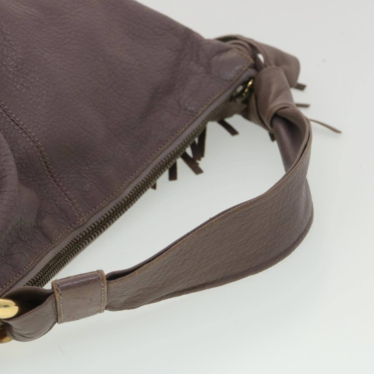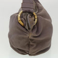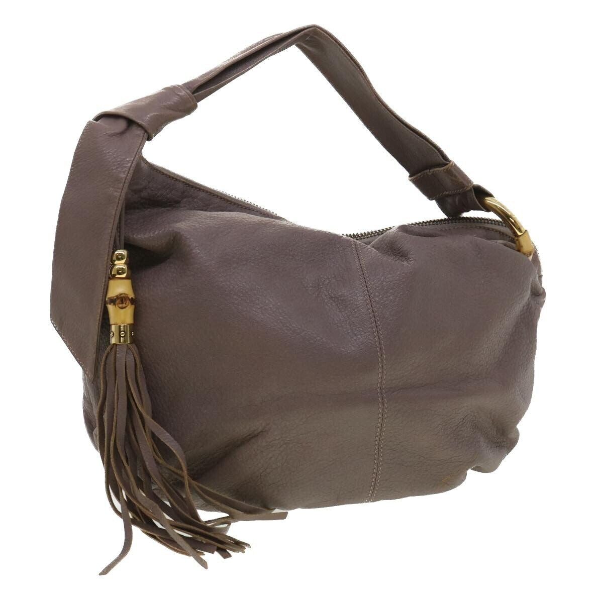 This high end bohemian hobo by Gucci is constructed with lovely textured, soft leather in a pretty mocha brown shade. It has bold, gold & bamboo accents, including a thick tassel accent zipper pull. The purse has a zip top closure and a wider, thick flat leather shoulder strap that sits comfortably on the shoulder with a large faux knot on one side & a bamboo ring on the other. This is a fun, yet practical, chic European take on a hobo by Gucci!