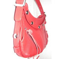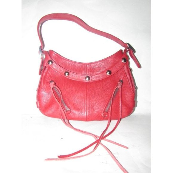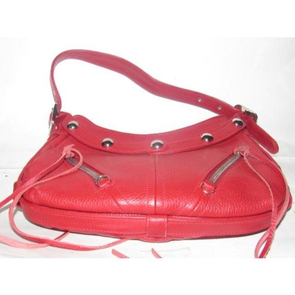 For sale is an edgy, Botkier, TRIGGER supple true red textured leather, medium, hobo style, shoulder purse with two, chrome, diagonal zippers in the front that open to pockets, bold chrome studs and accents, and a snap top closure! This purse is a unique, chic take on a classic hobo style with the fabulous Italian leather.