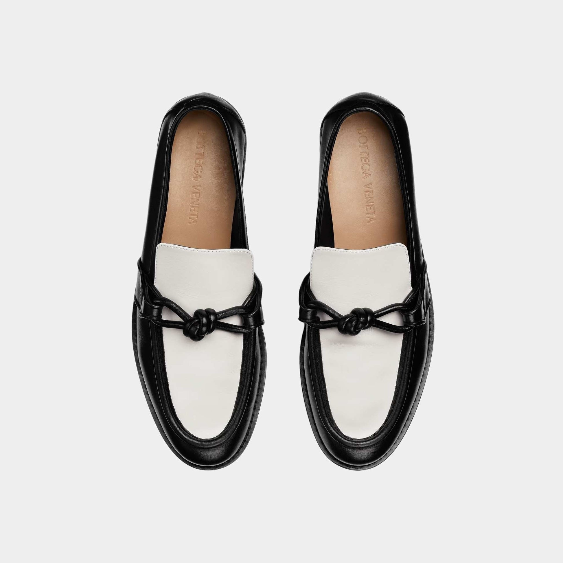The Bottega Veneta Astaire Loafer with Signature Knot Detail is a sophisticated take on a classic loafer, blending timeless elegance with modern craftsmanship. Featuring a bi-color calfskin leather construction, this refined shoe is accented with a signature leather knot detail, adding a touch of artisanal luxury.