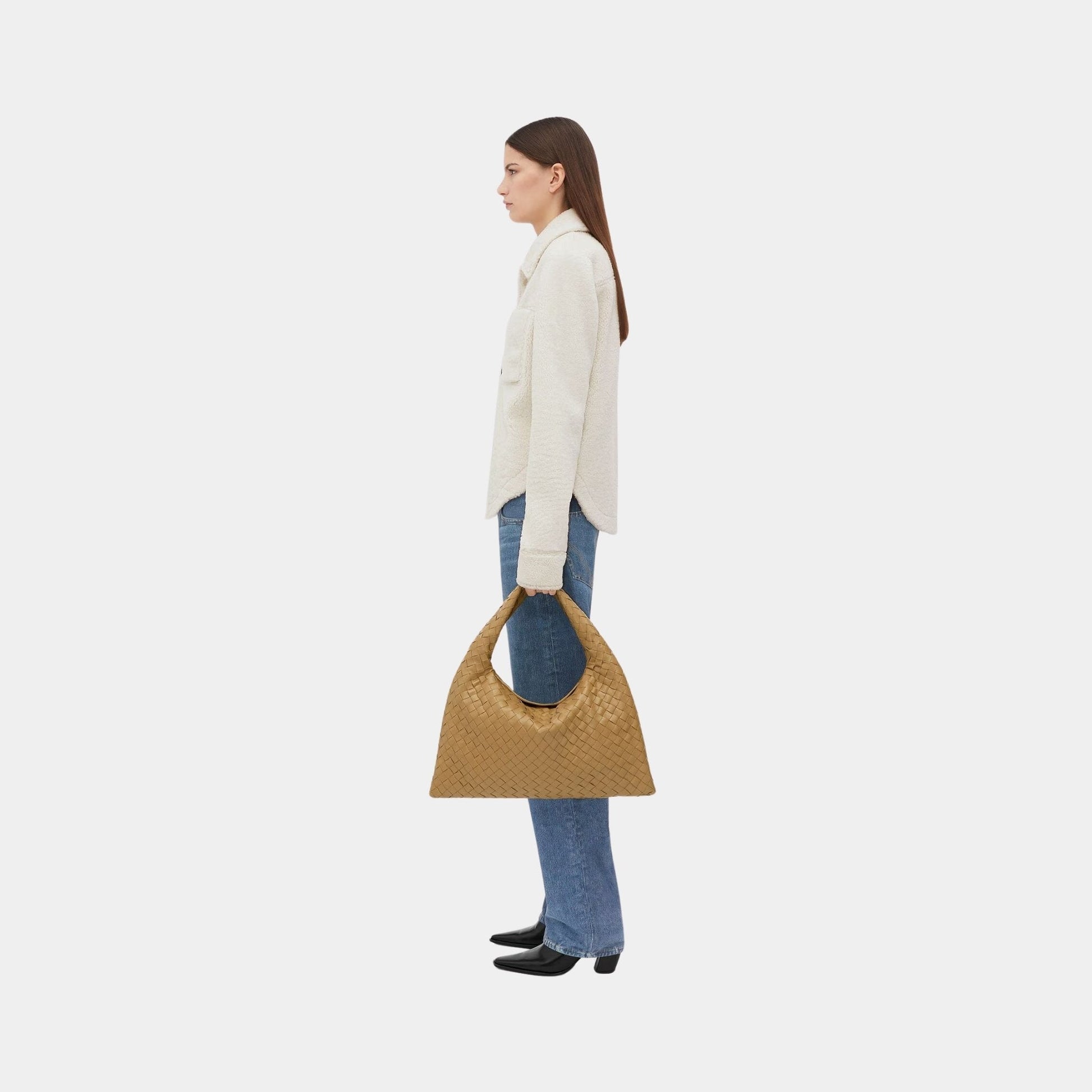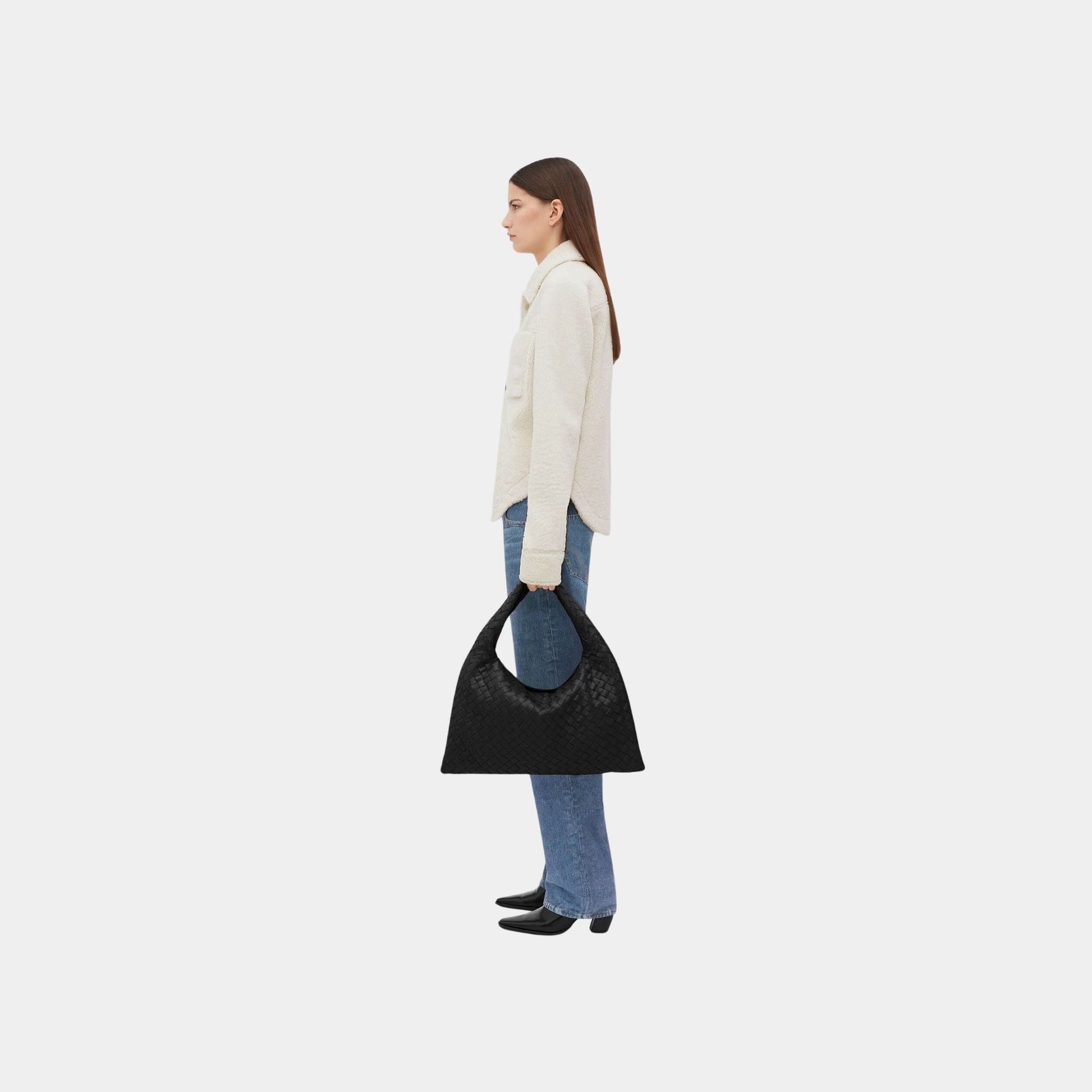 The Hop Bag exemplifies Bottega Veneta’s artisanal craftsmanship, featuring handwoven Intrecciato leather, which adds depth, texture, and a signature luxurious touch. The calfskin lining enhances the sumptuous feel of the interior, making this bag a statement of understated elegance.