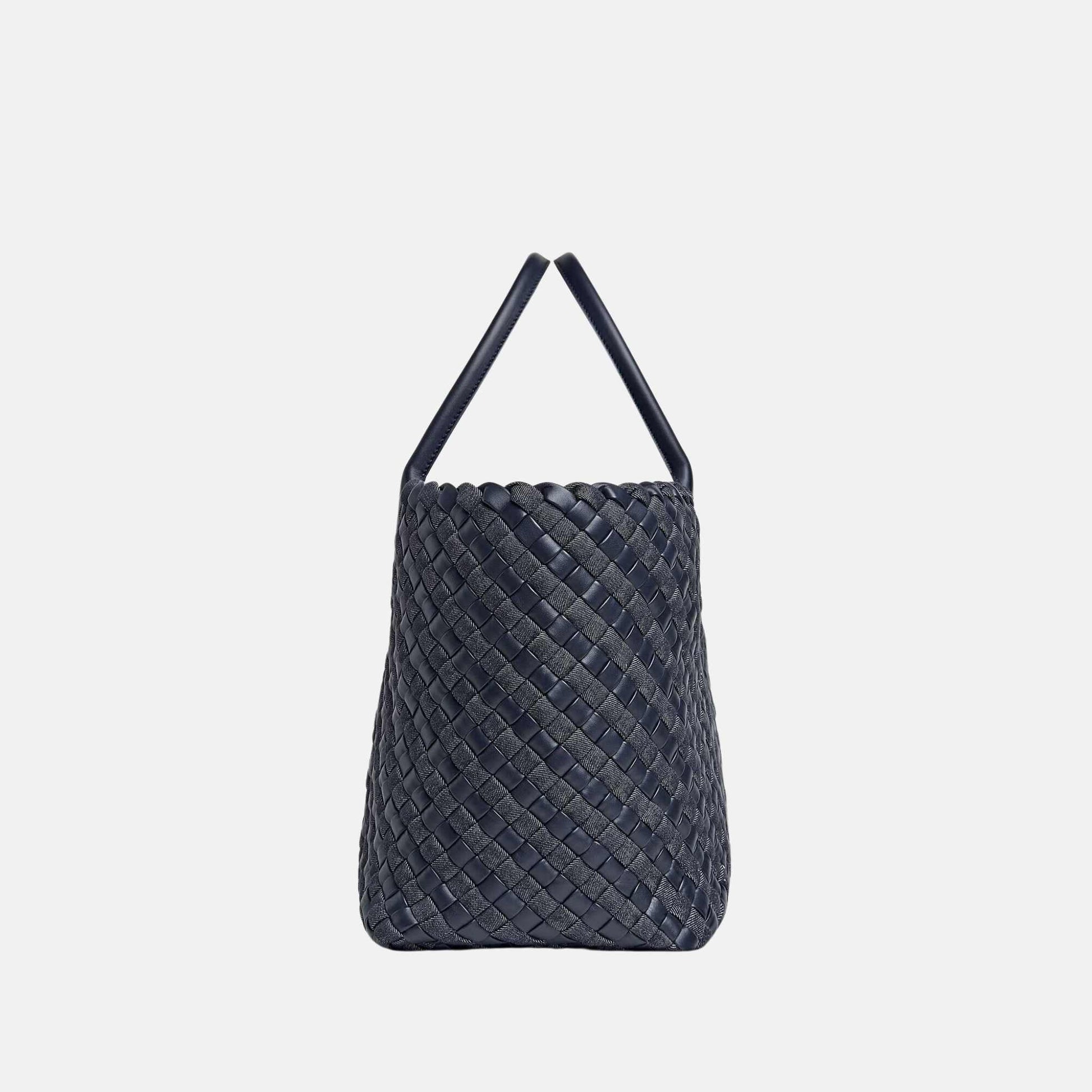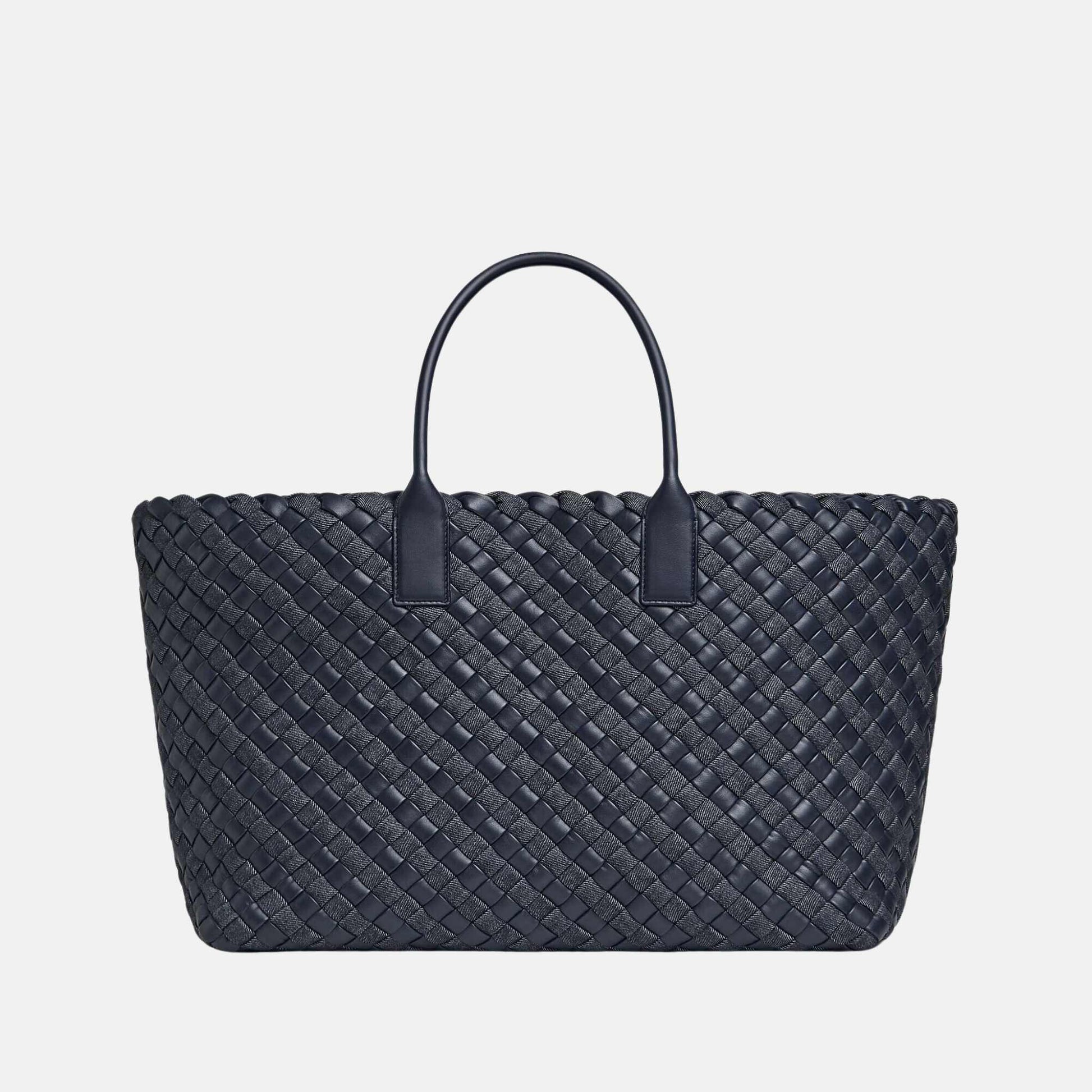 What sets this Cabat Tote apart is its innovative material combination—the plush nappa leather meets rugged denim in a padded Intreccio weave, delivering a bold yet sophisticated aesthetic. The detachable zipped pocket adds versatility, allowing you to keep essentials secure while maintaining the bag’s spacious, open-top silhouette.