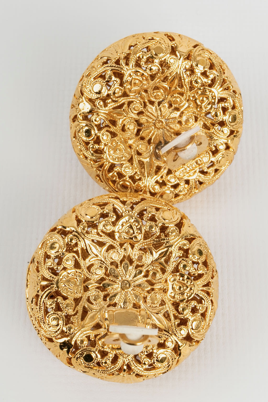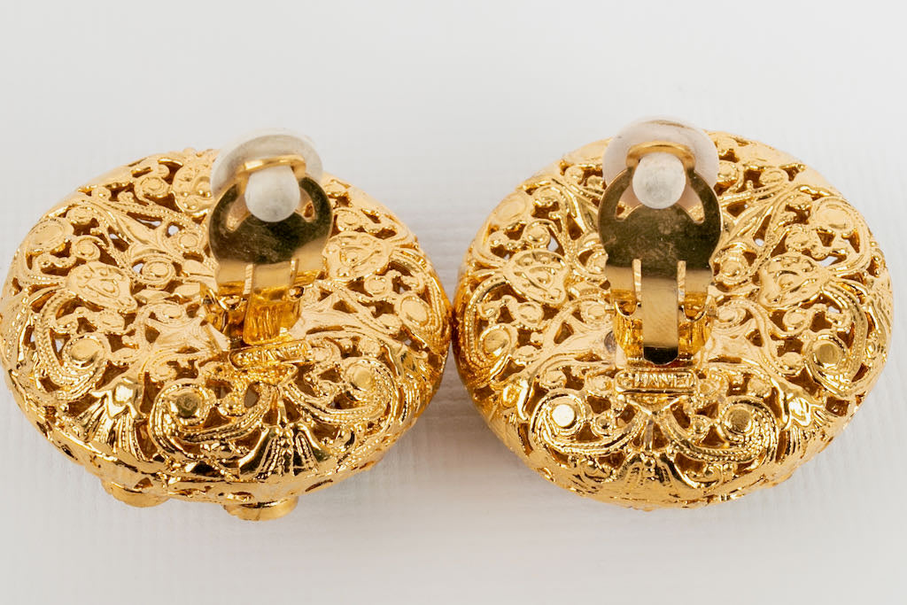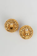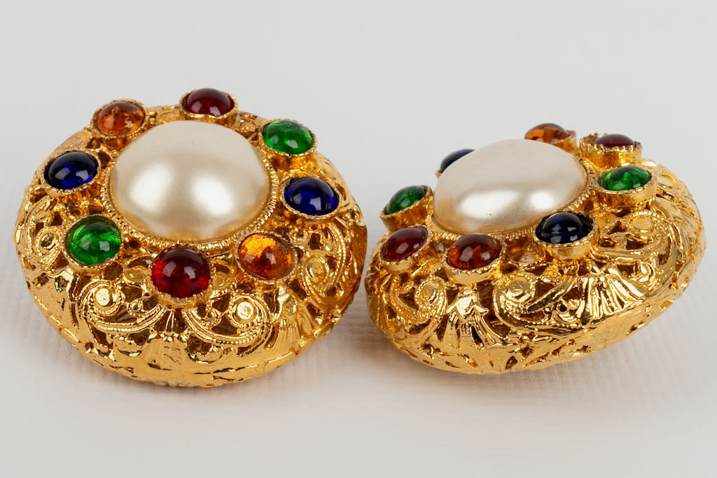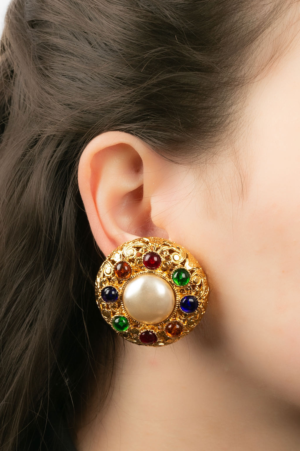 CHANEL -Boucles d'oreilles clips en m�tal dor� pav�es de cabochons multicolores et centr�es d'un cabochon nacr�.