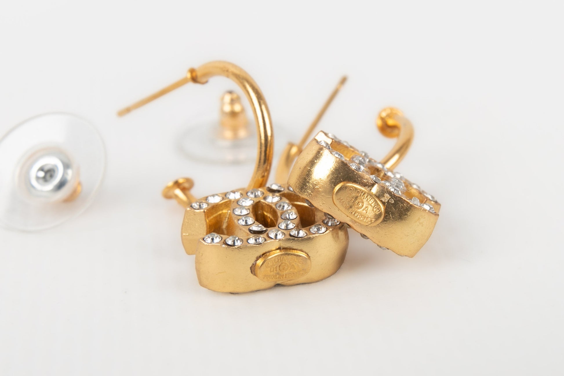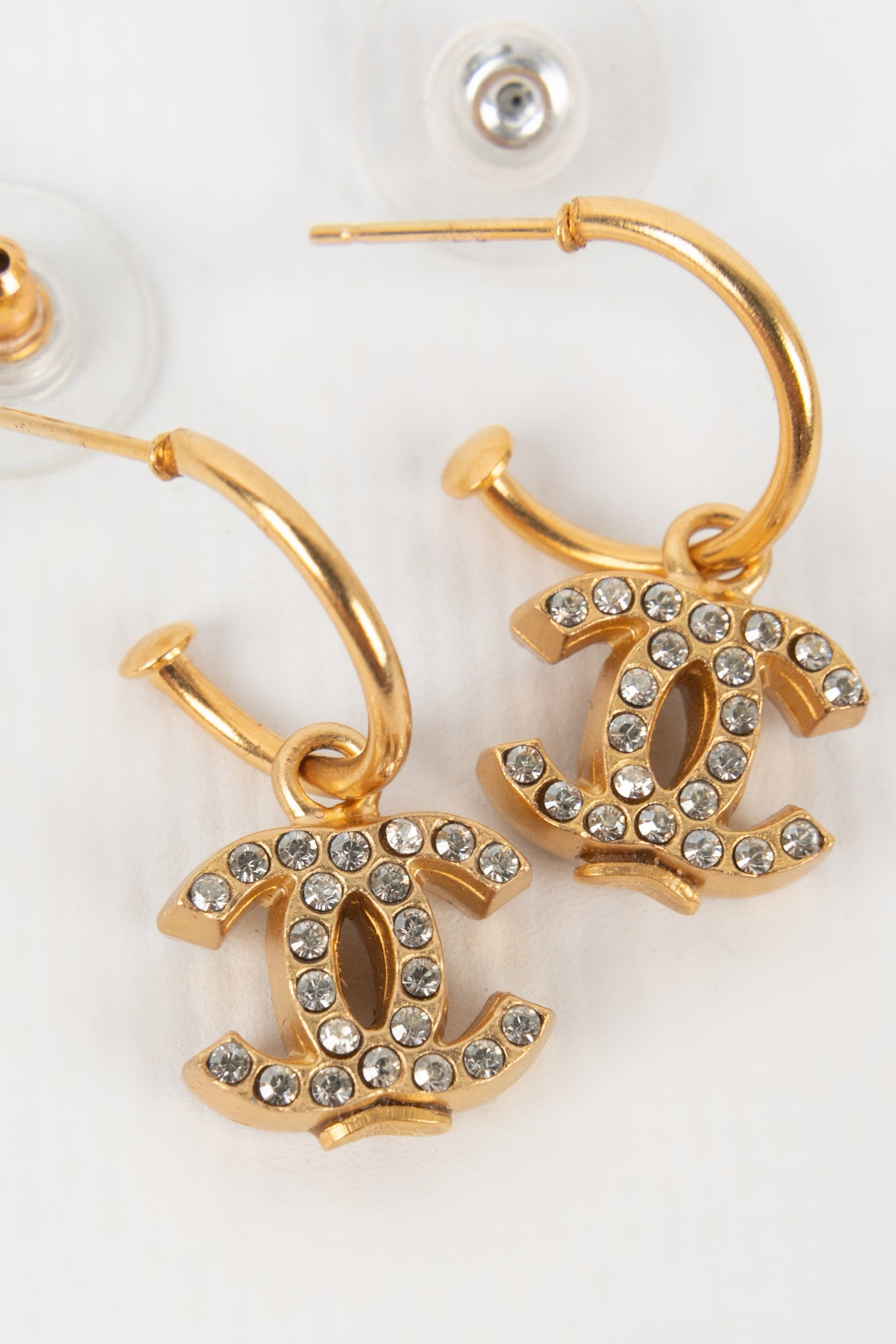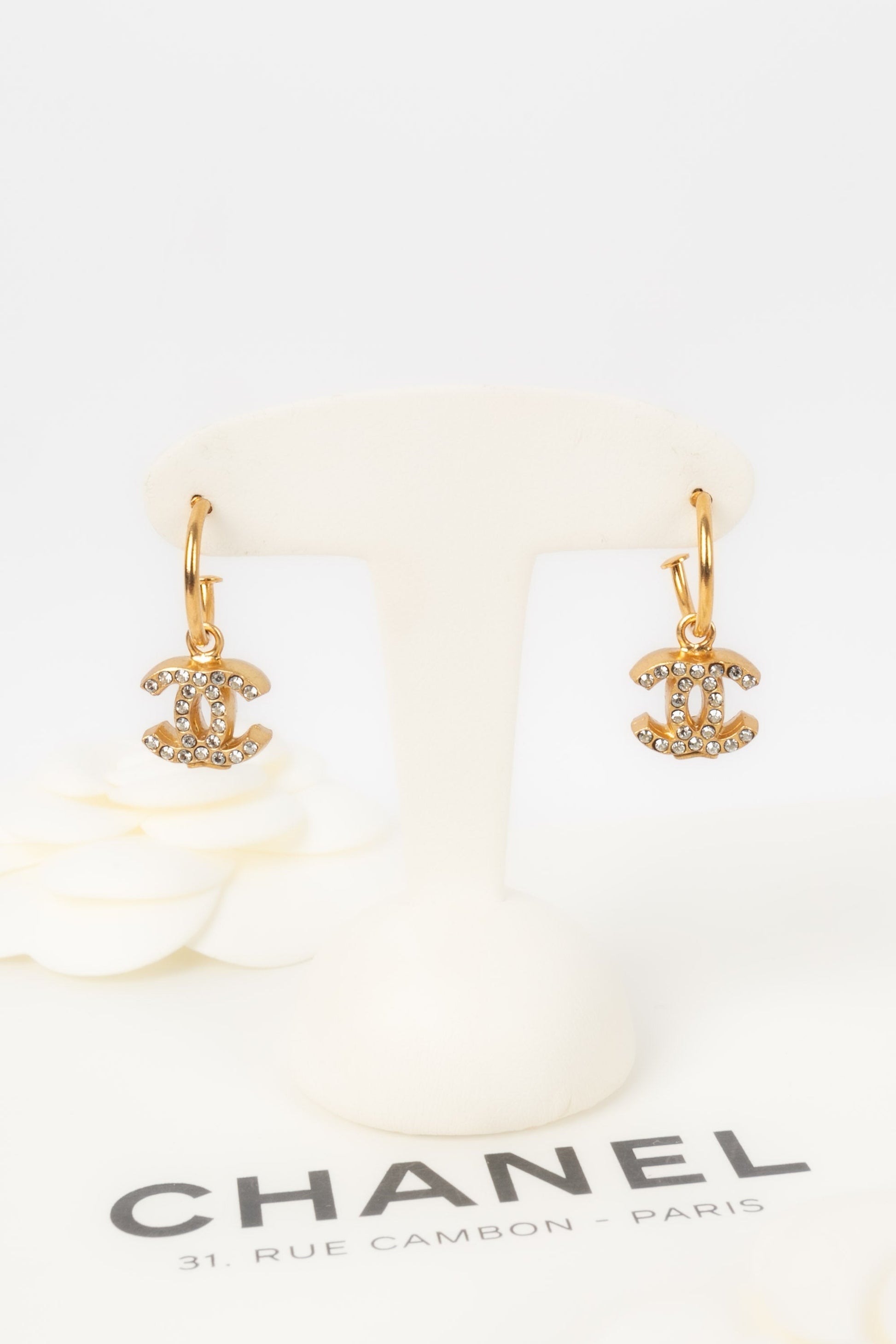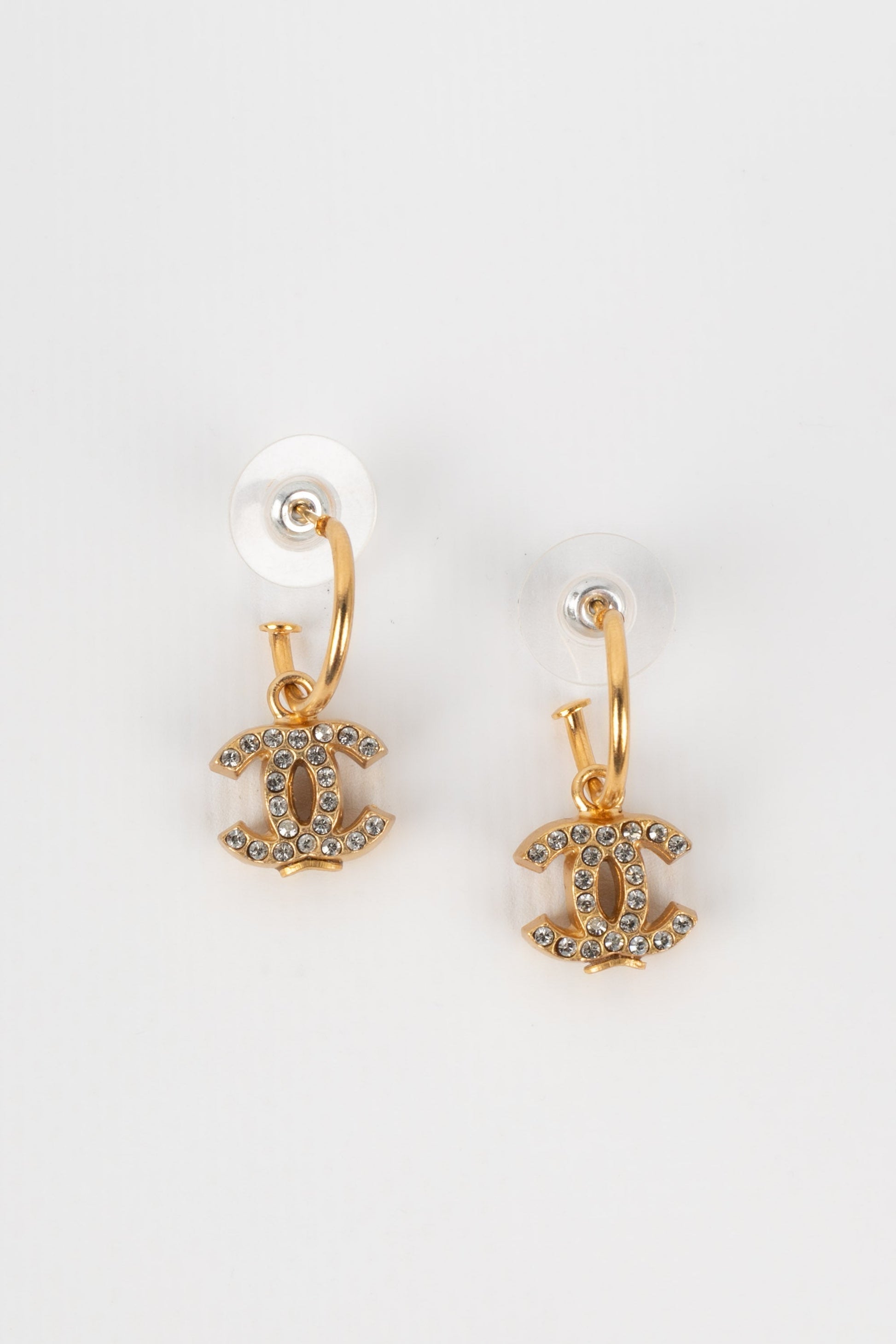 CHANEL - (Made in France) Boucles d'oreilles cc en métal doré pavées de strass de Swarovski. Collection Automne-Hiver 2001.