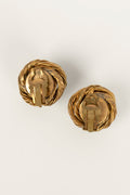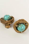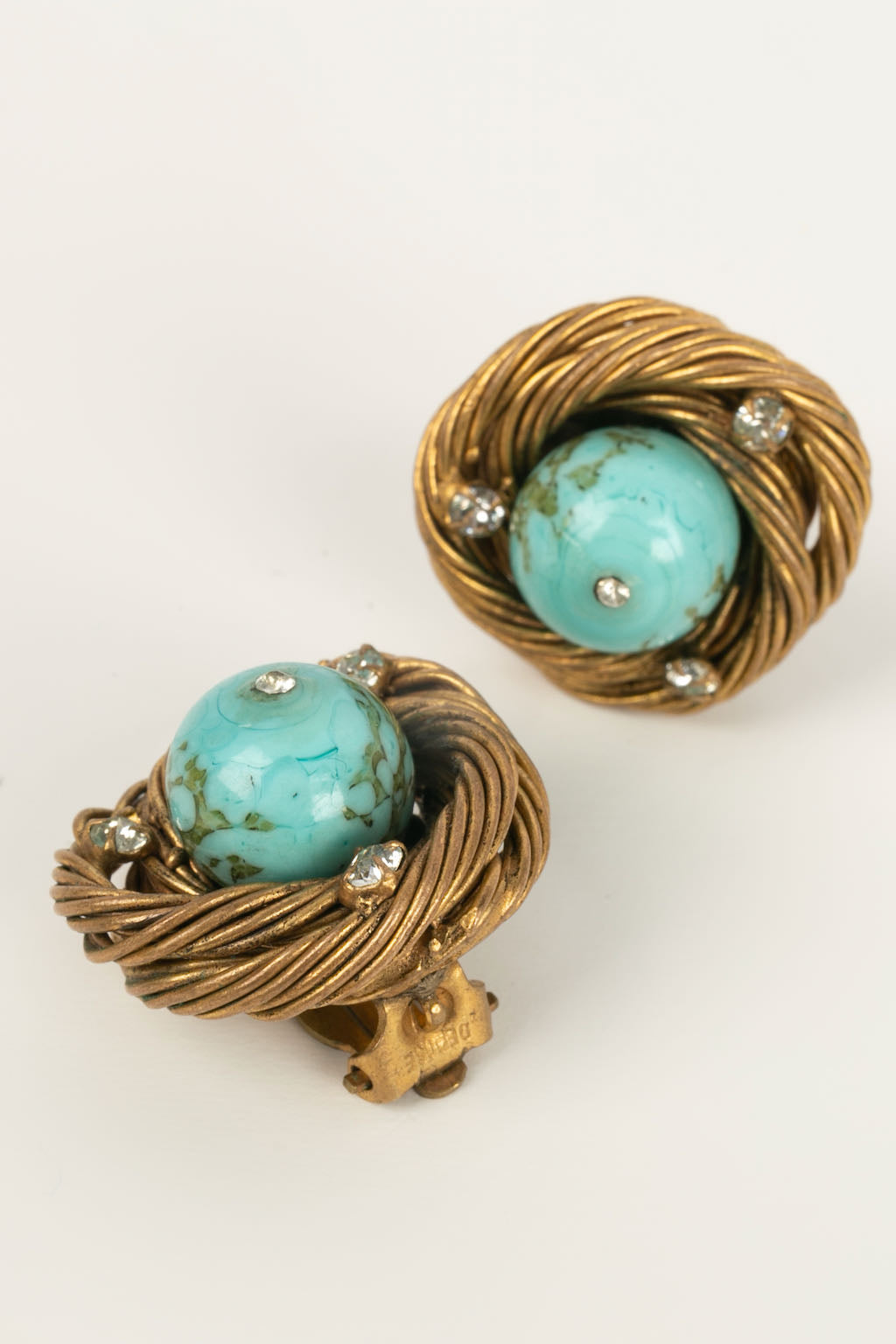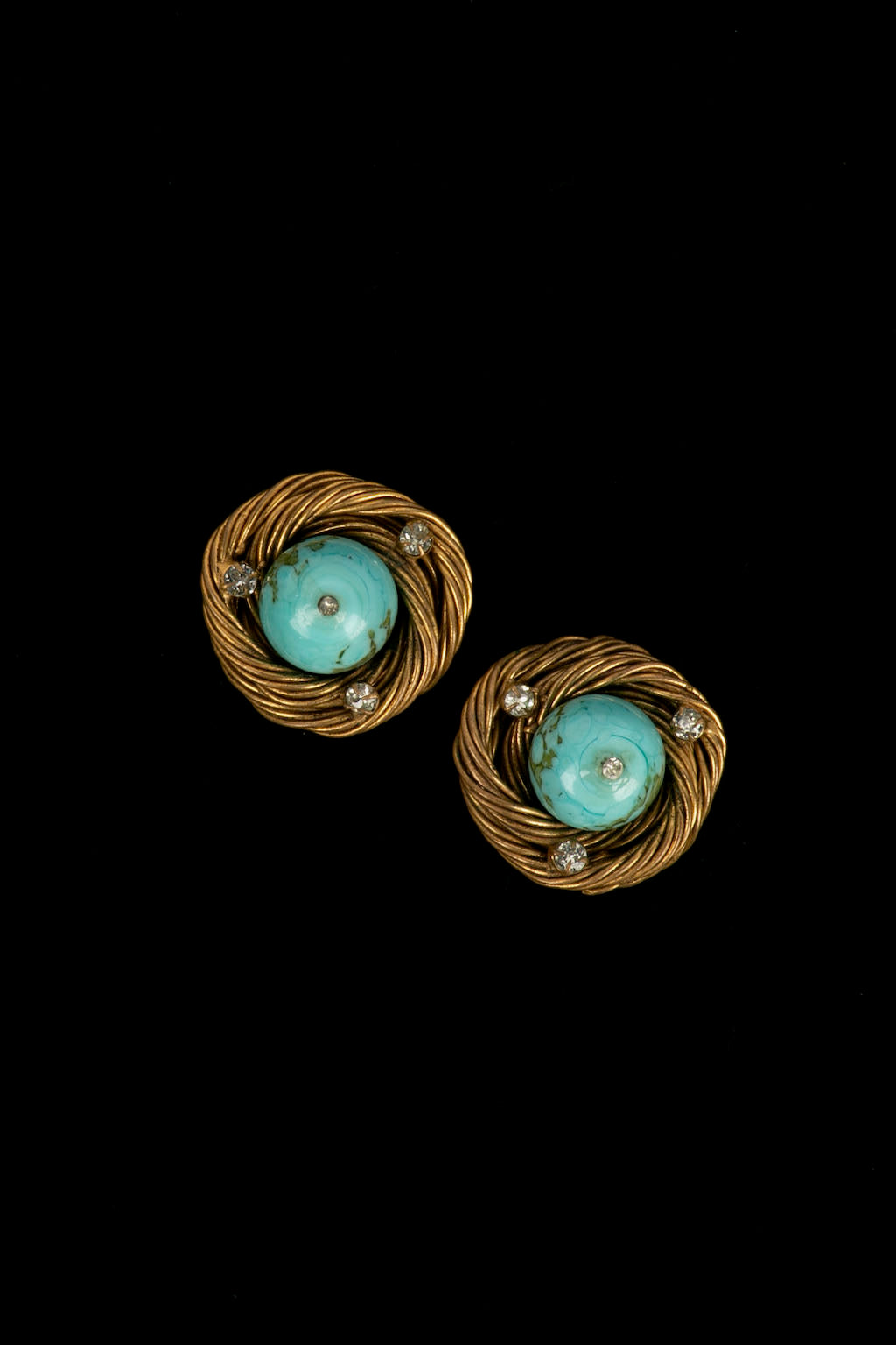 CHANEL -Boucles d'oreilles clips en m�tal dor� et strass, surmont�es d'une perle turquoise.