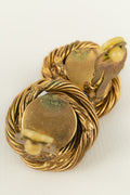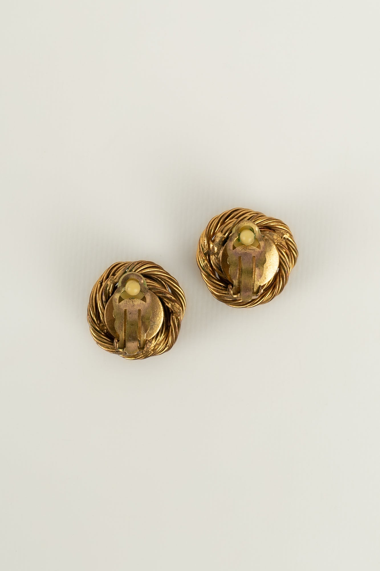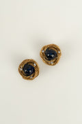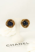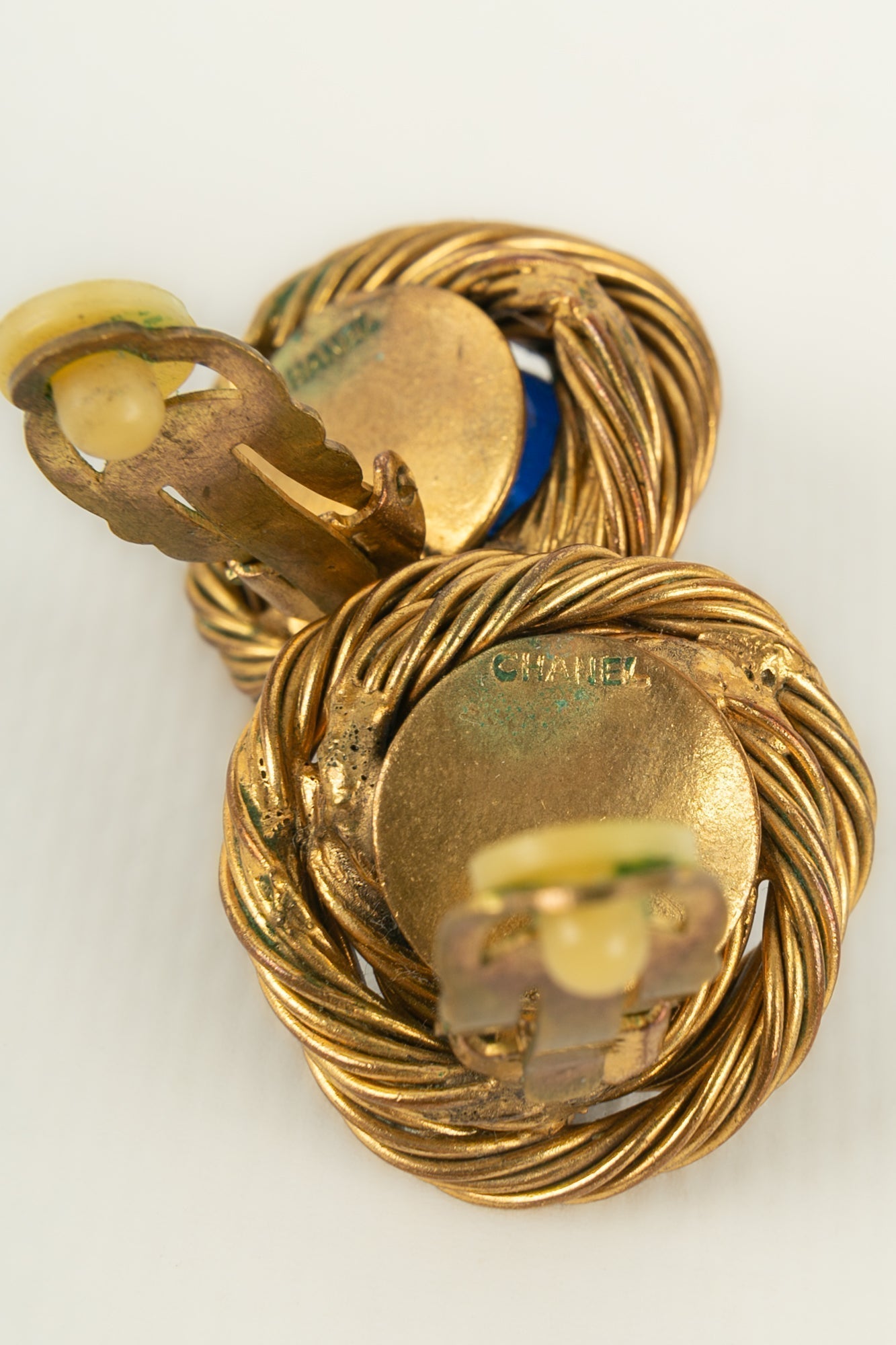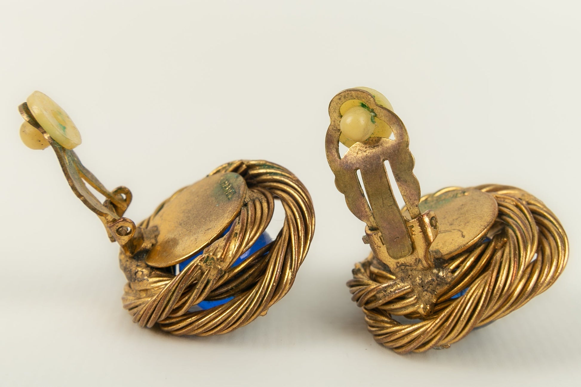 CHANEL - Boucles d'oreilles en m�tal dor�, p�te de verre bleu et strass de Swarovski. Bijou datant des ann�es 1980.