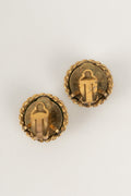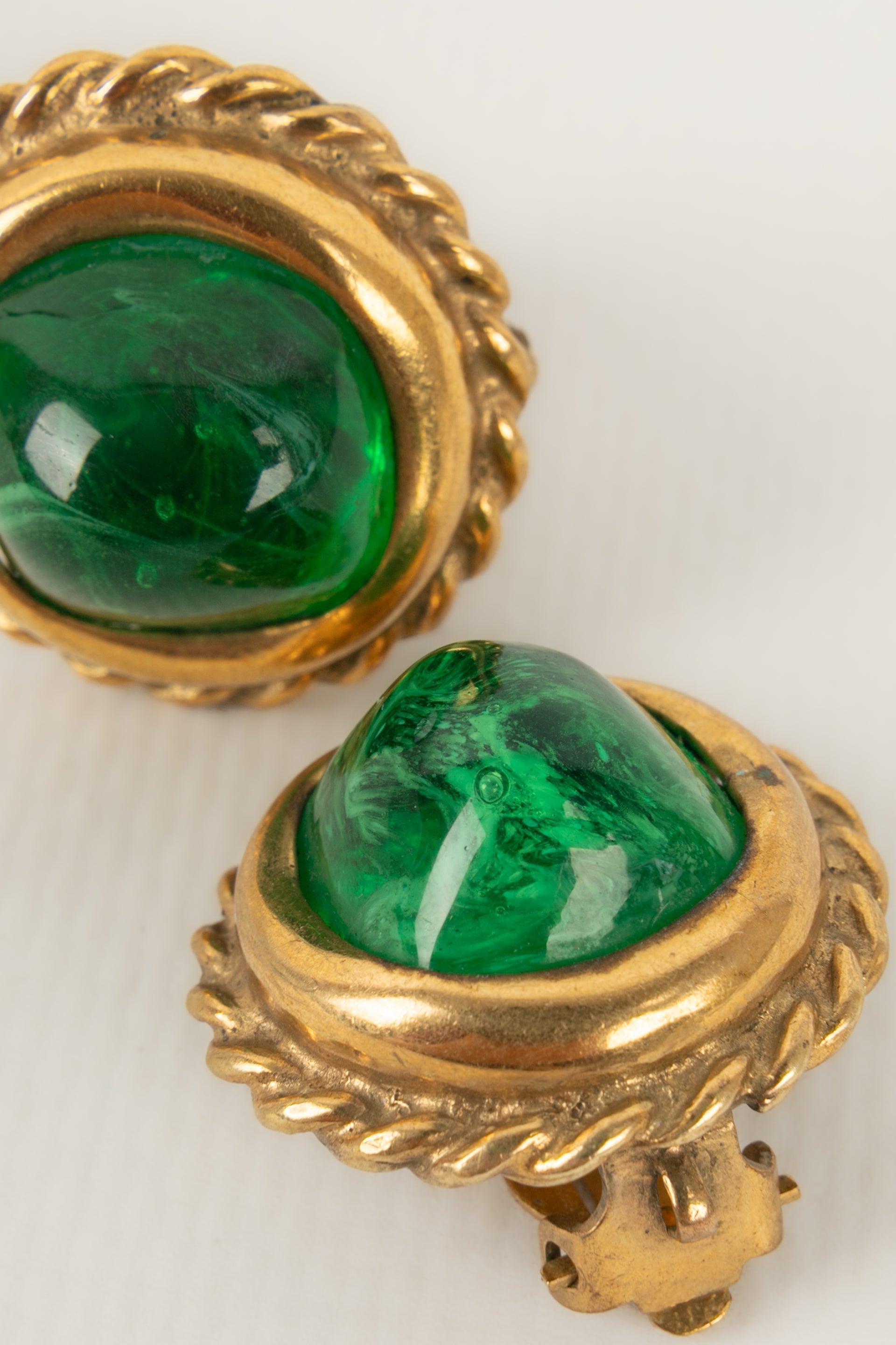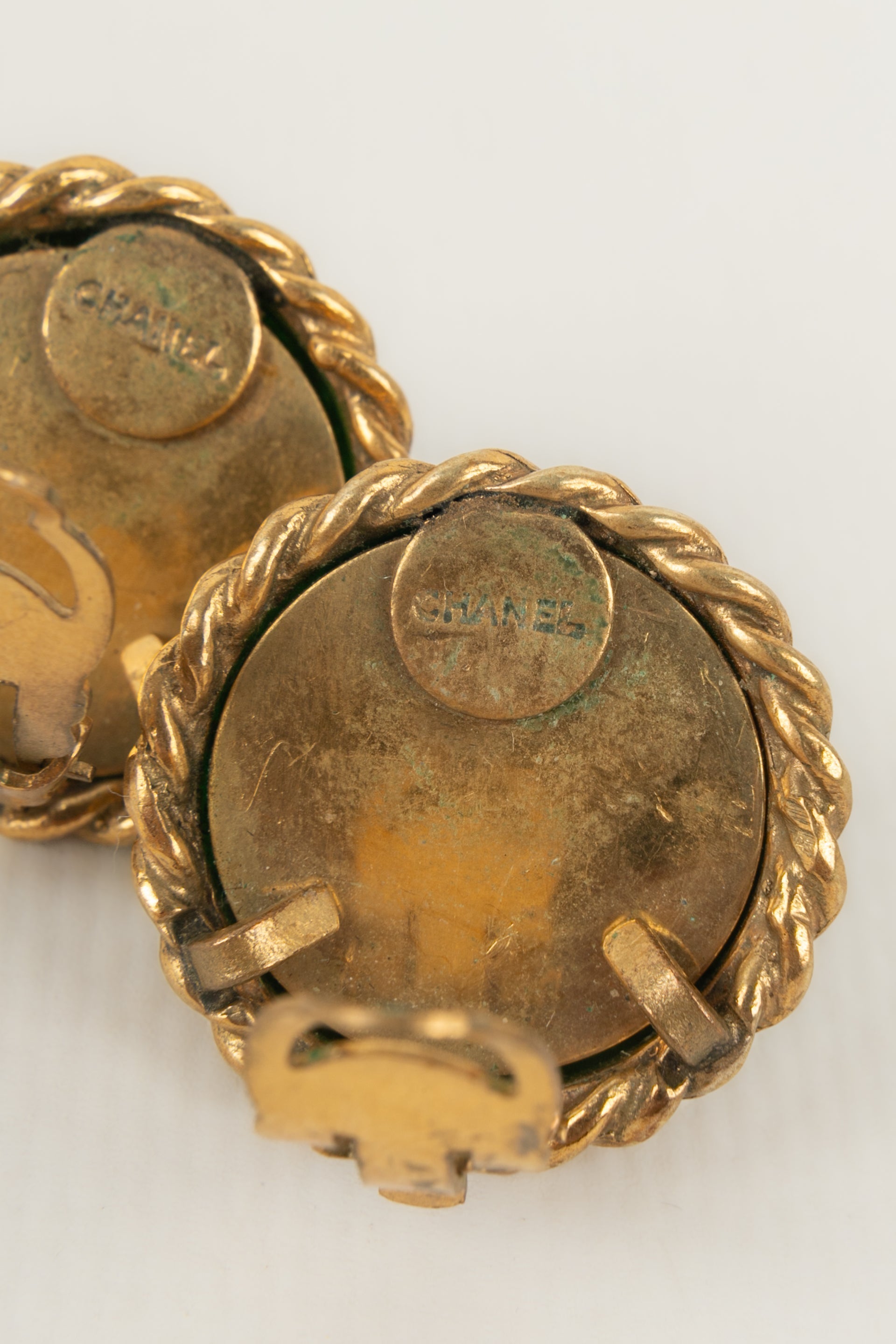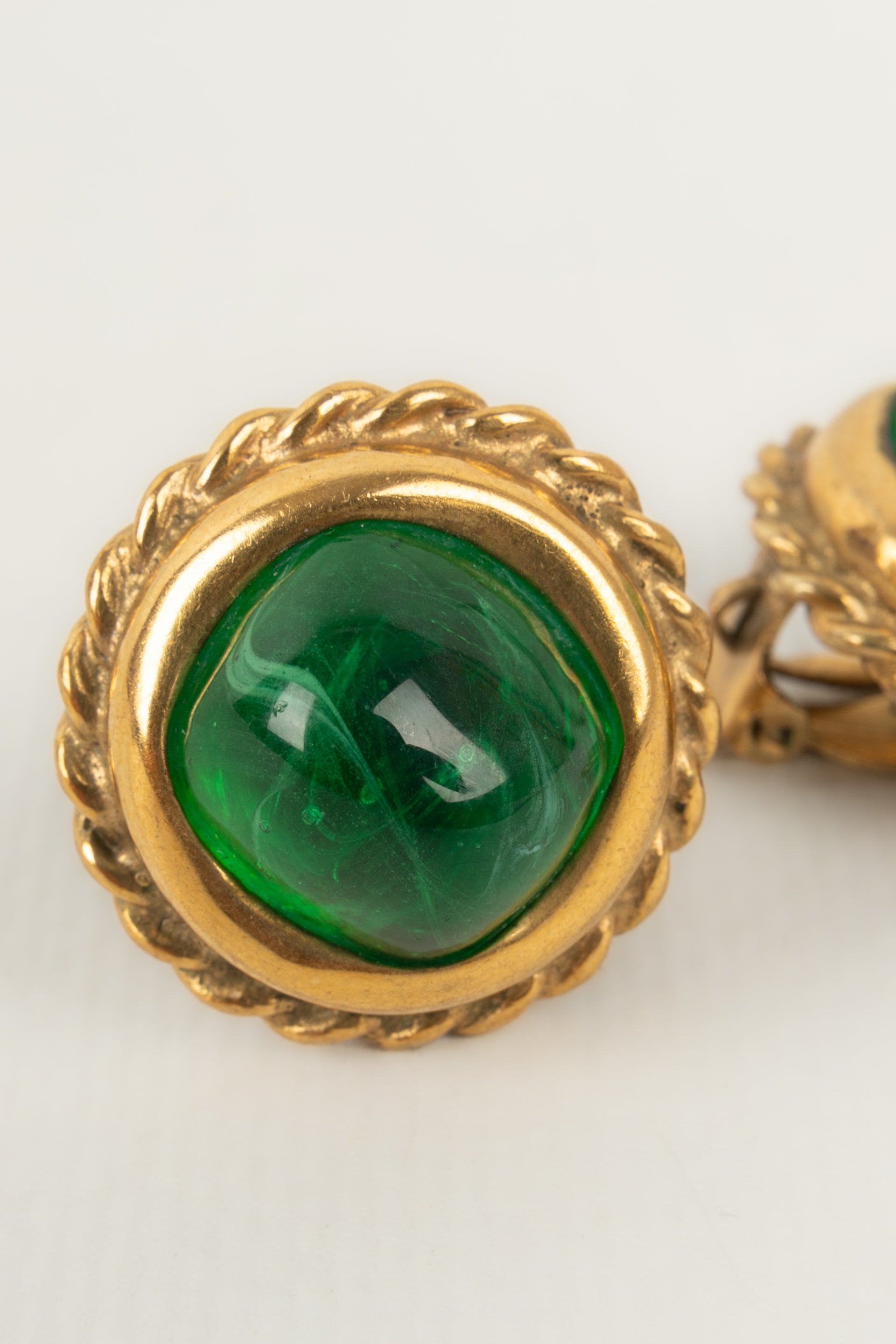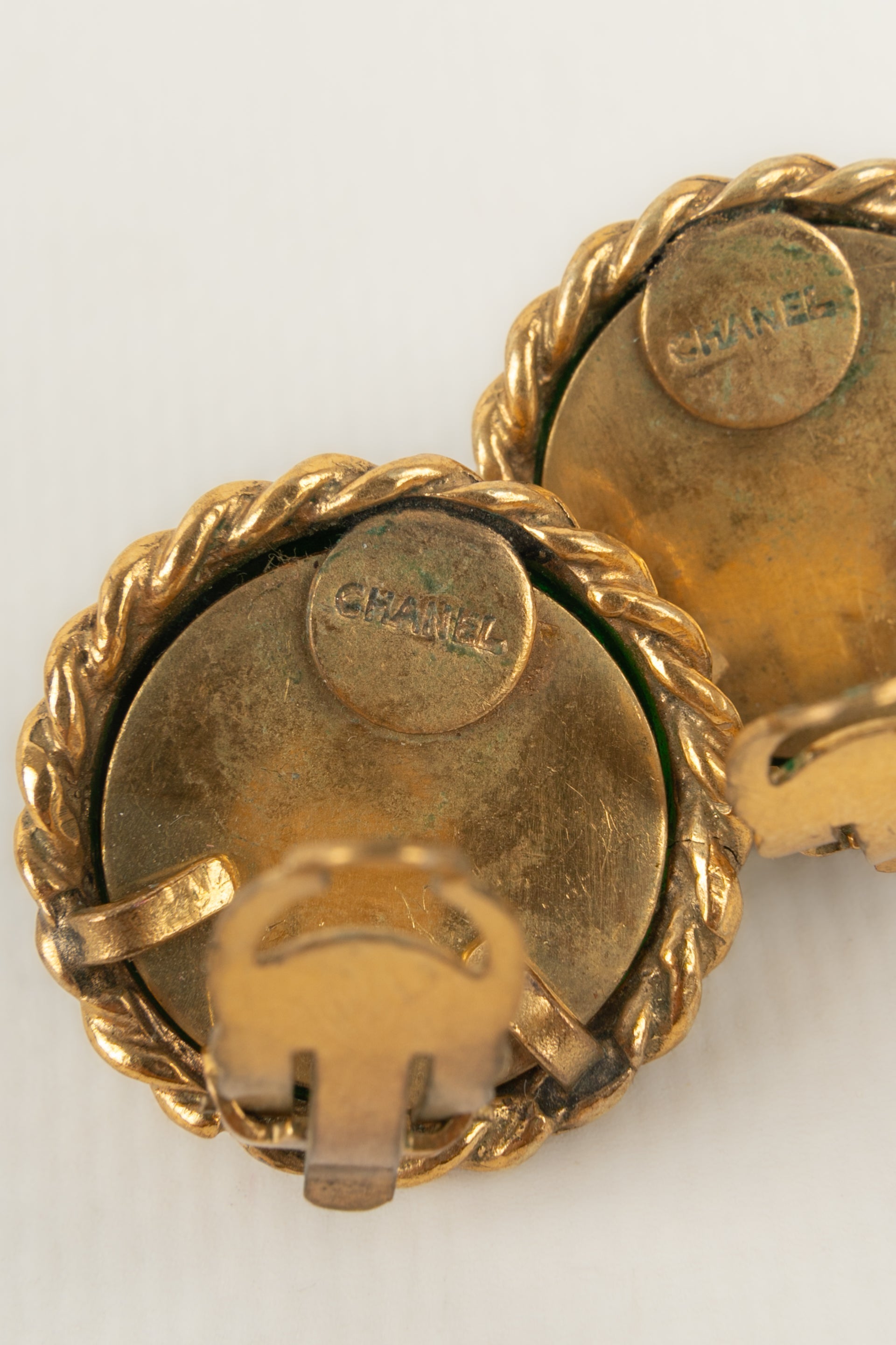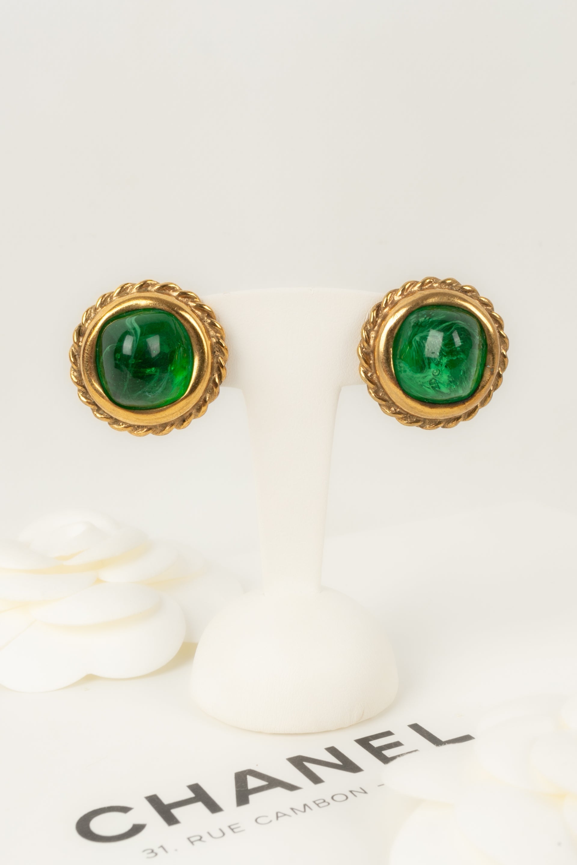 CHANEL - Boucles d'oreilles en métal doré et cabochon en pâte de verre.