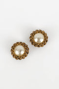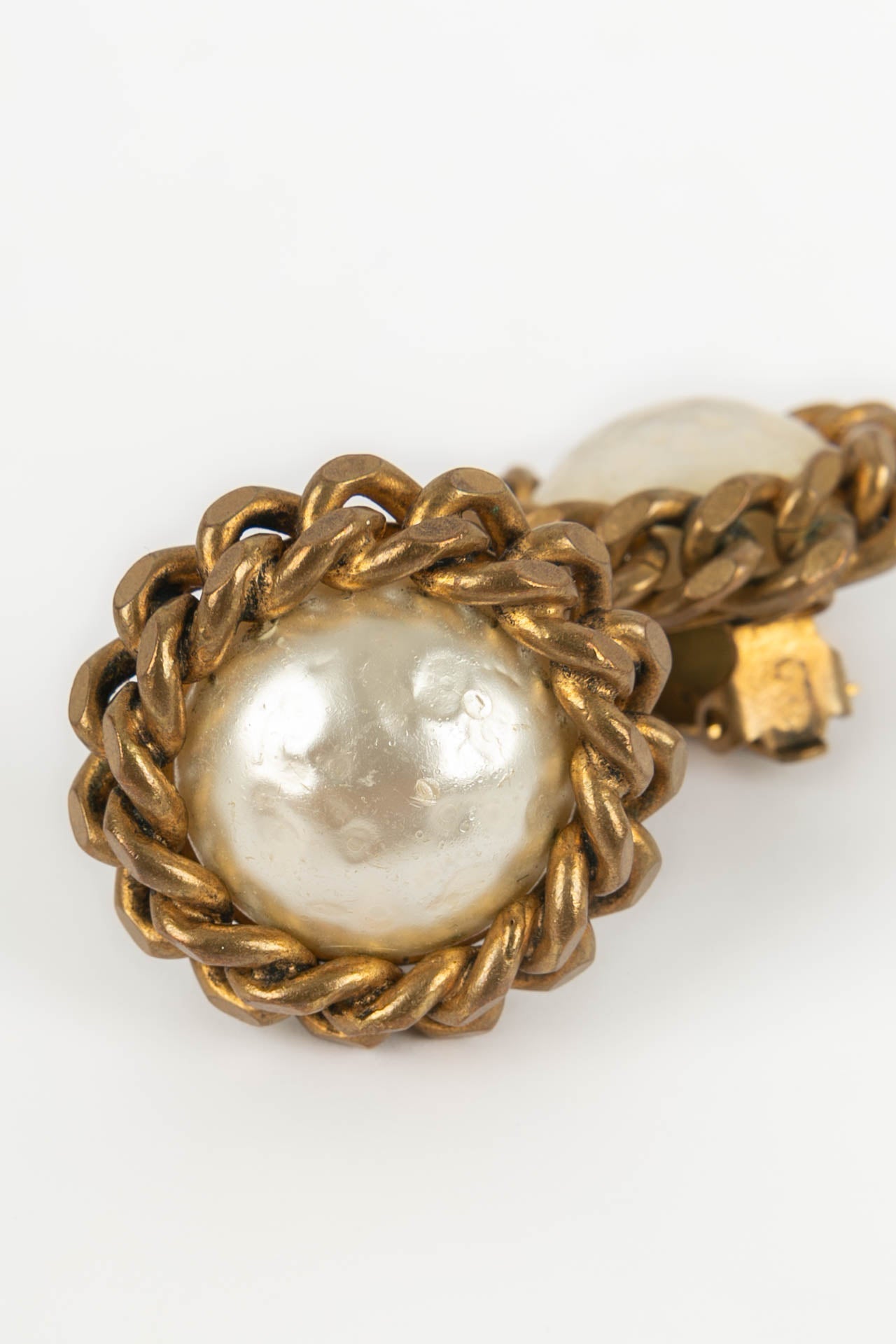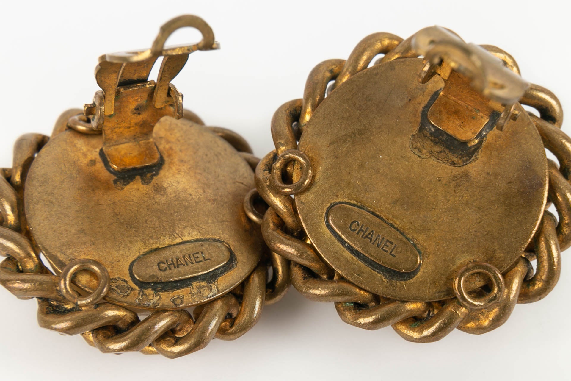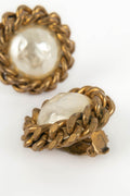 CHANEL - Boucles d'oreilles clips en m�tal dor� et cabochon nacr�.