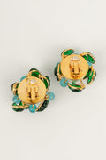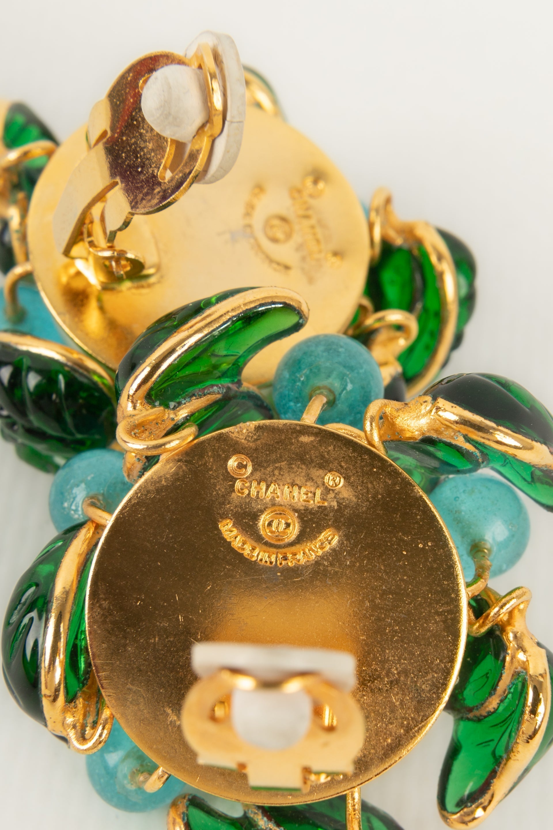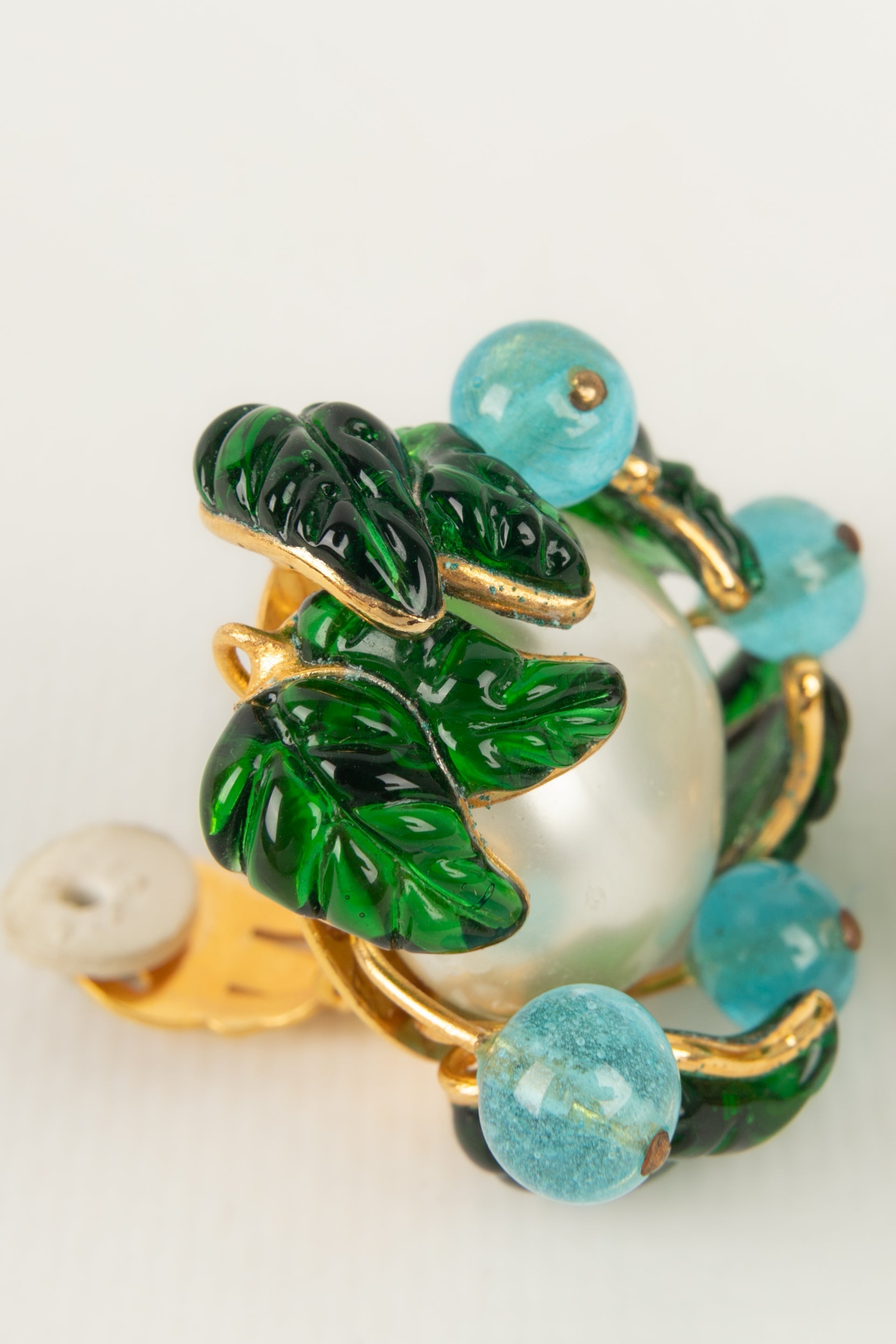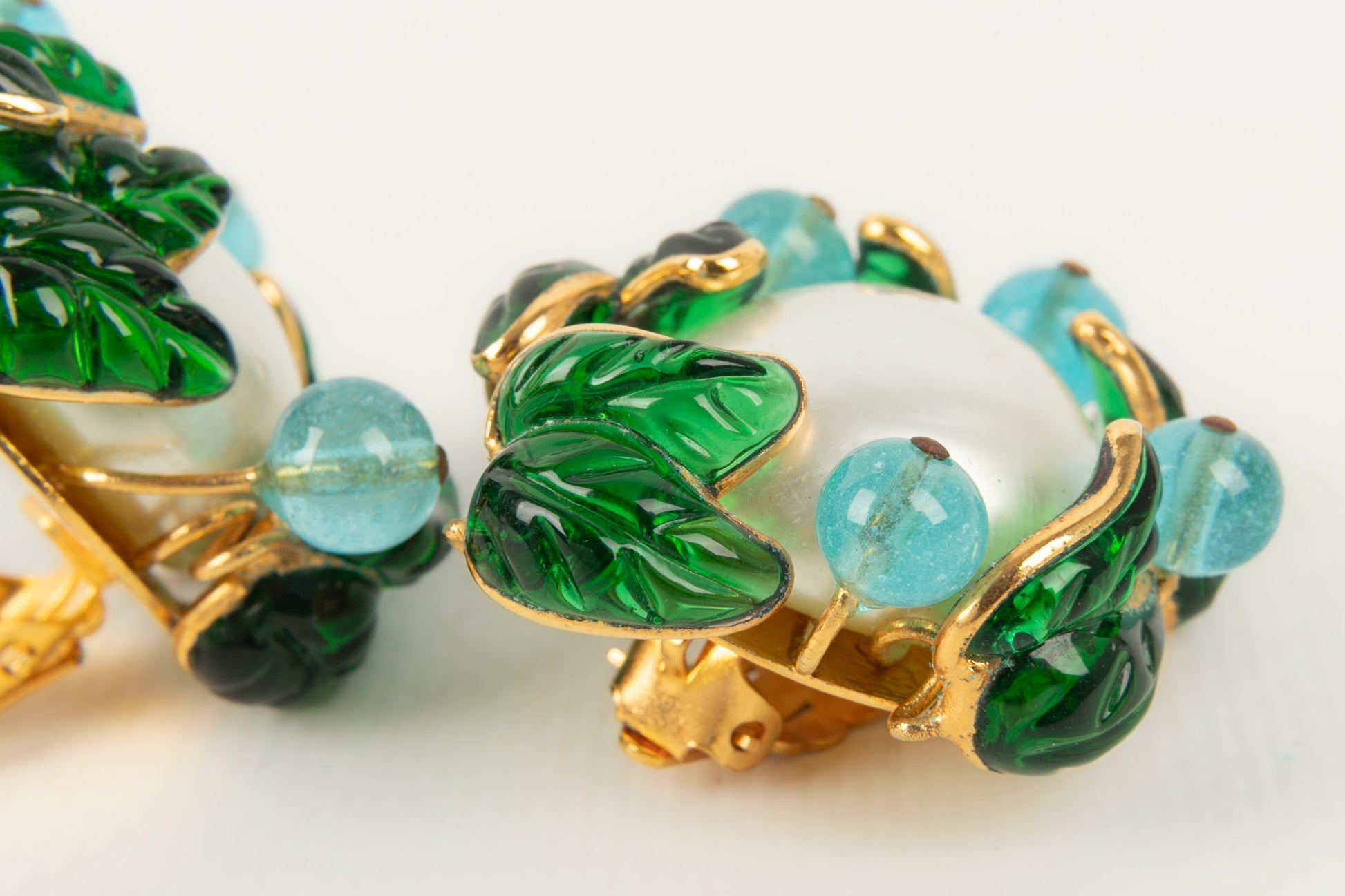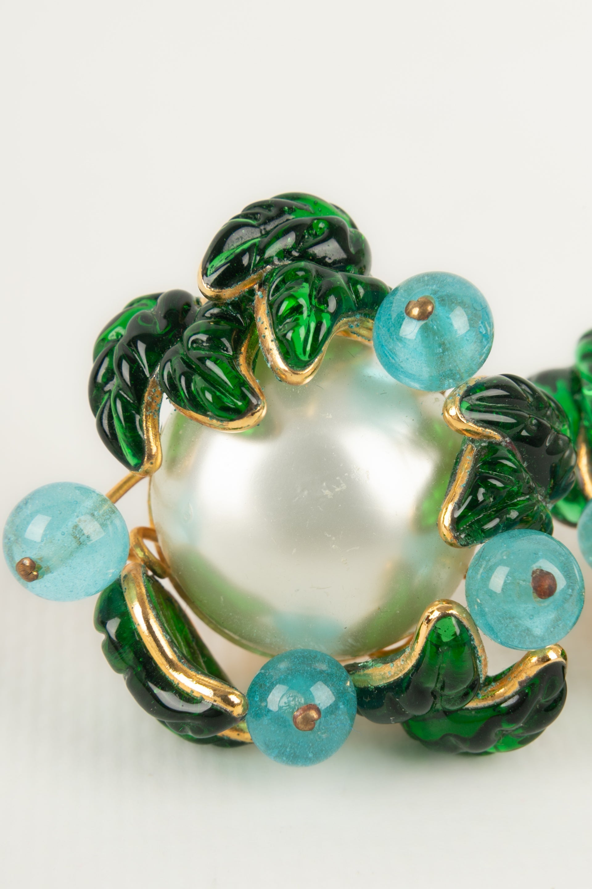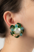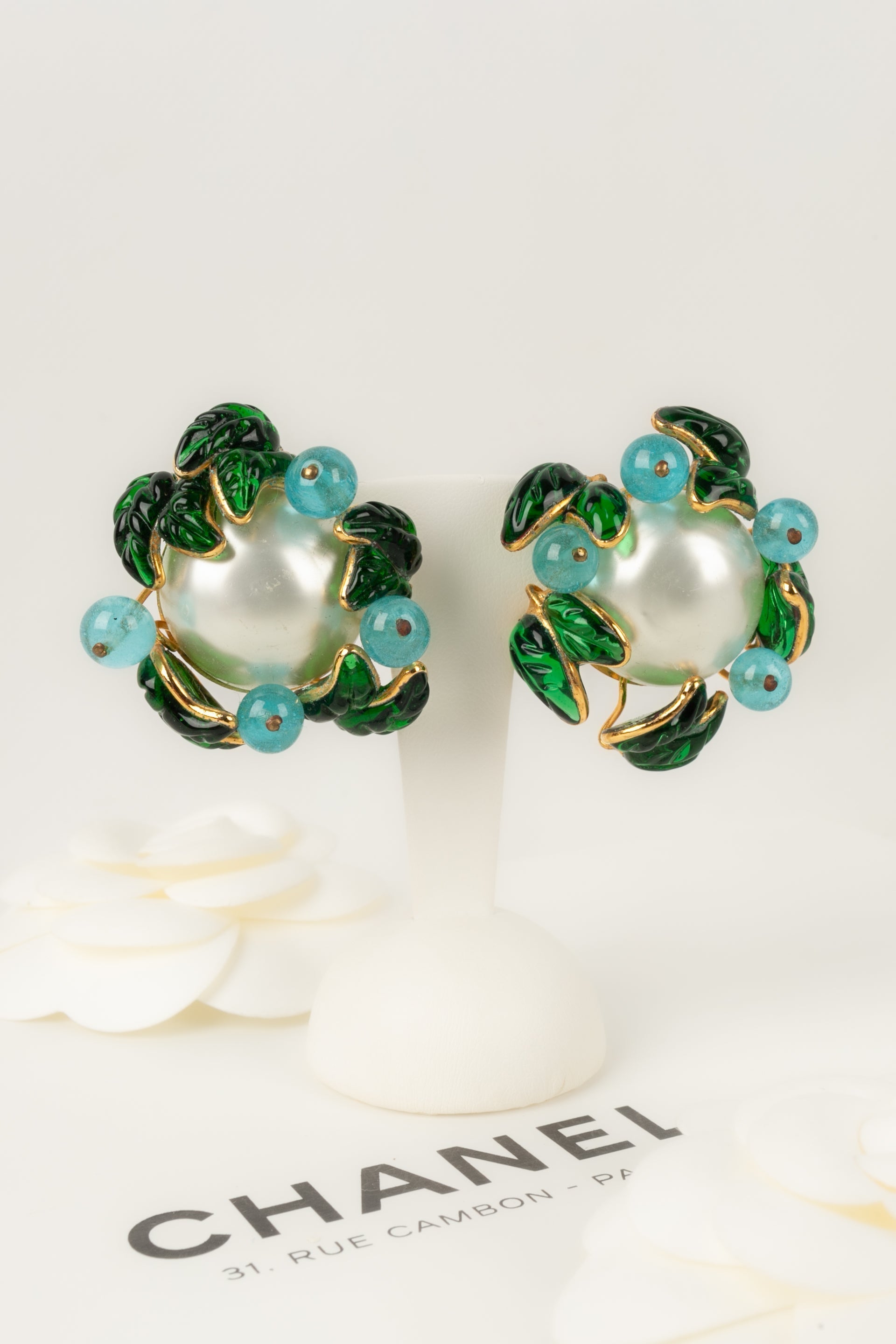 CHANEL - (Made in France) Boucles d'oreilles en métal doré, pâte de verre et cabochon nacré.