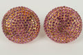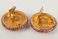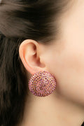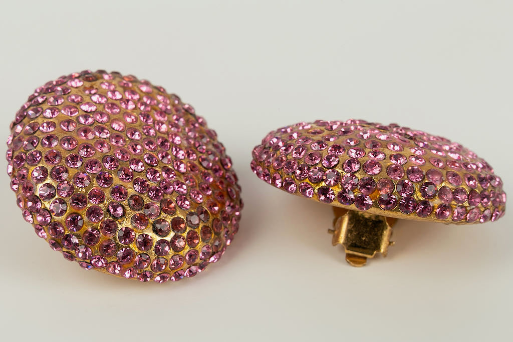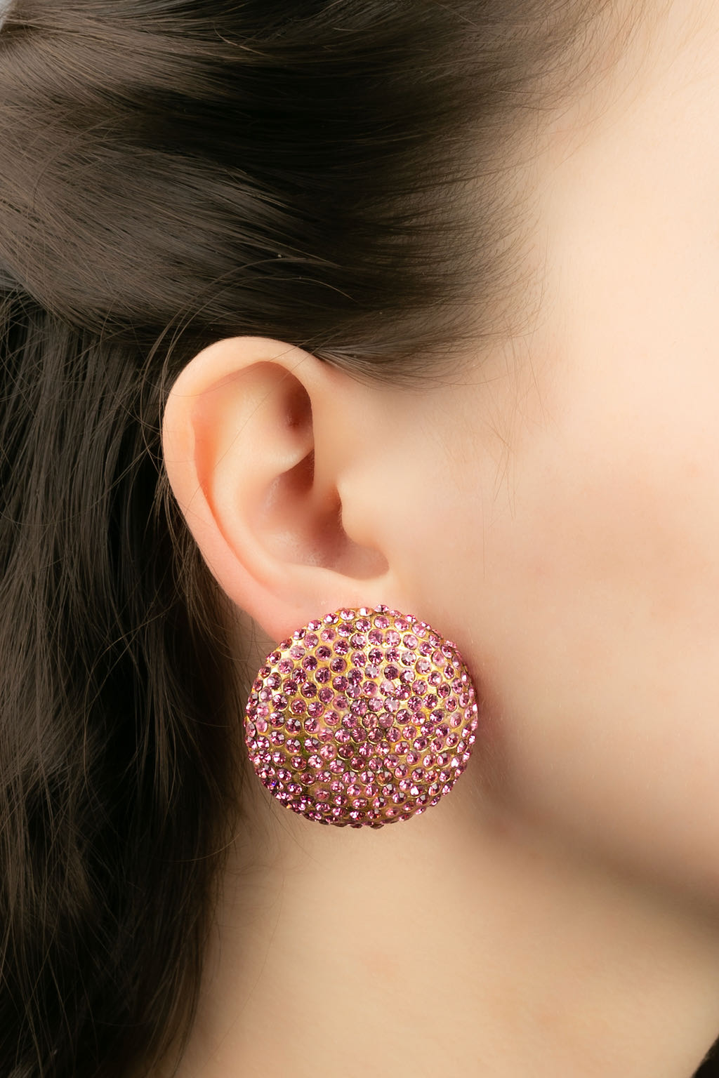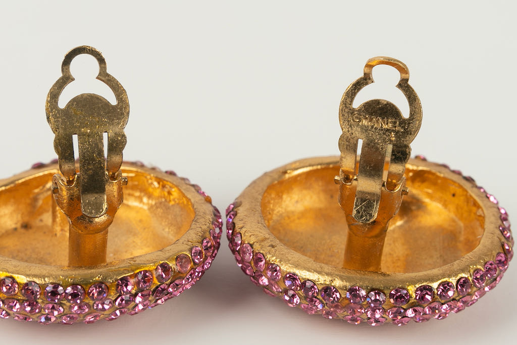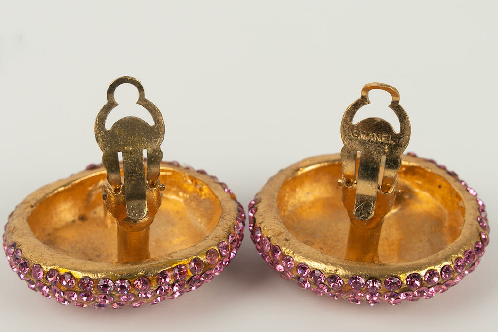 CHANEL -Boucles d'oreilles clips de forme ronde en m�tal dor� pav�es de strass roses. Seule une des deux boucles d'oreilles est sign�e.
