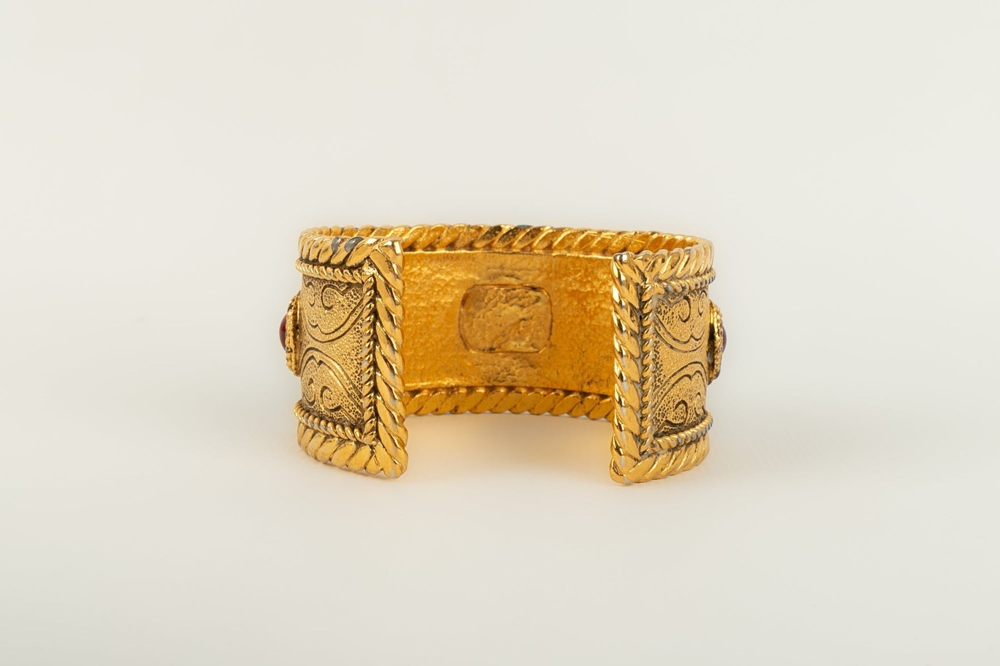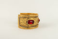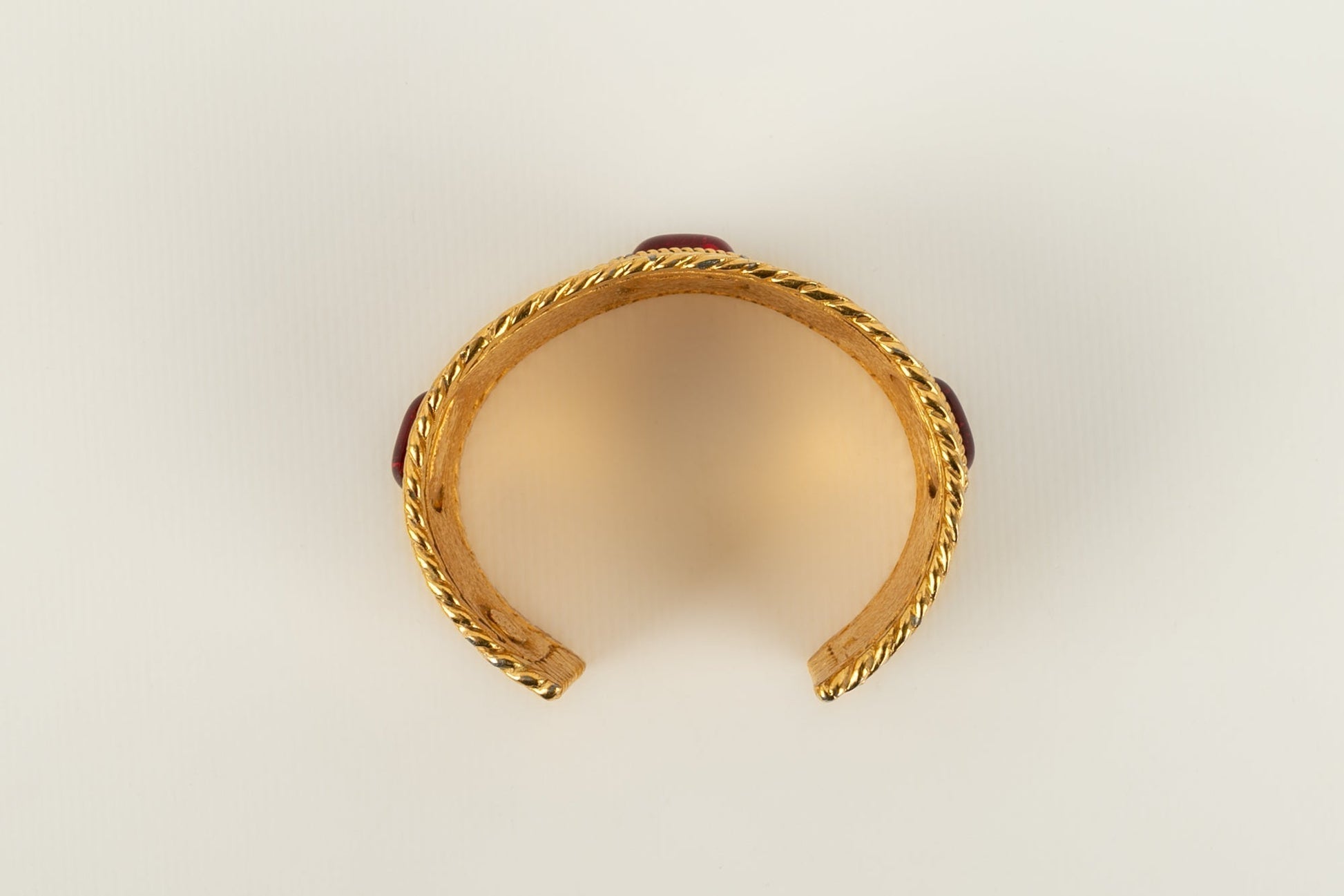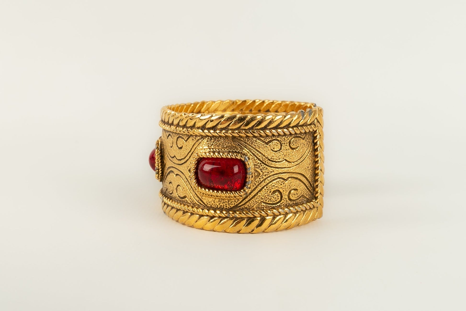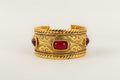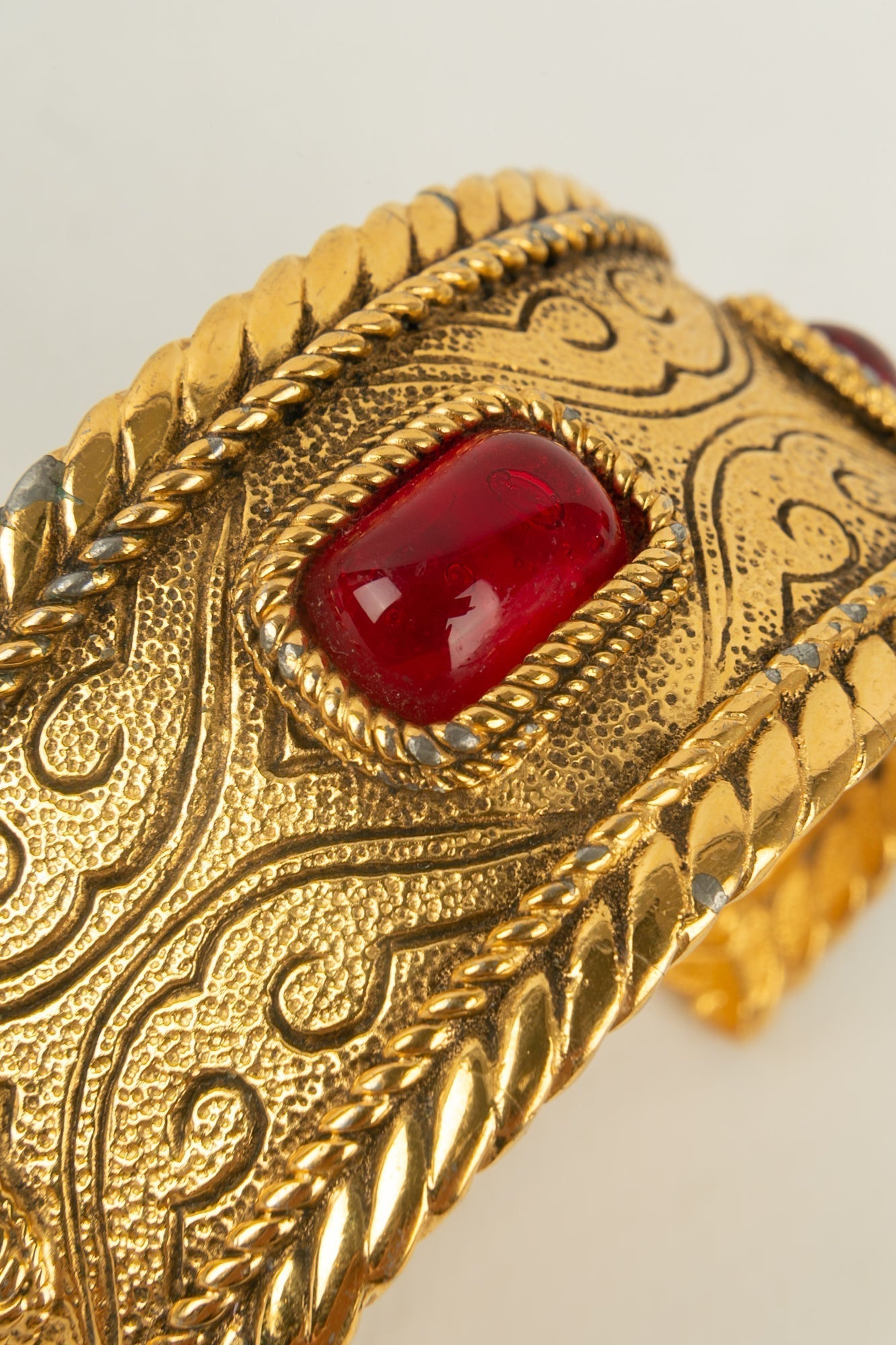 CHANEL -Bracelet en m�tal dor� et p�te de verre rouge. Collection 1985.