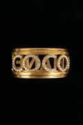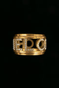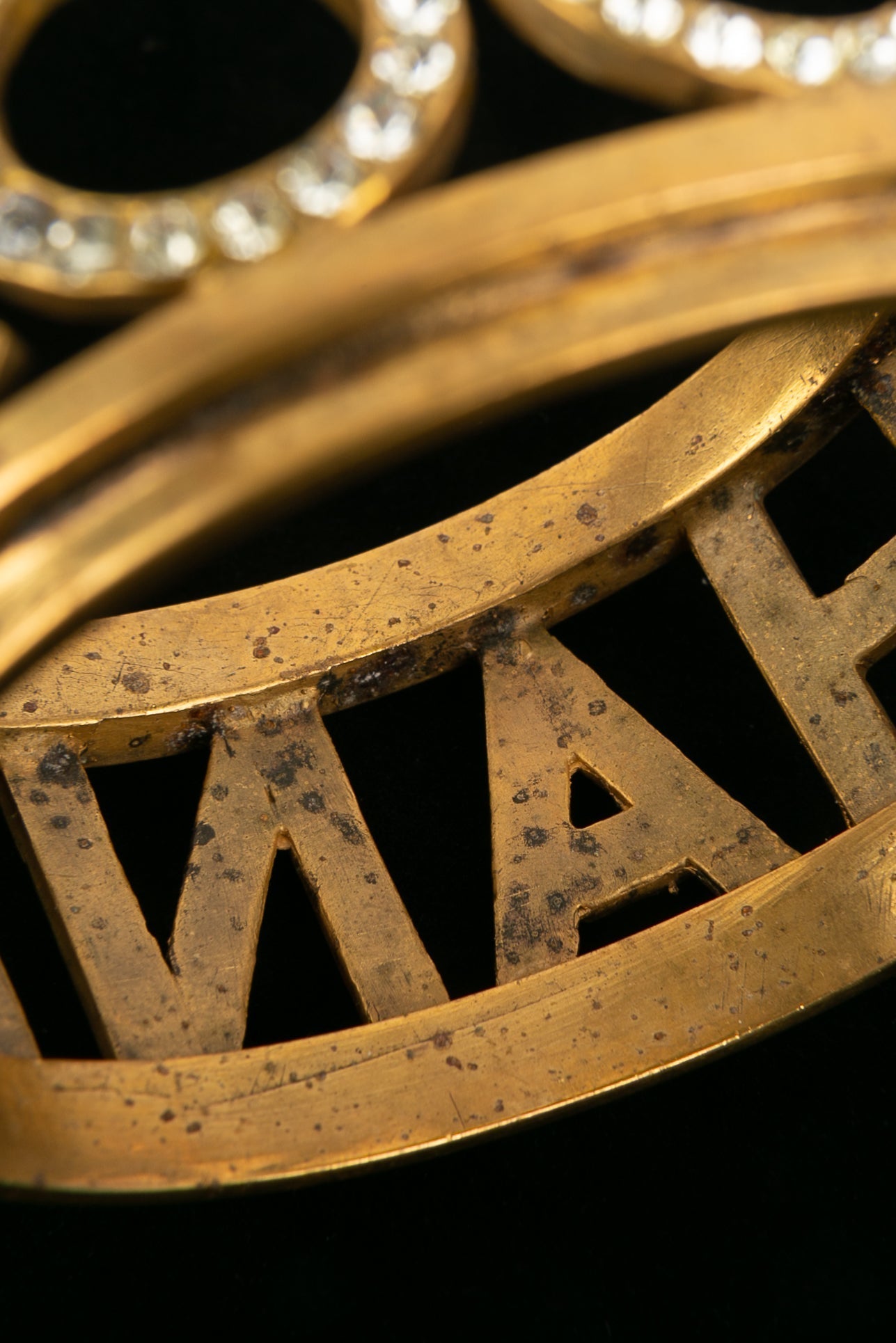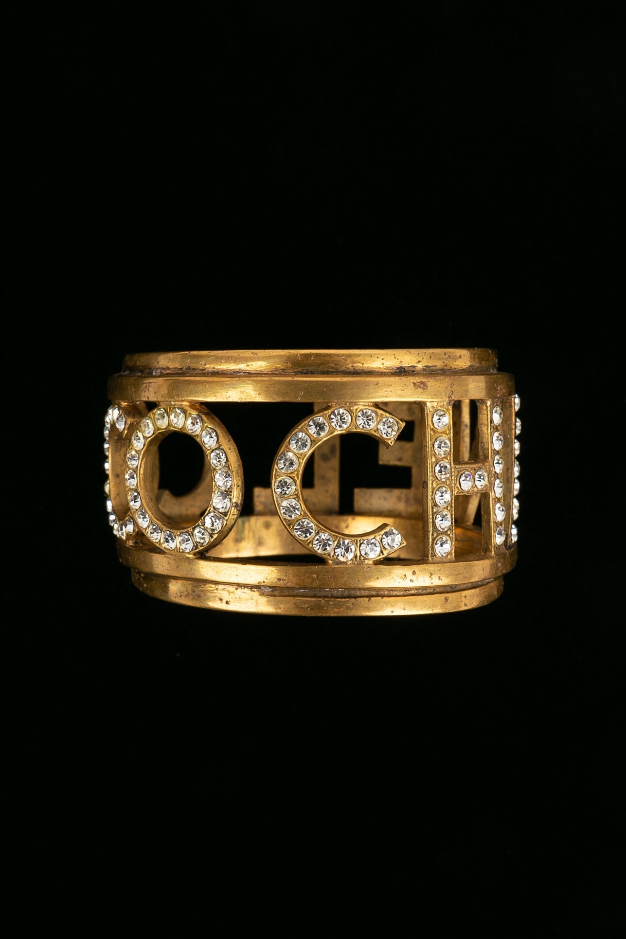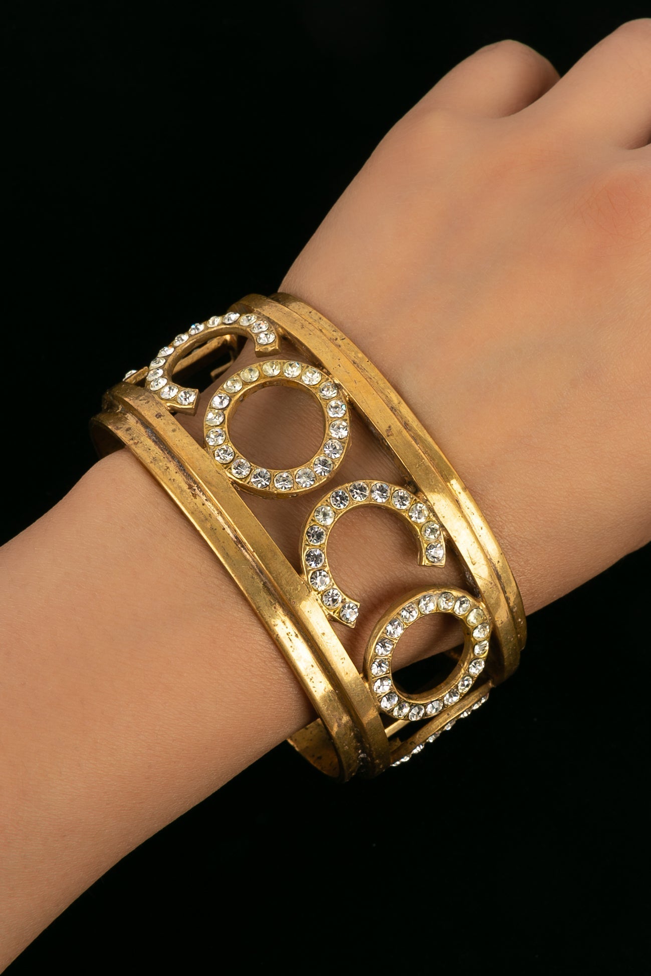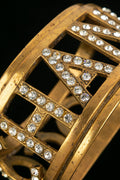 CHANEL -Bracelet manchette en m�tal dor� pav� de strass. Bijou de d�fil�, non sign�. Pr�sence d'oxydation sur le m�tal.