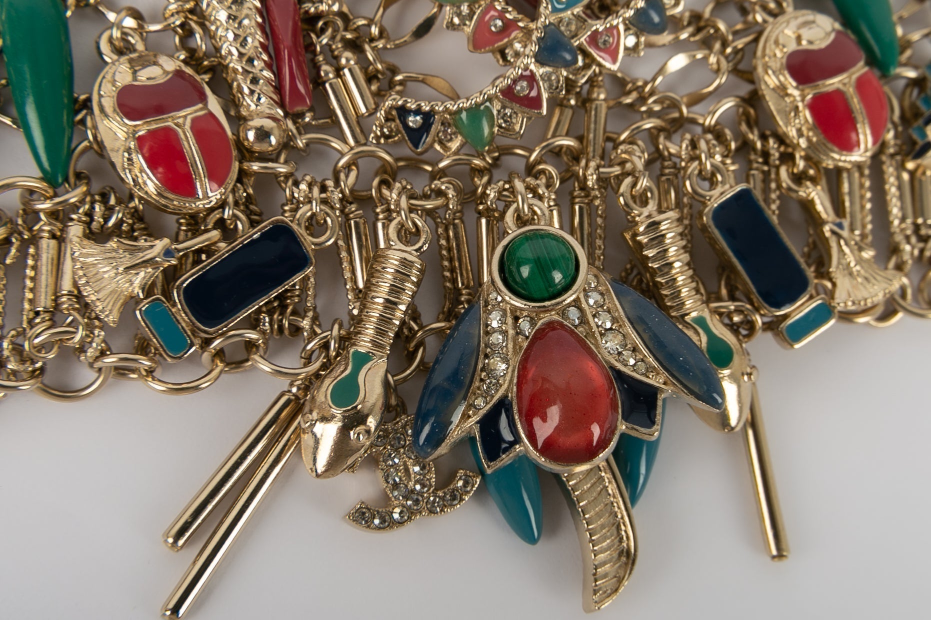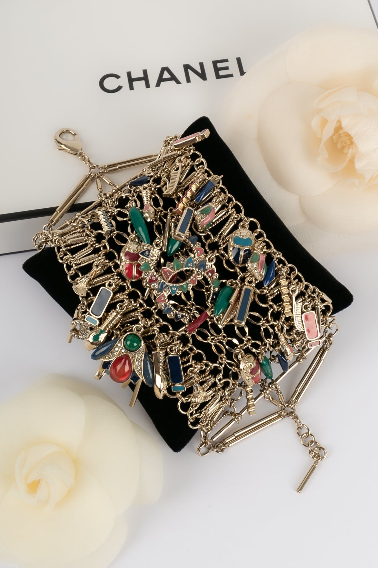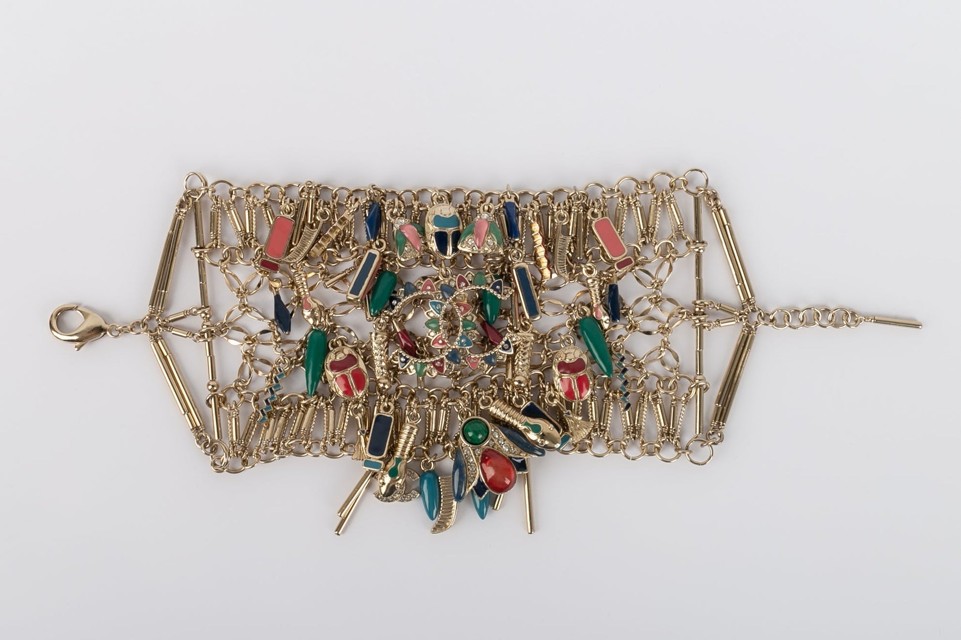 CHANEL - Bracelet en m�tal champagne et breloque en r�sine multicolore. Bijou de d�fil�, non sign�.