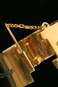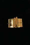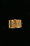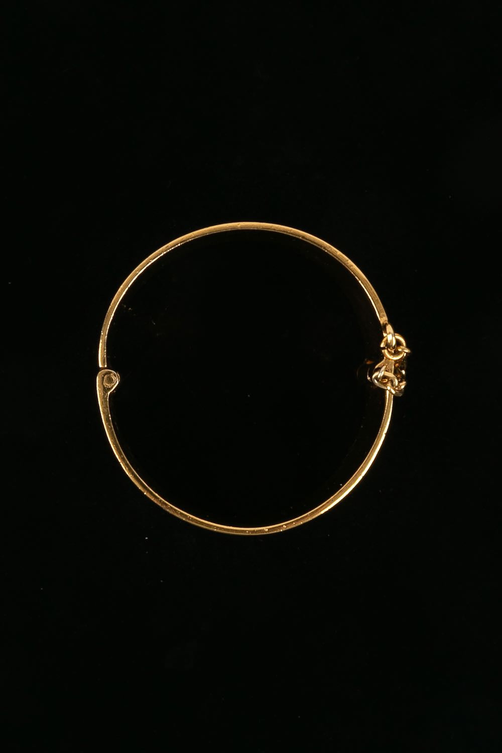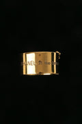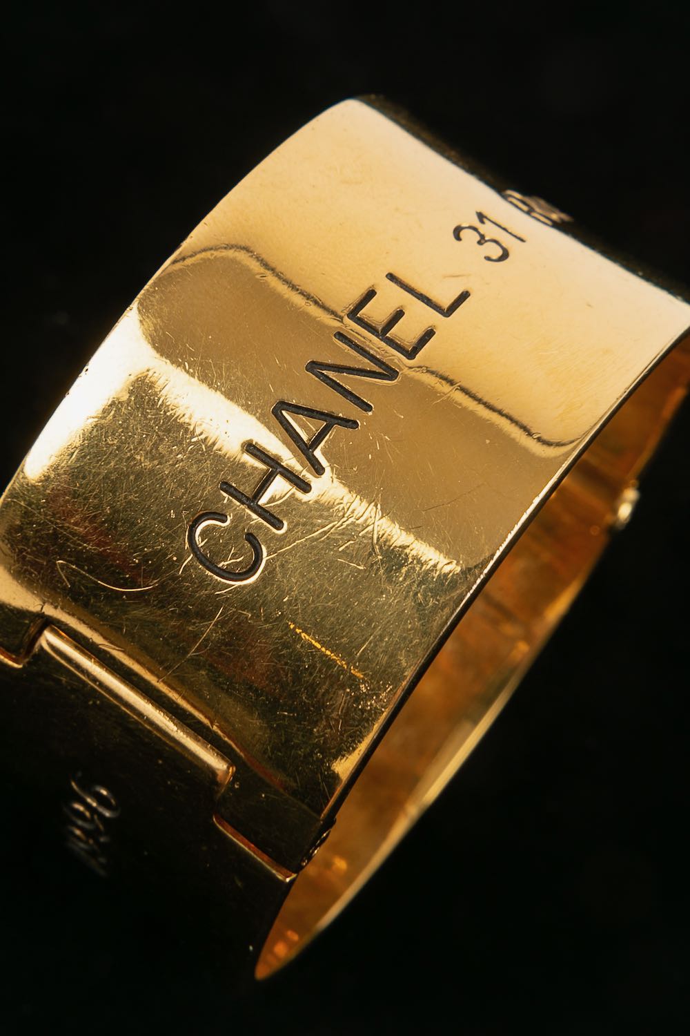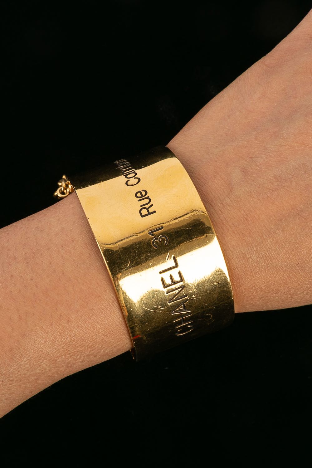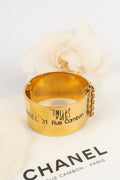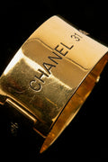 CHANEL - Bracelet manchette en m�tal dor� grav�. Bijou non sign�. Pr�sence de rayures sur le m�tal.