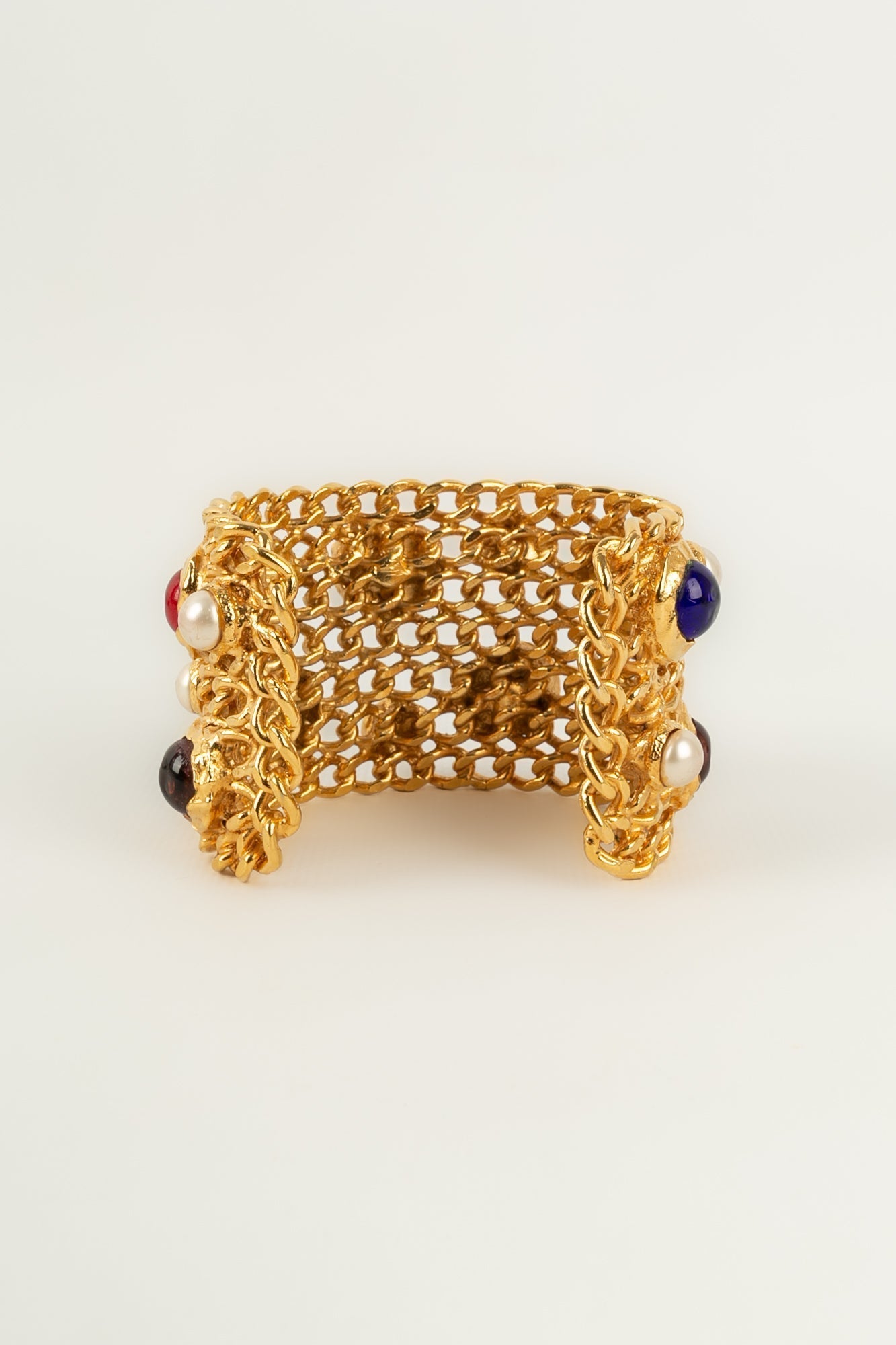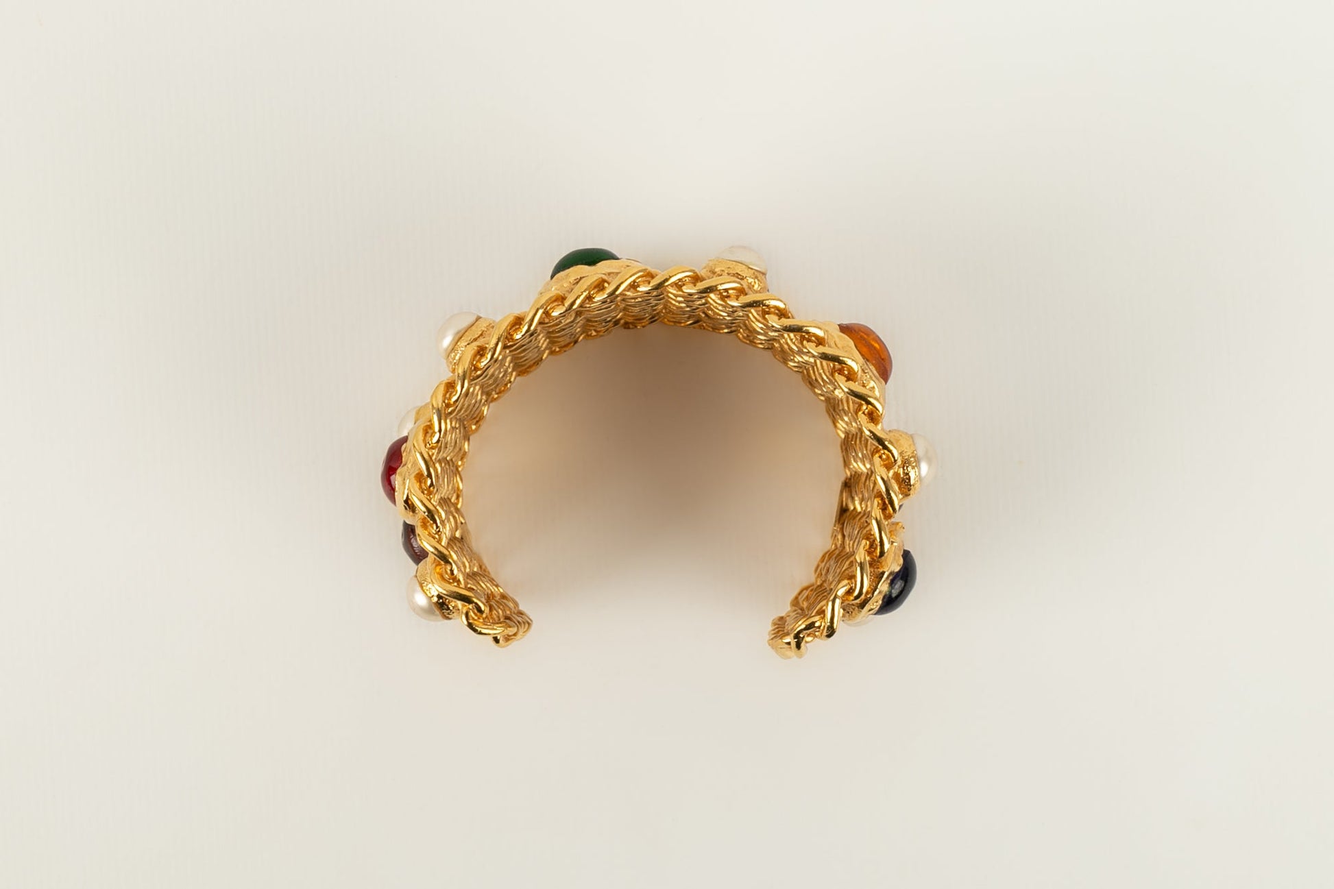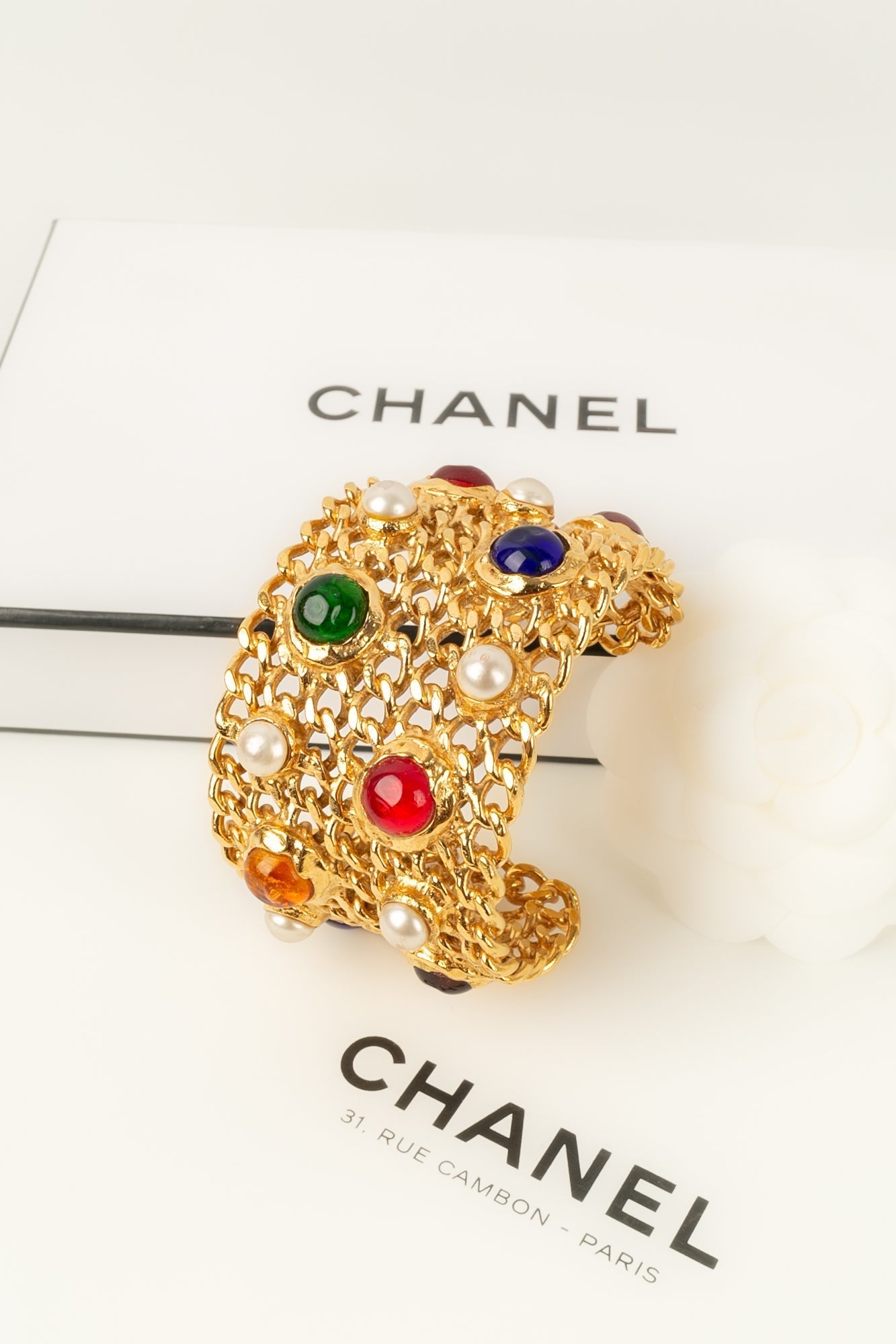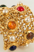 CHANEL - Bracelet manchette en m�tal dor� pav� de cabochons en p�te de verre et nacre.