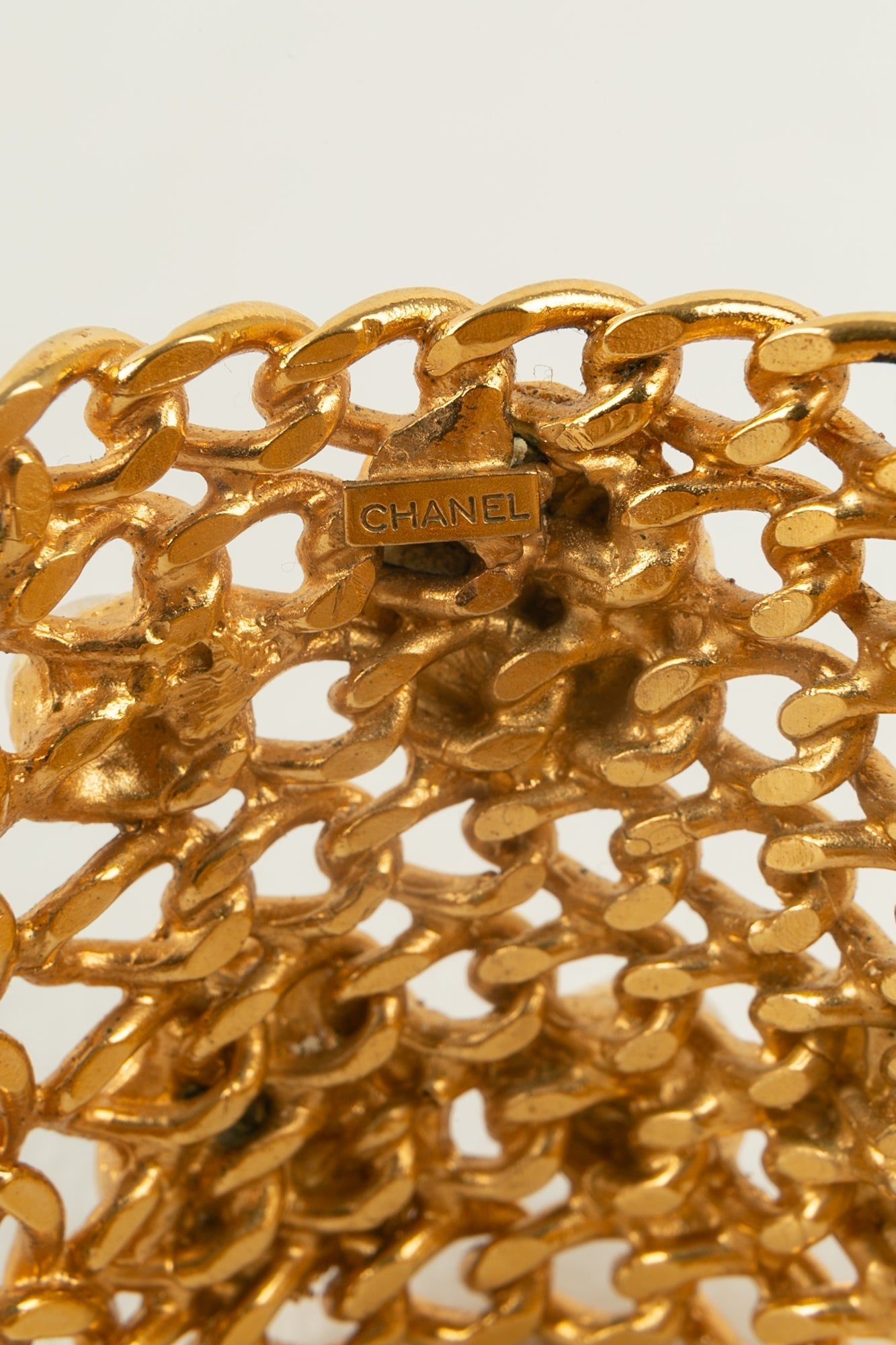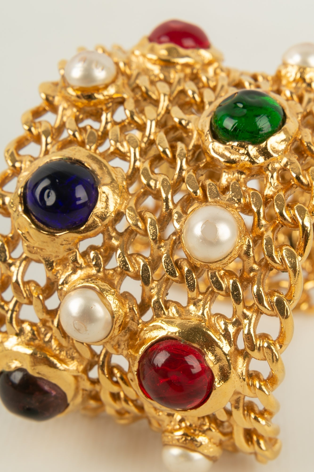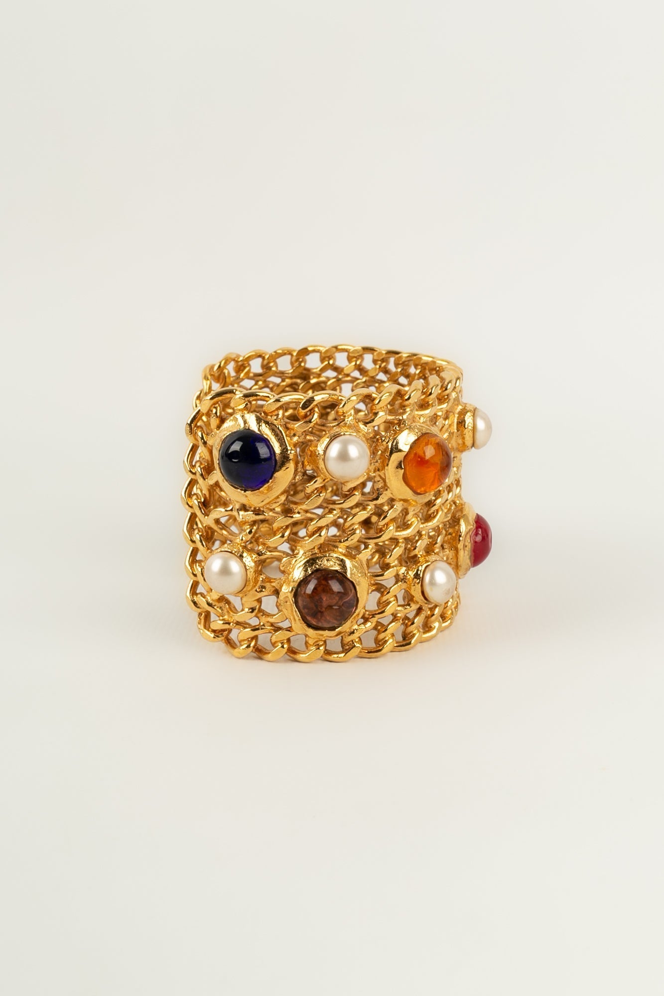 CHANEL - Bracelet manchette en m�tal dor� pav� de cabochons en p�te de verre et nacre.